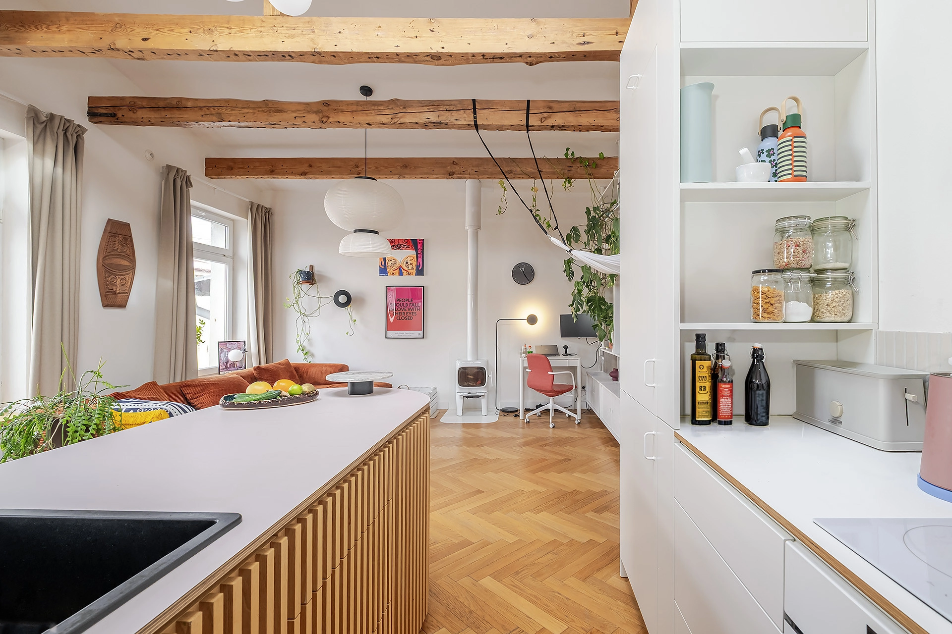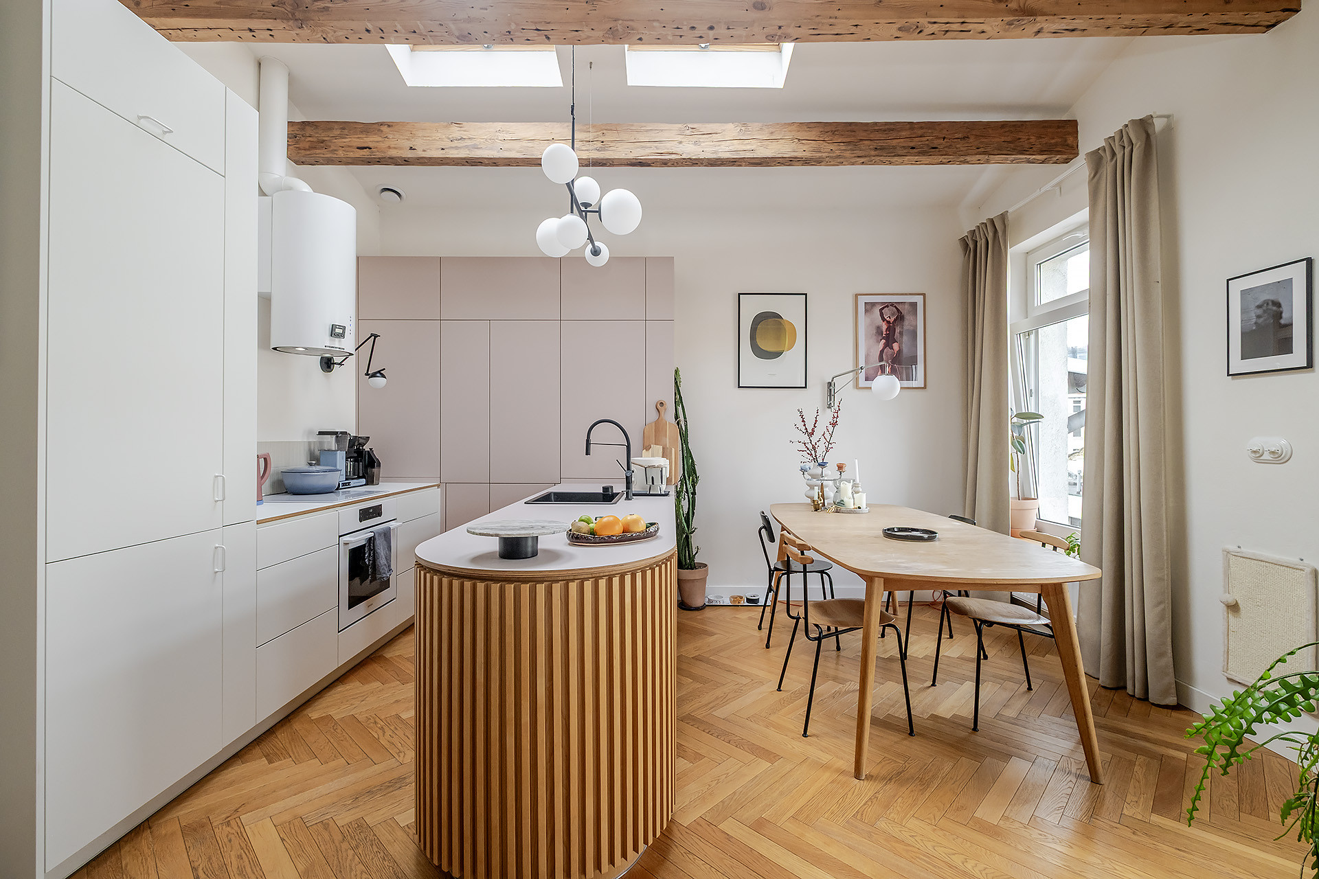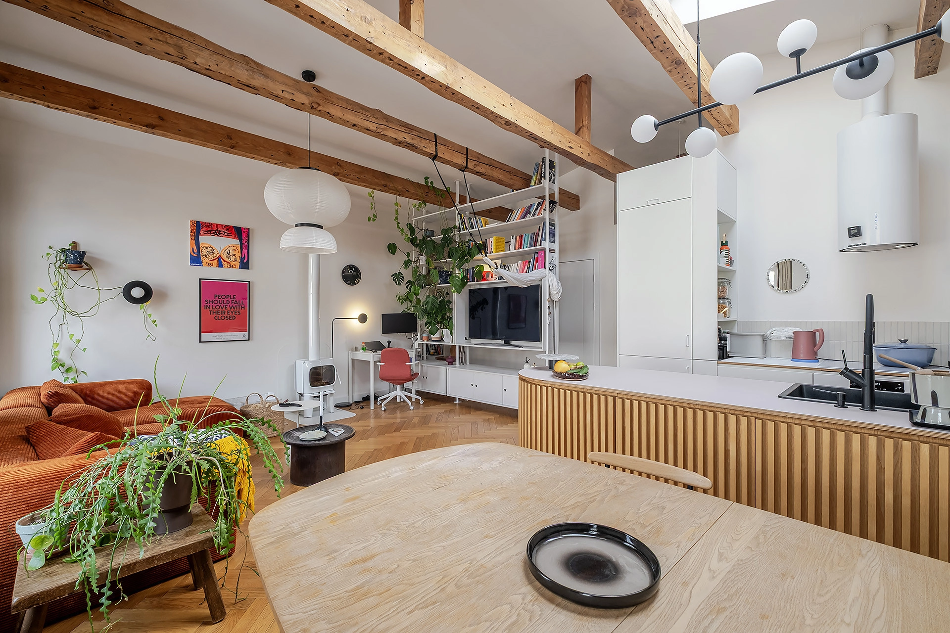 Niezwykłym atutem tego mieszkania jest jego zróżnicowana wysokość, doskonałe naświetlenie i niewątpliwie standard wykończenia. W przestrzeni dziennej mamy również możliwość korzystania z nowoczesnego i bardzo wydajnego kominka JOTUL.
