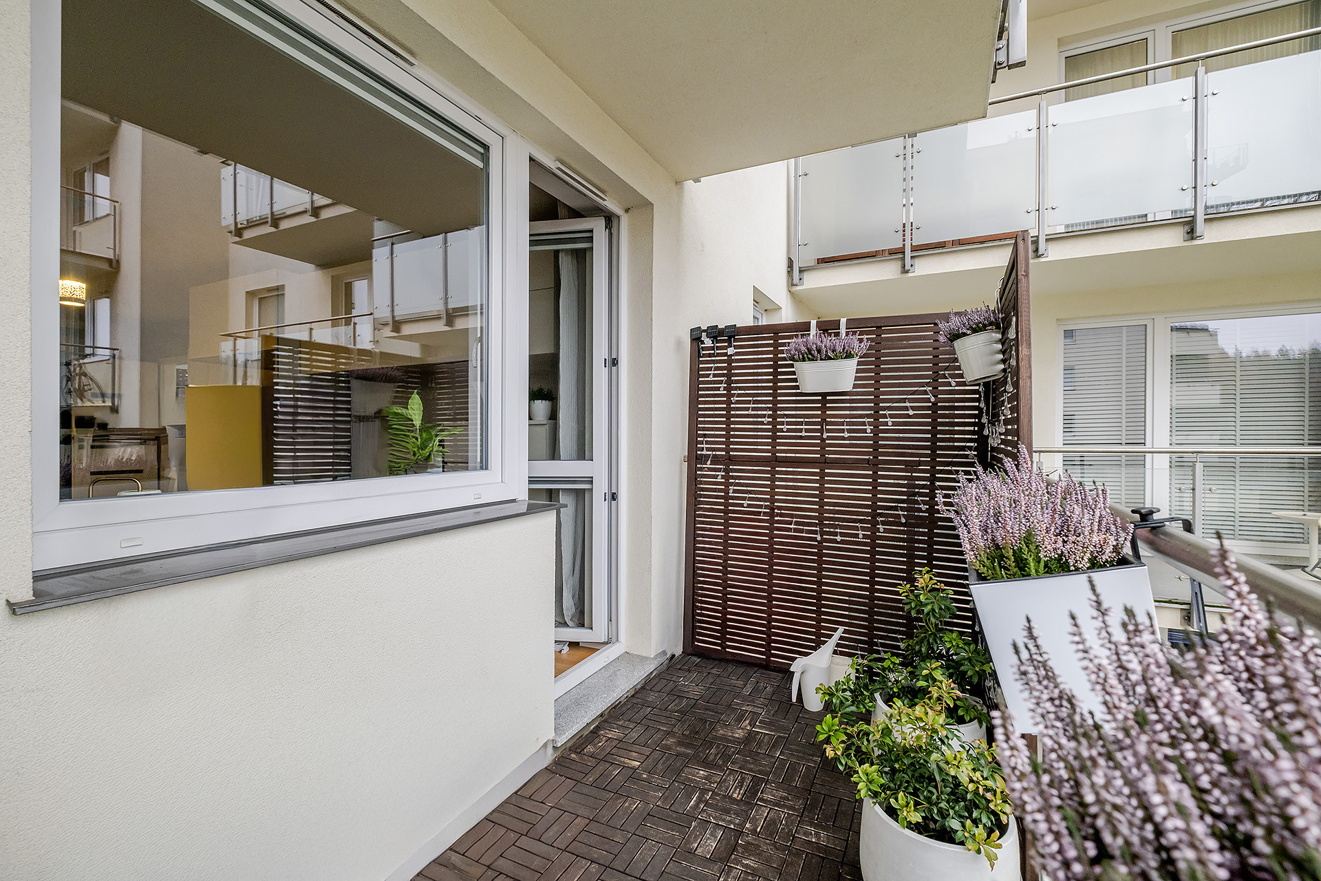 Z salonu wyjście na duży balkon z ładnym widokiem. Łazienka z przysznicem wykończona w glazurze i terakocie. Drewniane podłogi, ściany malowane.
