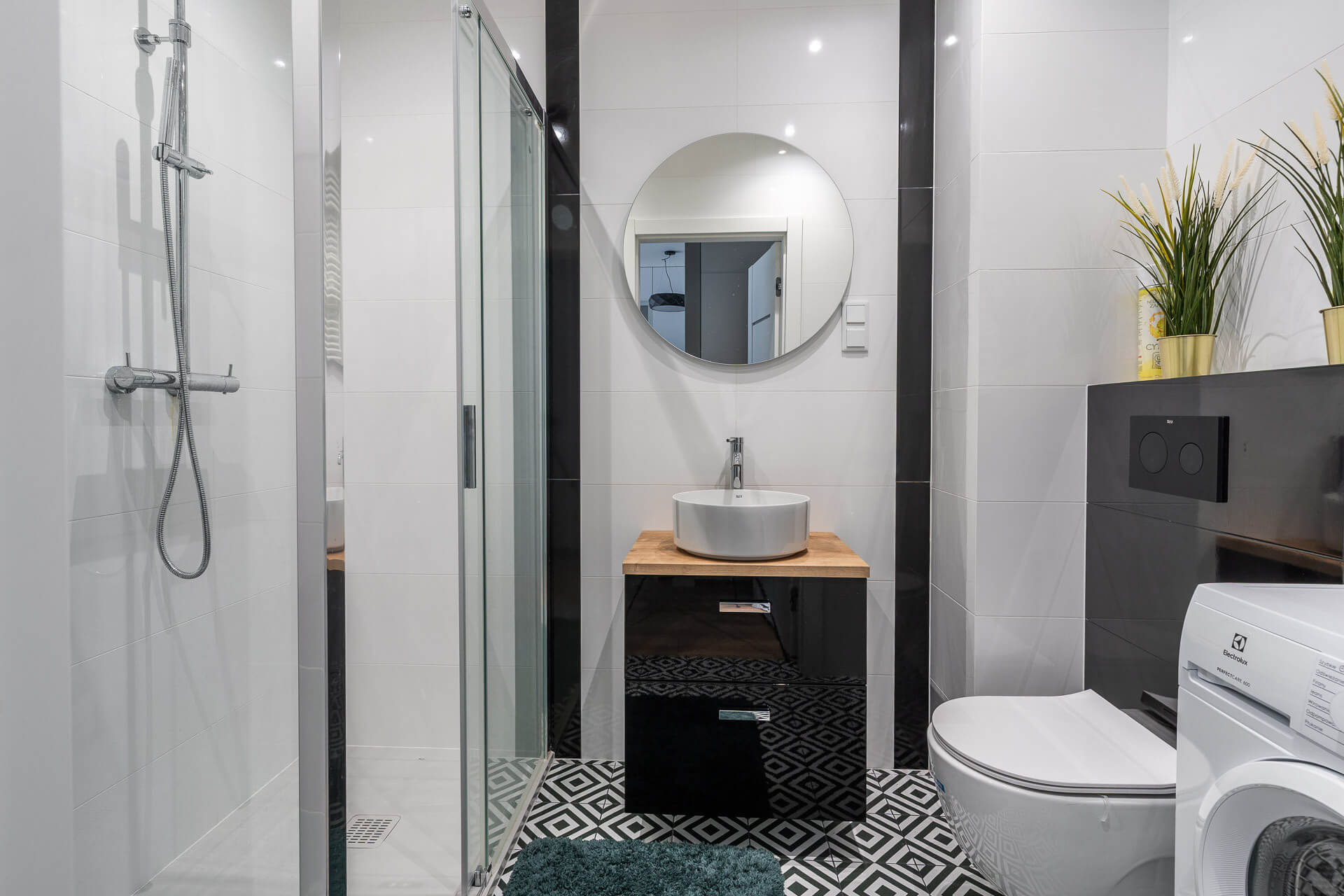 – łazienka razem w wc- wyposażona w kabinę prysznicową.