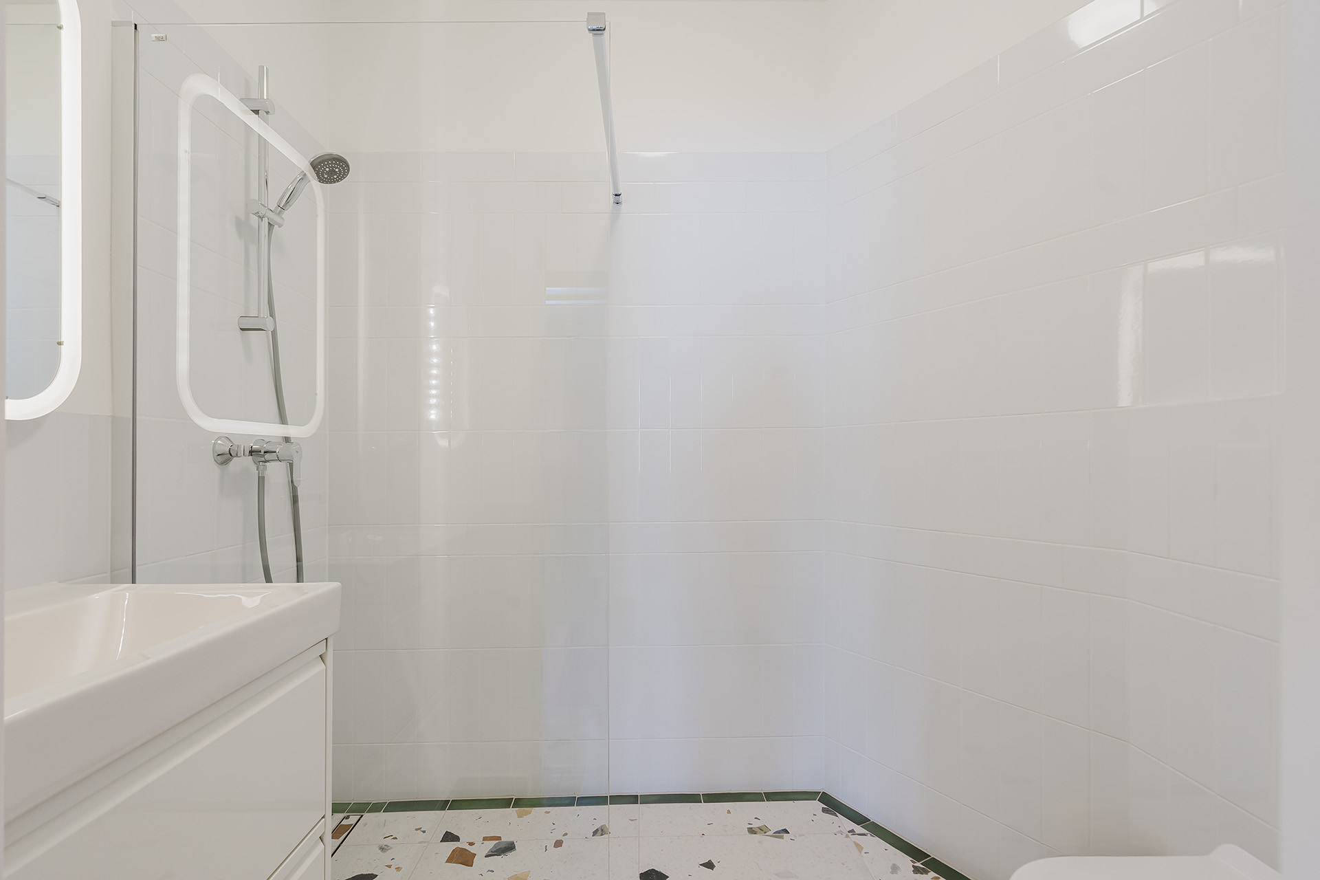 łazienka z toaletą i kabiną prysznicową.