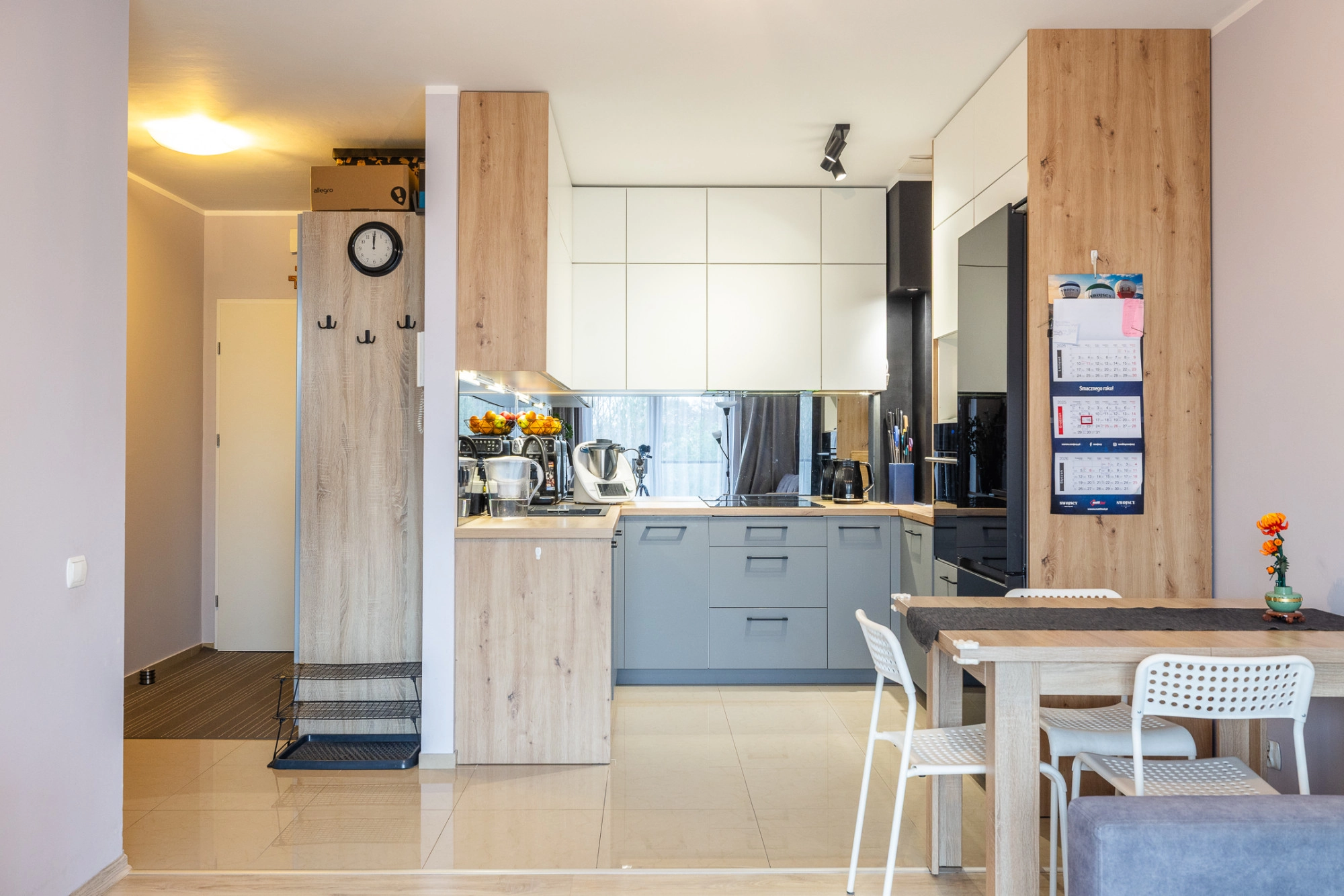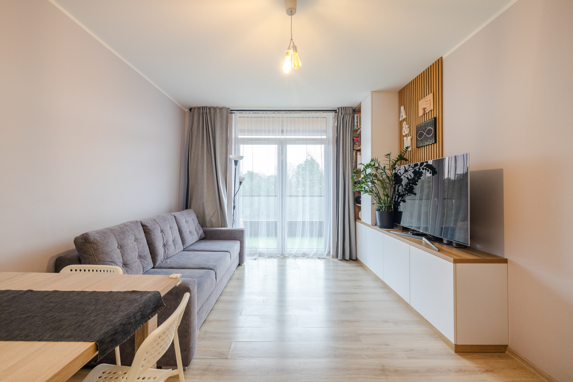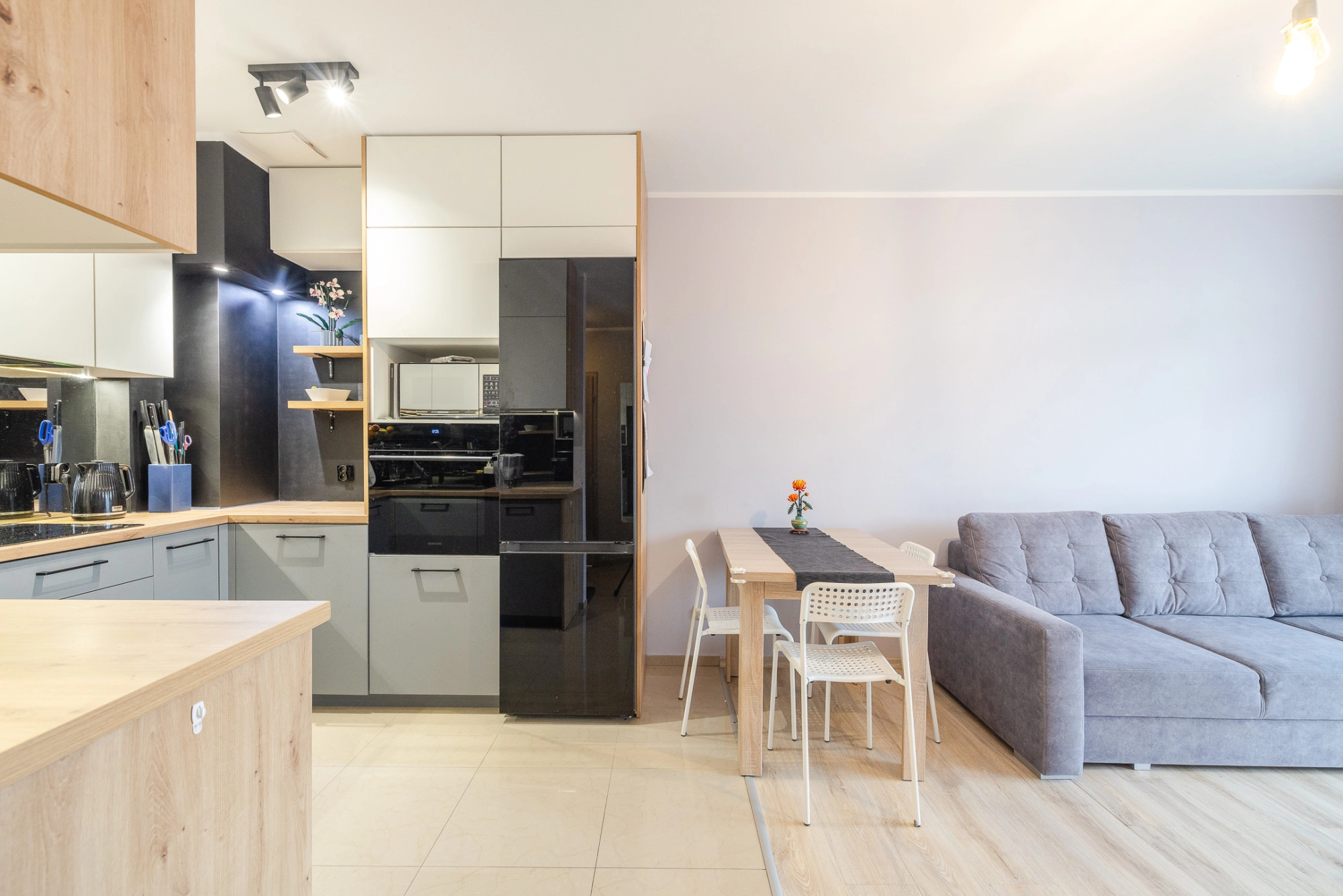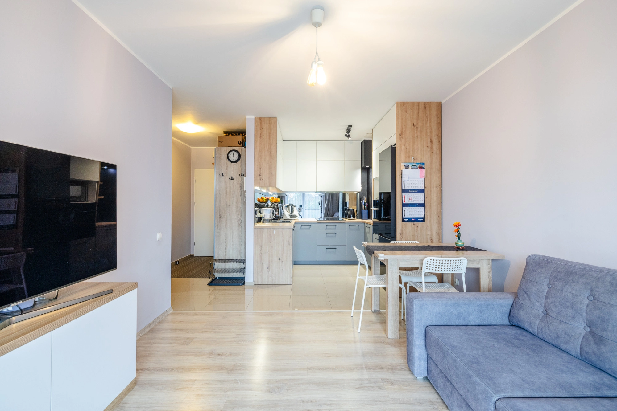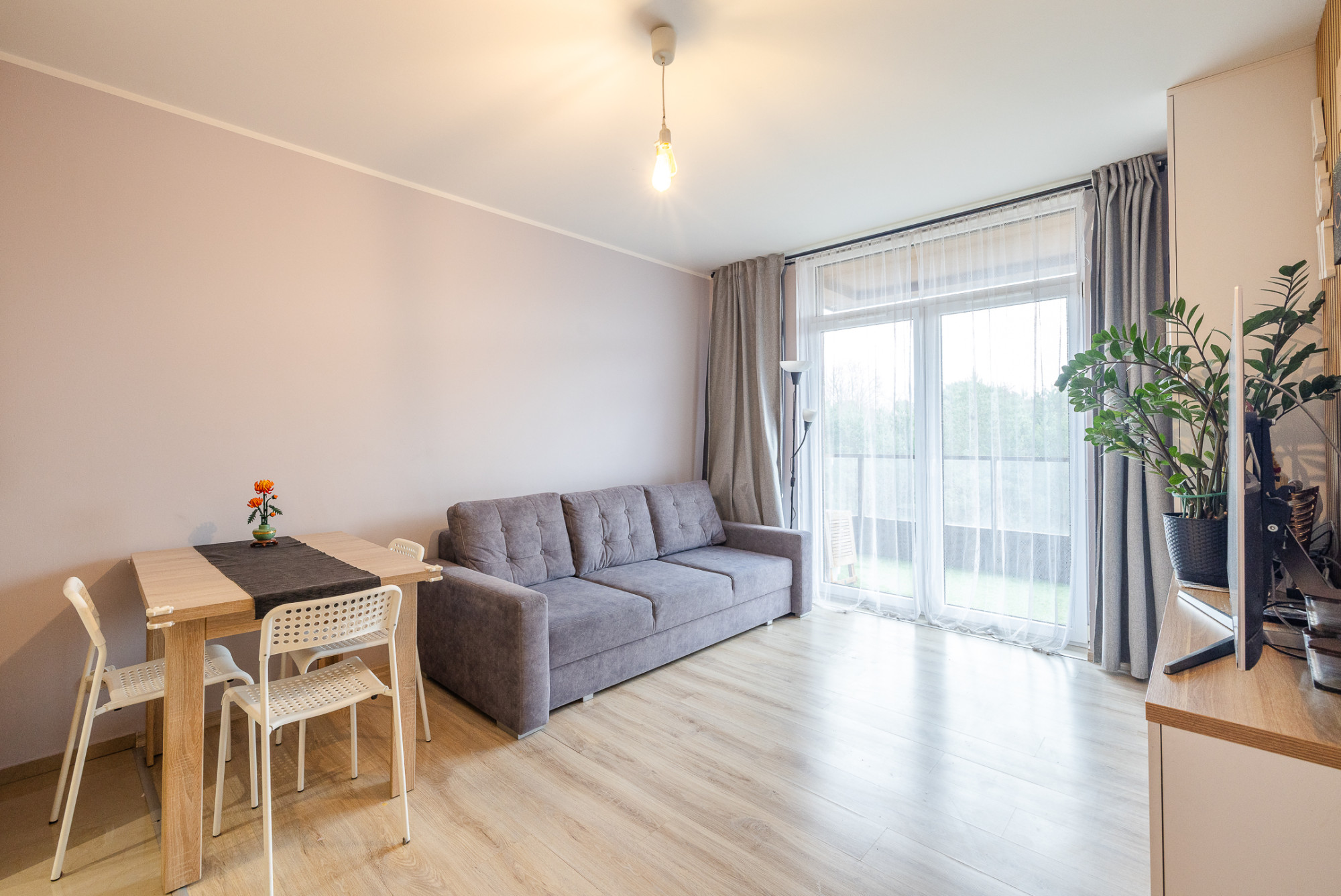 – pokój dzienny z aneksem kuchennym oraz wyjściem na balkon; aneks z meblami w zabudowie i sprzętem AGD