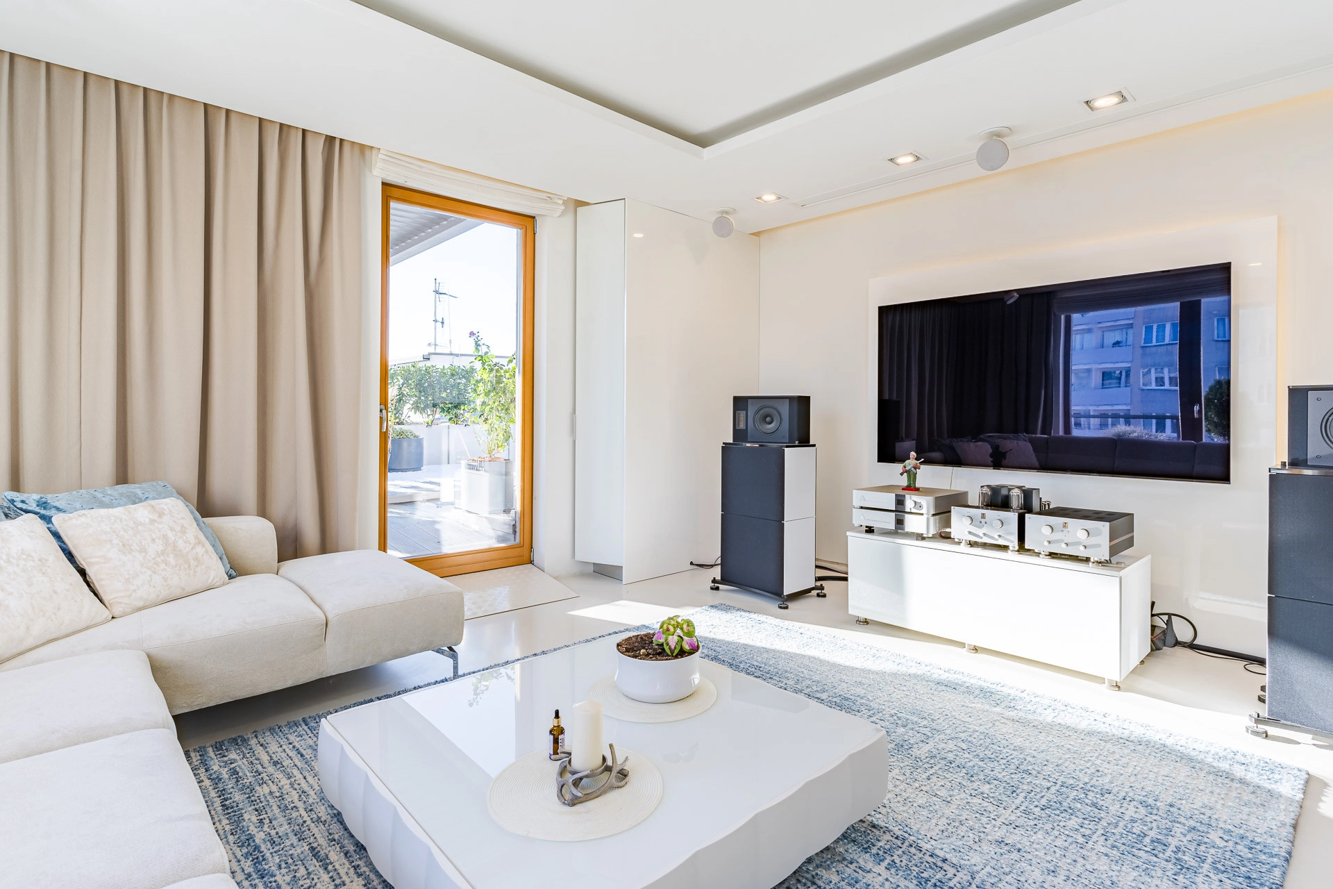 Uwagę przykuwają stylowe meble znanych włoskich marek. Na tarasie znajdują się ekskluzywne meble wypoczynkowe. Taras został wyposażony w nowoczesną pergolę z elektrycznym dachem i roletami, które można dostosować do indywidualnych potrzeb, zapewniając prywatność oraz ochronę przed słońcem czy deszczem. Doskonała przestrzeń do relaksu na świeżym powietrzu lub organizacji spotkań z bliskimi w komfortowych warunkach.