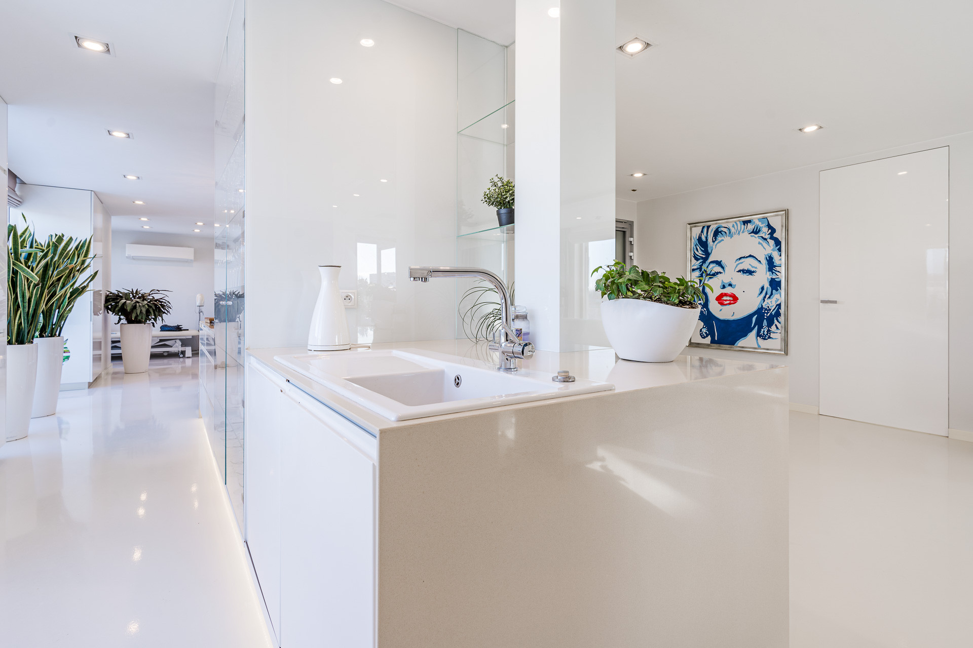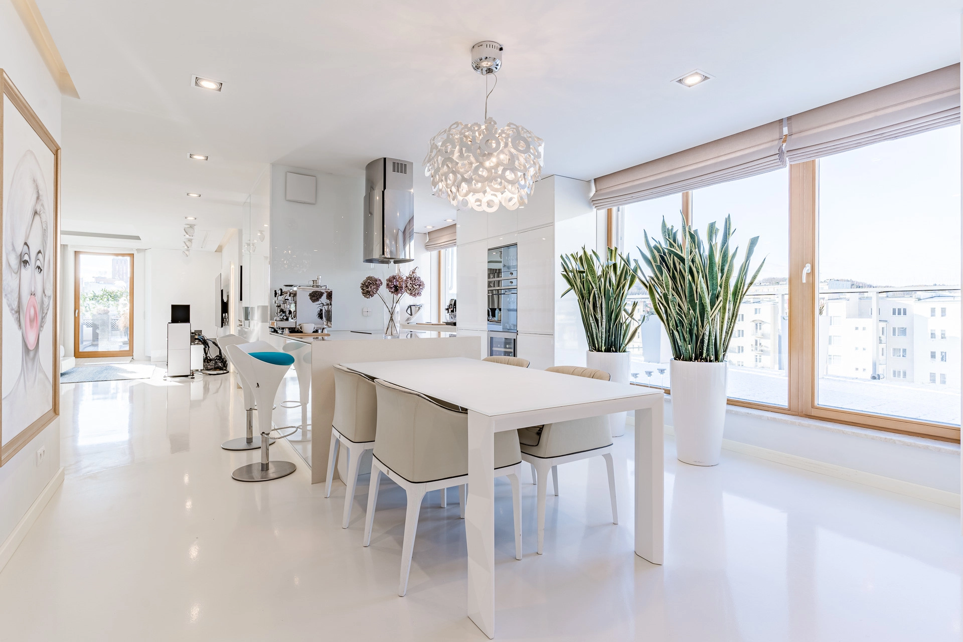 – salon: centralna część mieszkania z elegancką częścią jadalniano-kuchenną. Nowoczesna kuchnia z wyspą tworzy funkcjonalne serce domu. Strefa dzienna wyposażona w stylowy, duży narożnik, stolik kawowy i szafkę RTV. Bezpośrednie wyjście na wyjątkowy taras, który otacza całe mieszkanie, oferując piękne widoki z ekspozycją na południe i zachód.