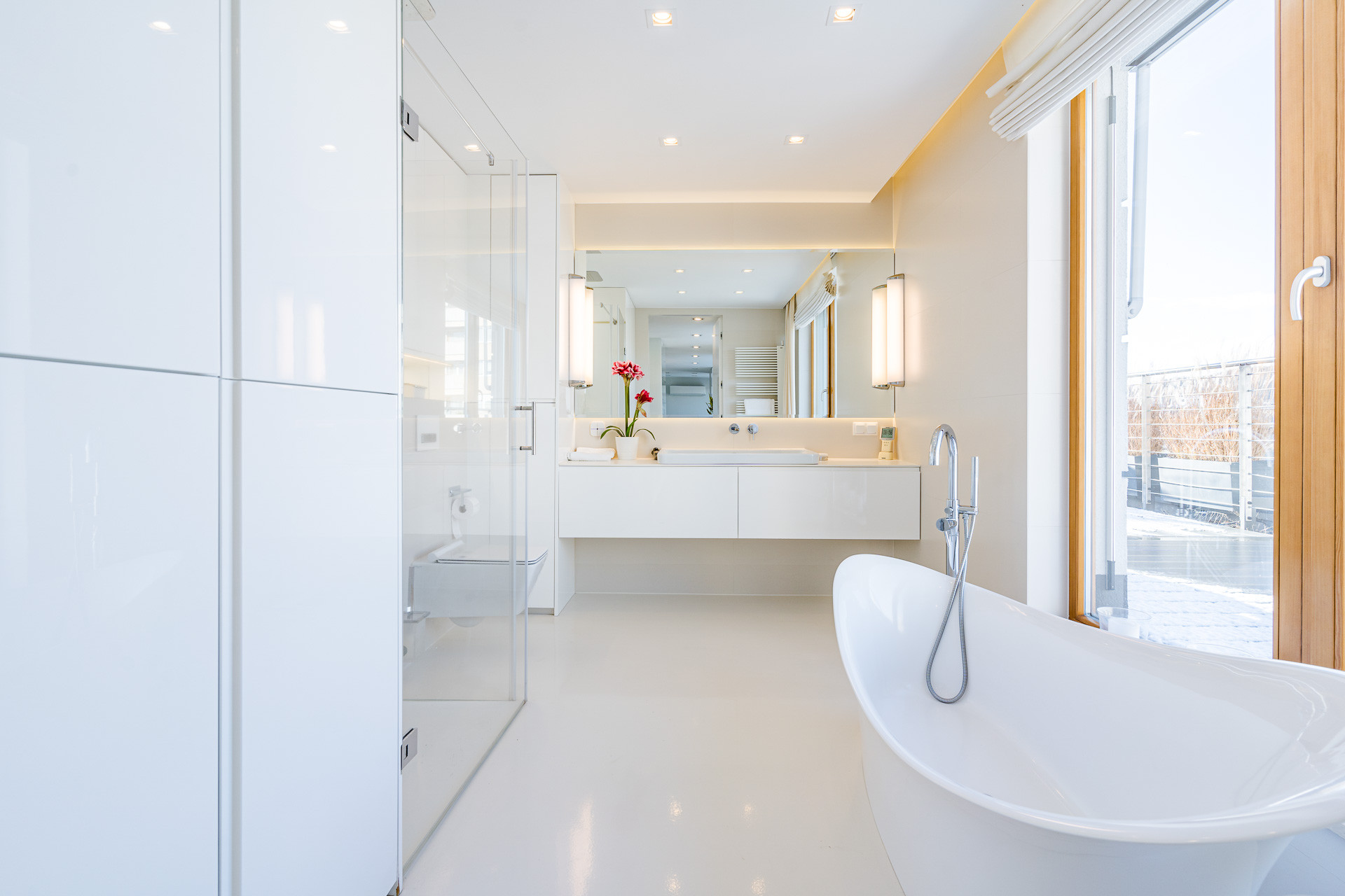– salonik kąpielowy: elegancka łazienka wyposażona zarówno w wannę, jak i prysznic. Bezpośrednie wyjście na taras dodaje wyjątkowego charakteru tej przestrzeni.