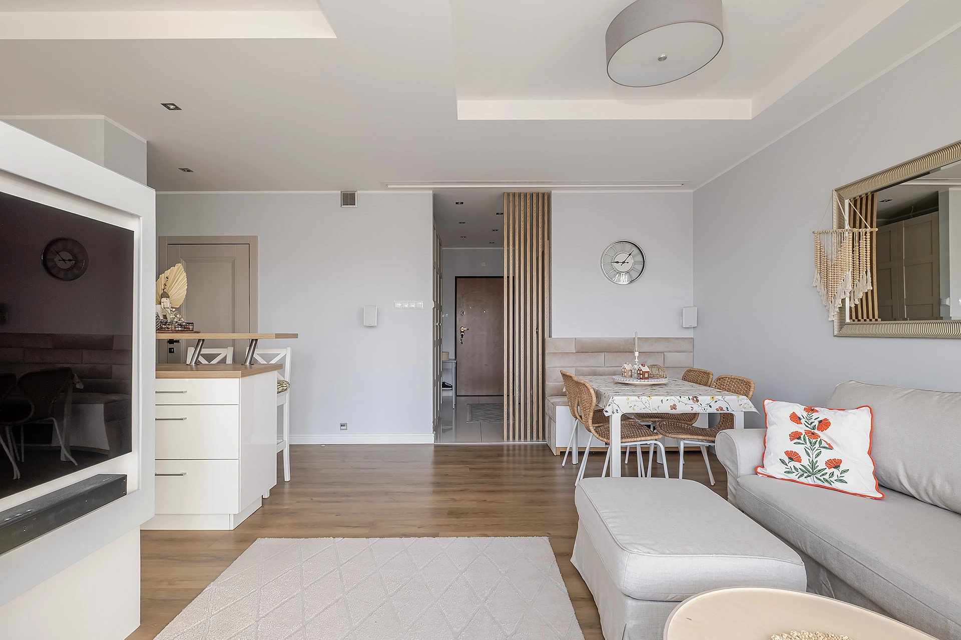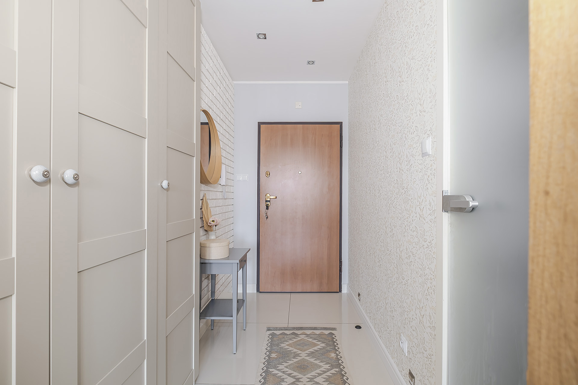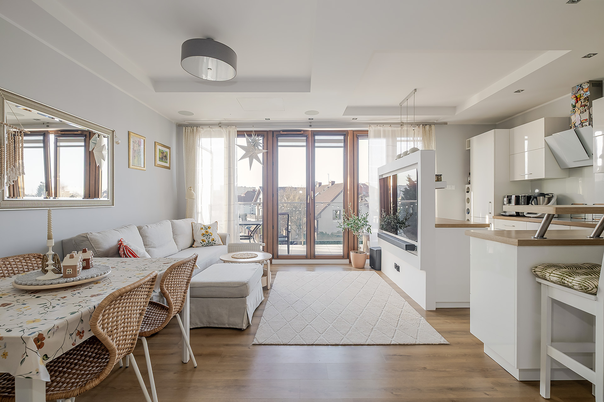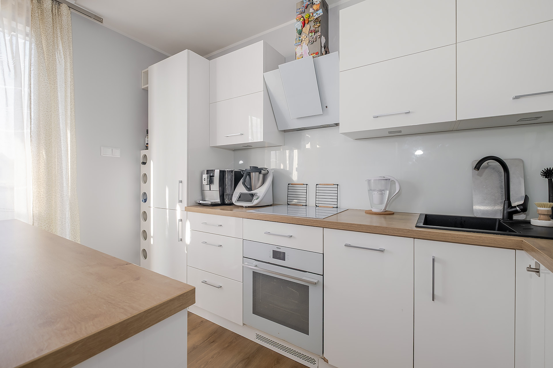 Aneks kuchenny został wyposażony w meble wykonane na wymiar oraz pełne AGD. Ogrzewanie pochodzi z sieci miejskiej. Stolarka okienna PCV. Wyposażenie mieszkania pozostaje do uzgodnienia.