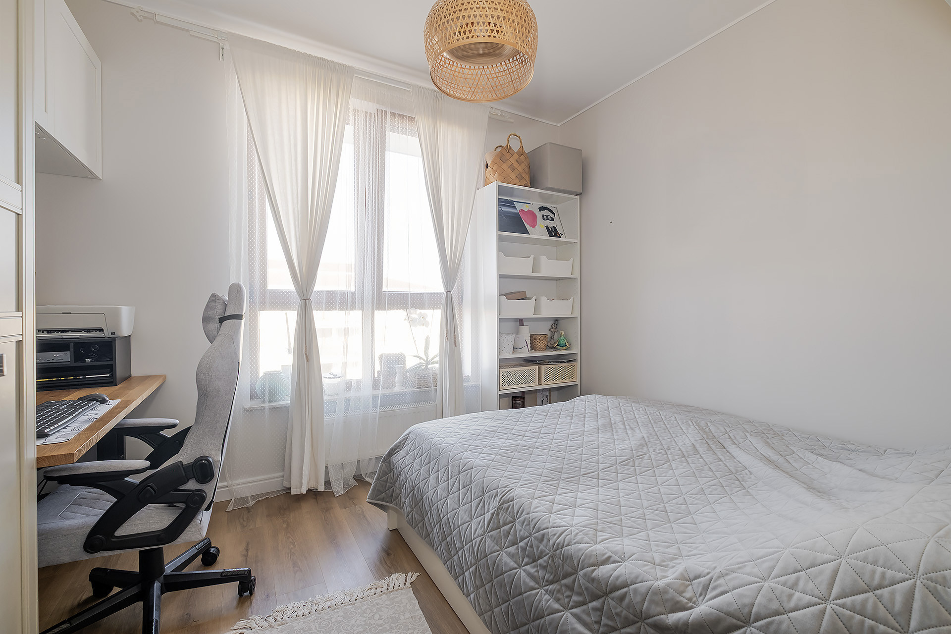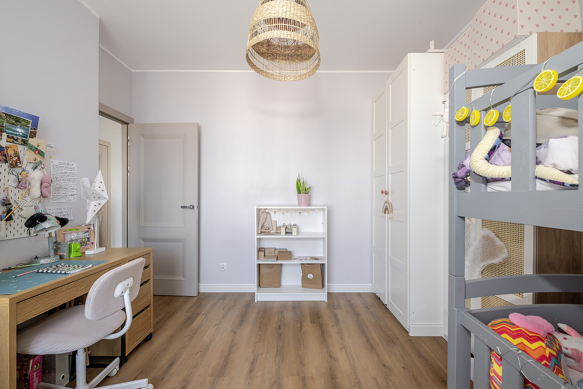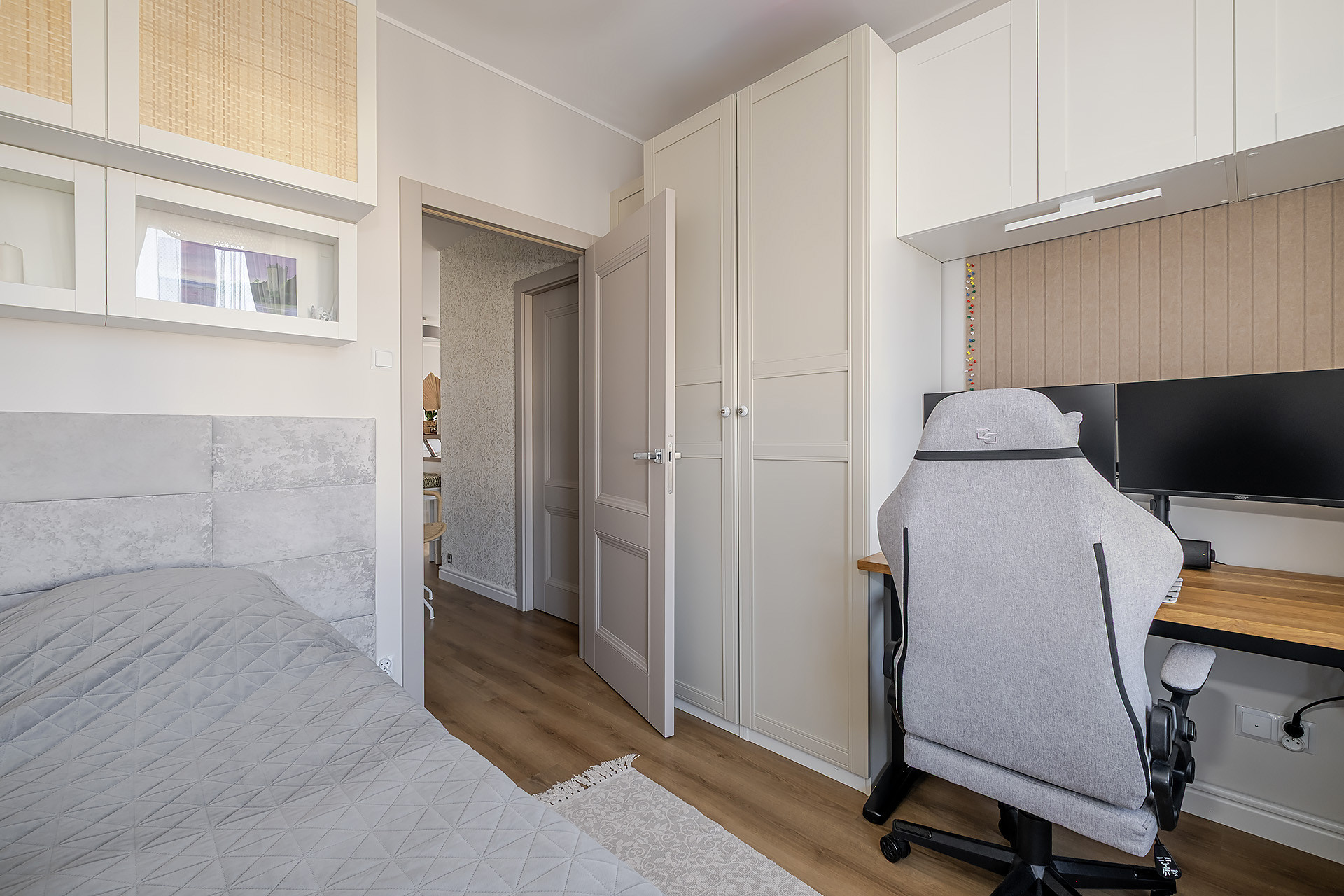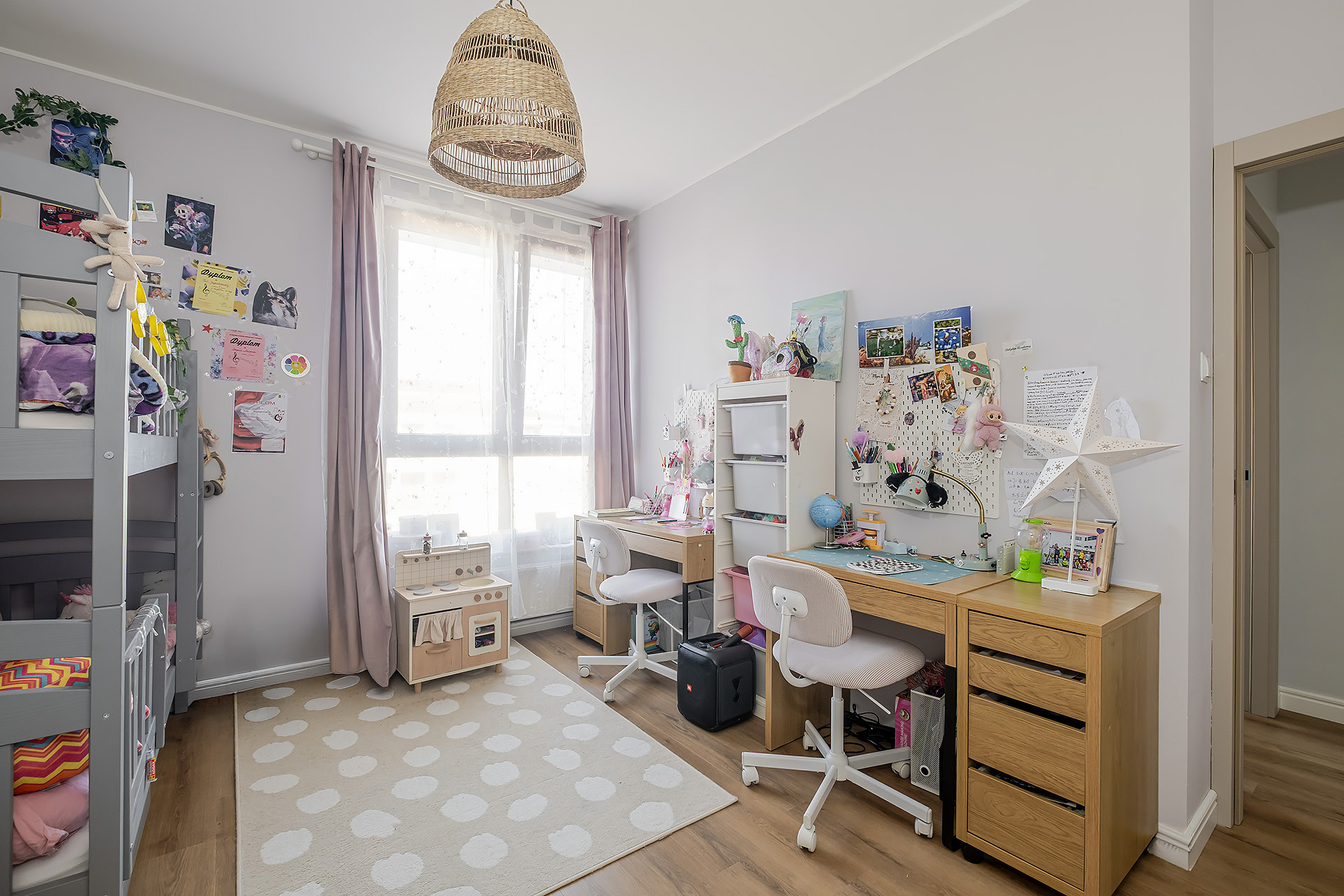 W skład mieszkania wchodzą salon z aneksem kuchennym, dwie niezależne sypialnie, łazienka z WC, pomieszczenie gospodarcze oraz przestronny korytarz.