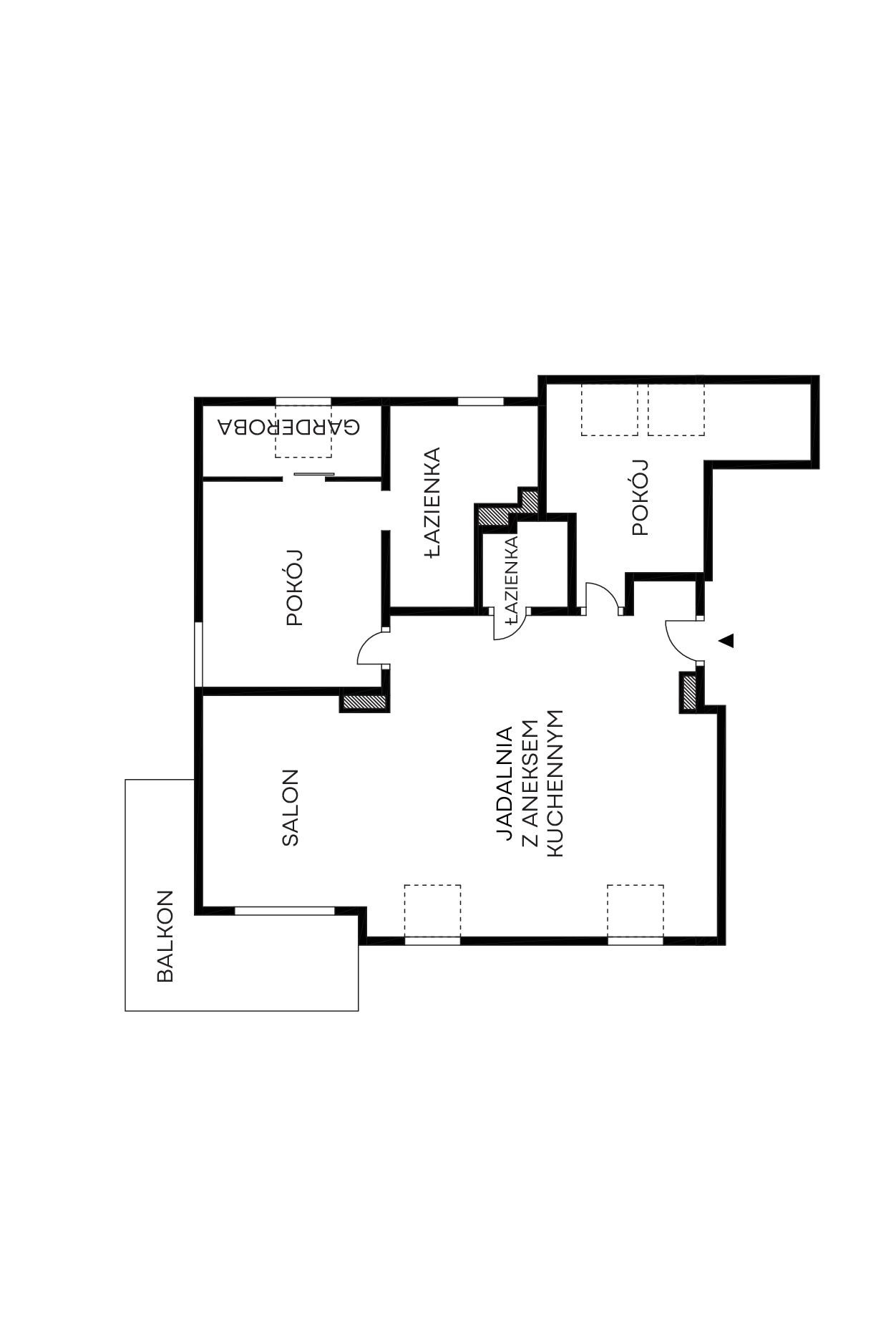 – salon z aneksem kuchennym oraz wyjściem na balkon (10,70 m2);