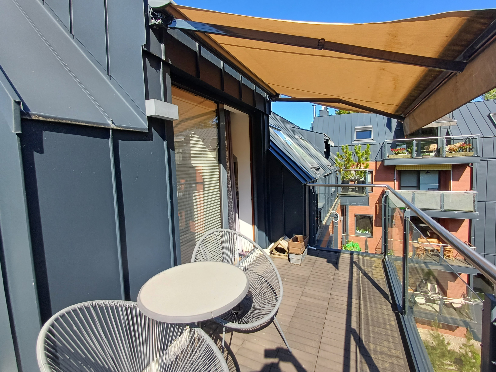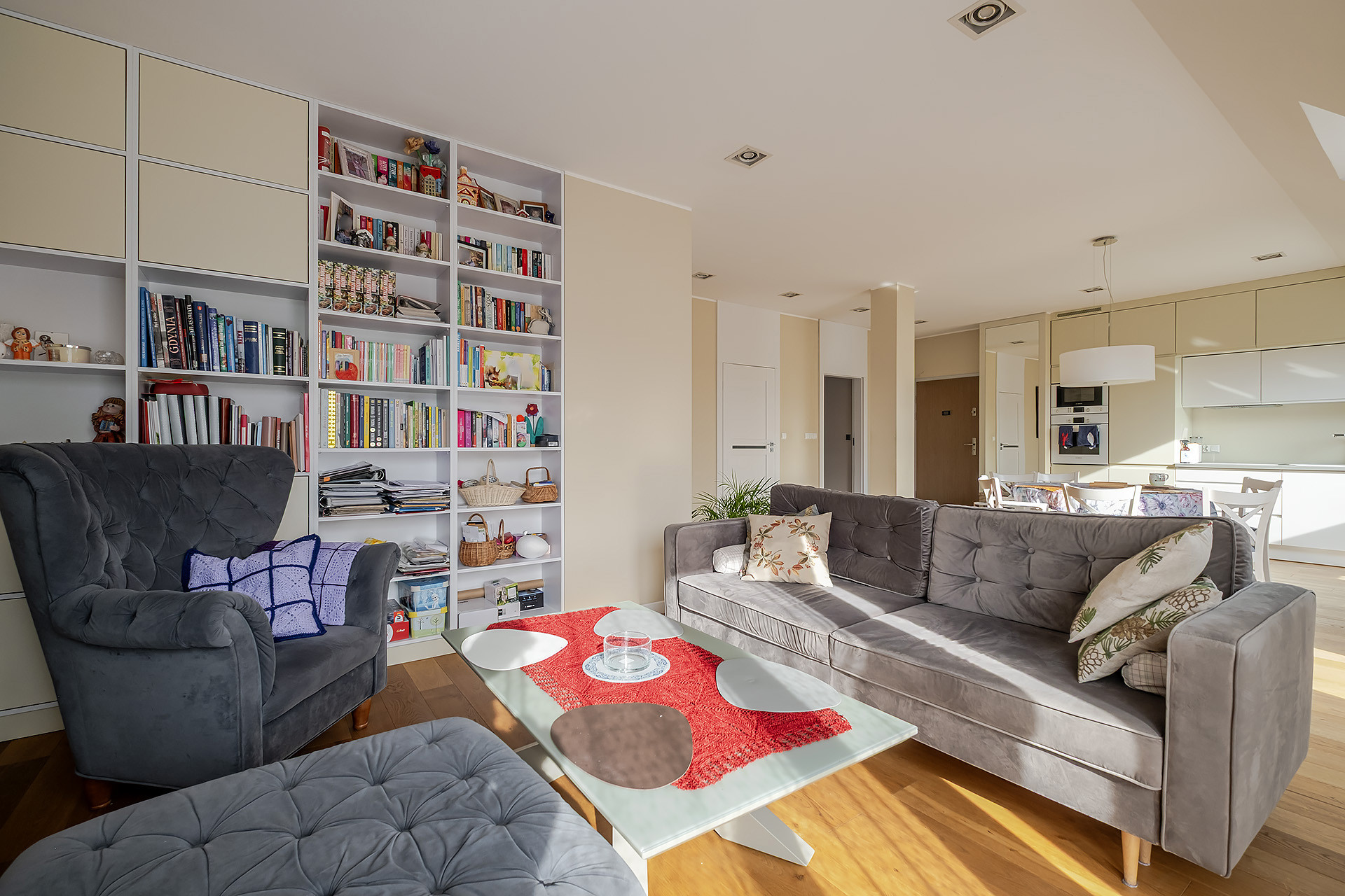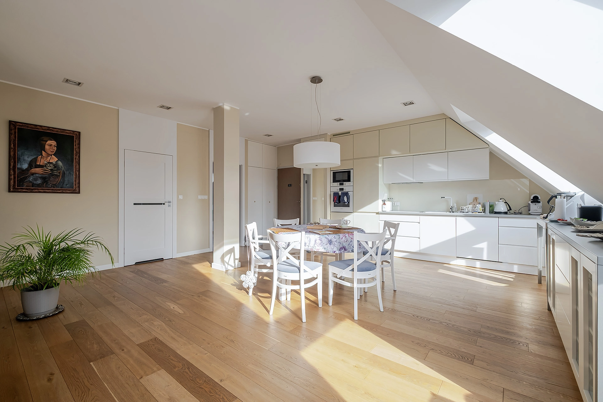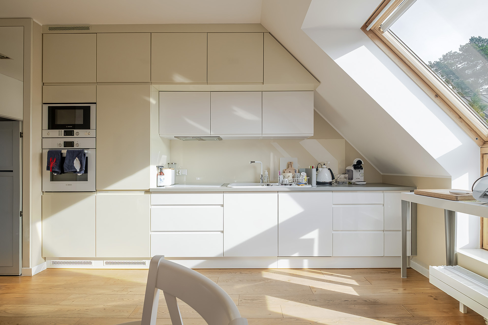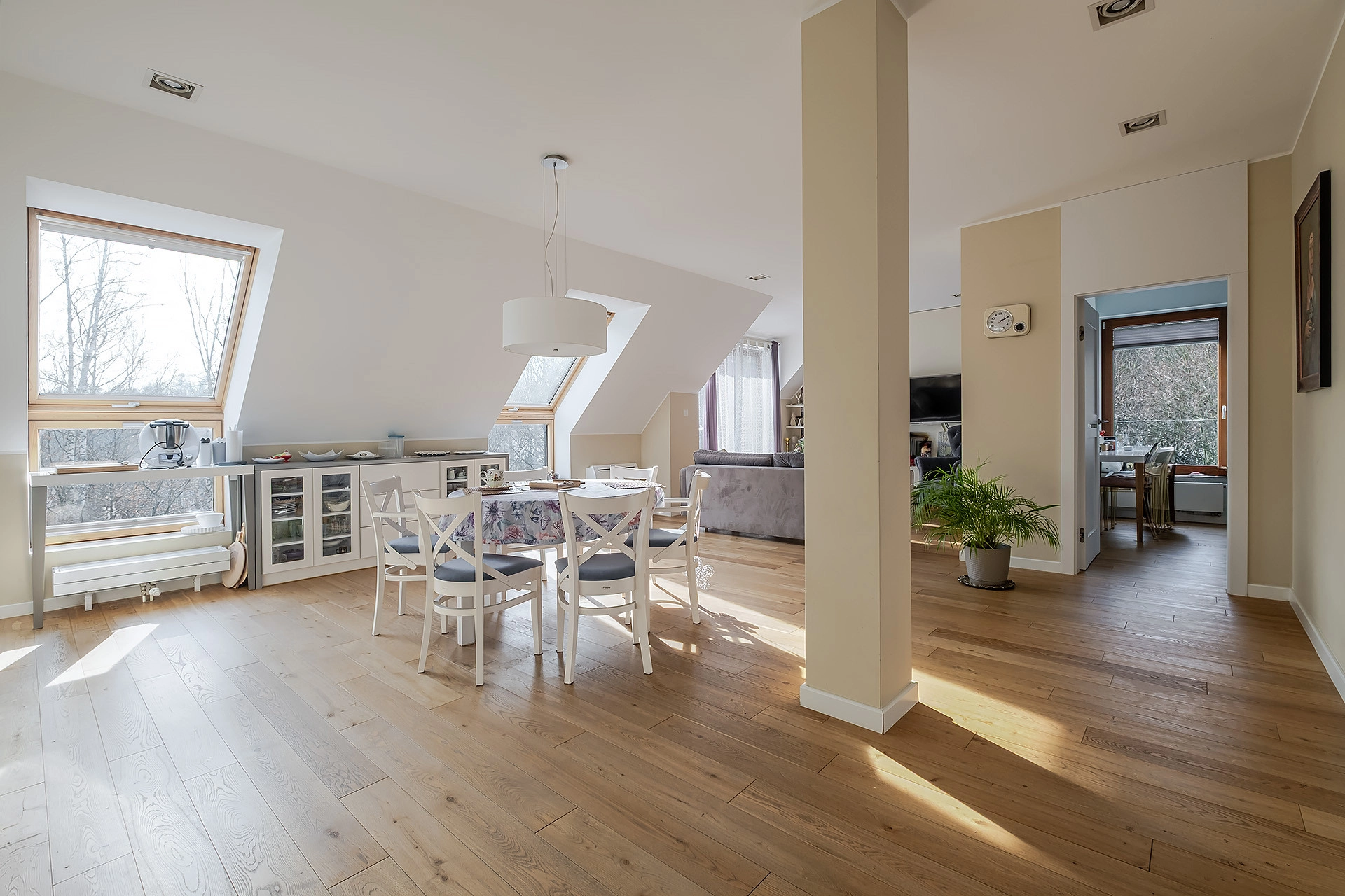 Od pierwszego kroku wita przestronność. Salon jest podzielony na wygodną strefę wypoczynkową oraz jadalnianą. Nieruchomość wyróżnia się doskonałym doświetleniem dzięki południowej ekspozycji okien salonu, wychodzących na las. Duże okna tworzą jasną przestrzeń wprowadzając do wnętrza naturalne światło. Sąsiedztwo jest spokojne i nienachalne, a brak lokali wynajmowanych krótkoterminowo zapewnia ciszę i pełen komfort codziennego życia.