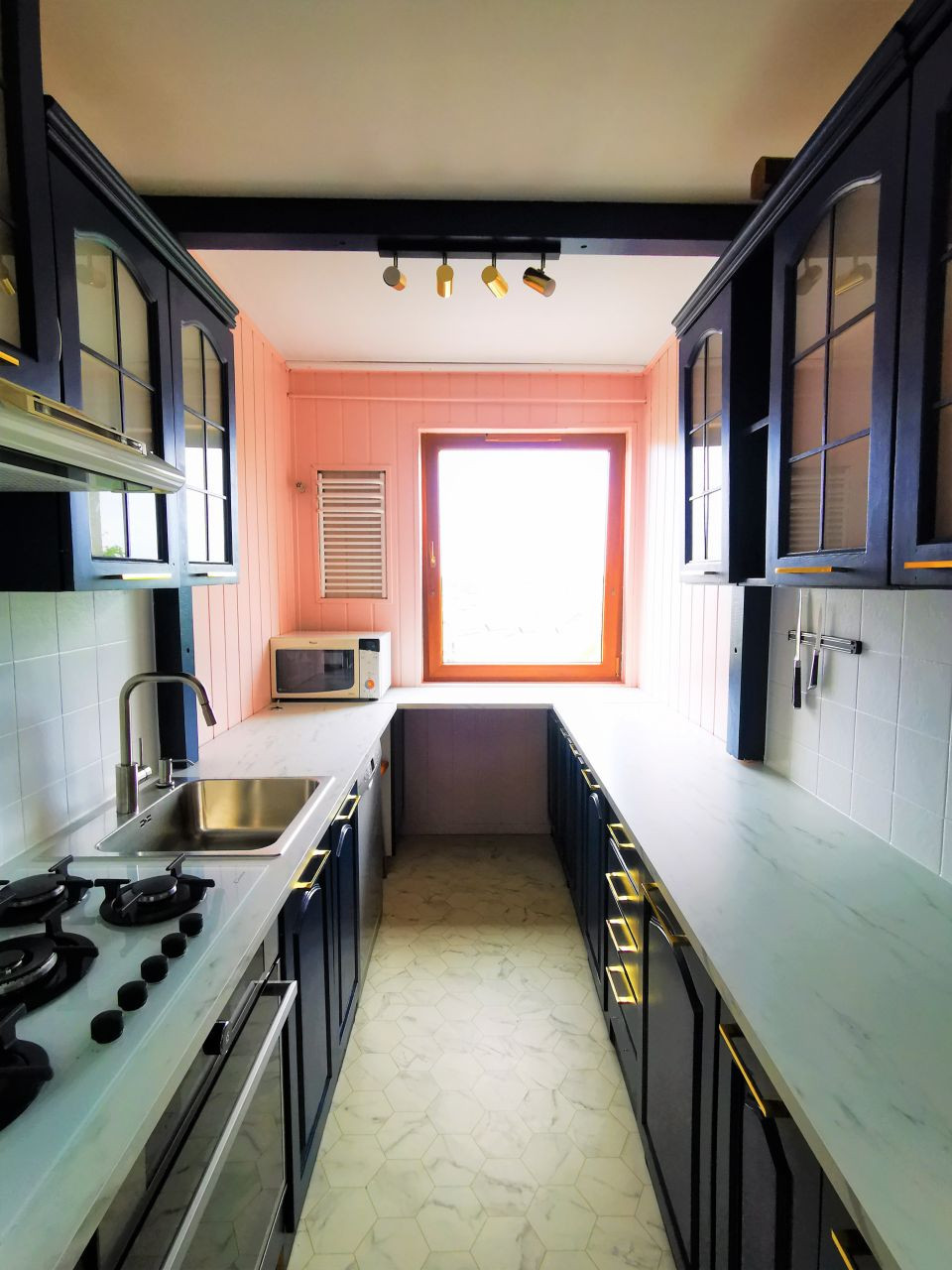 – kuchnia z meblami w zabudowie, wyposażeniem w sprzęt AGD i oknem,
