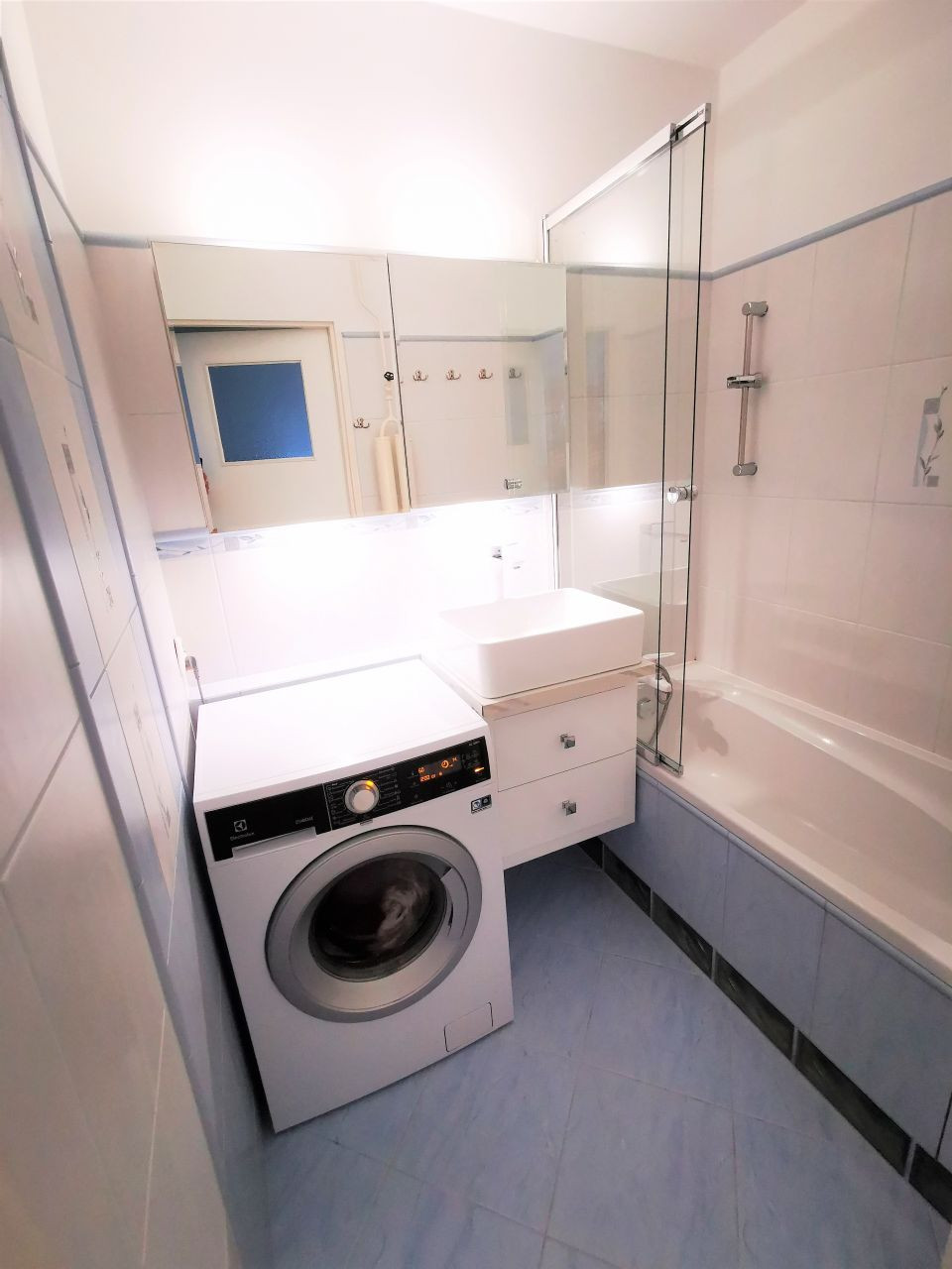 – łazienka z WC, wanną z prysznicem, pralką, umywalką, lustrem,