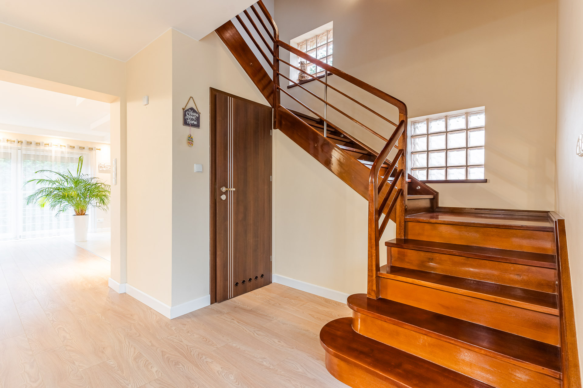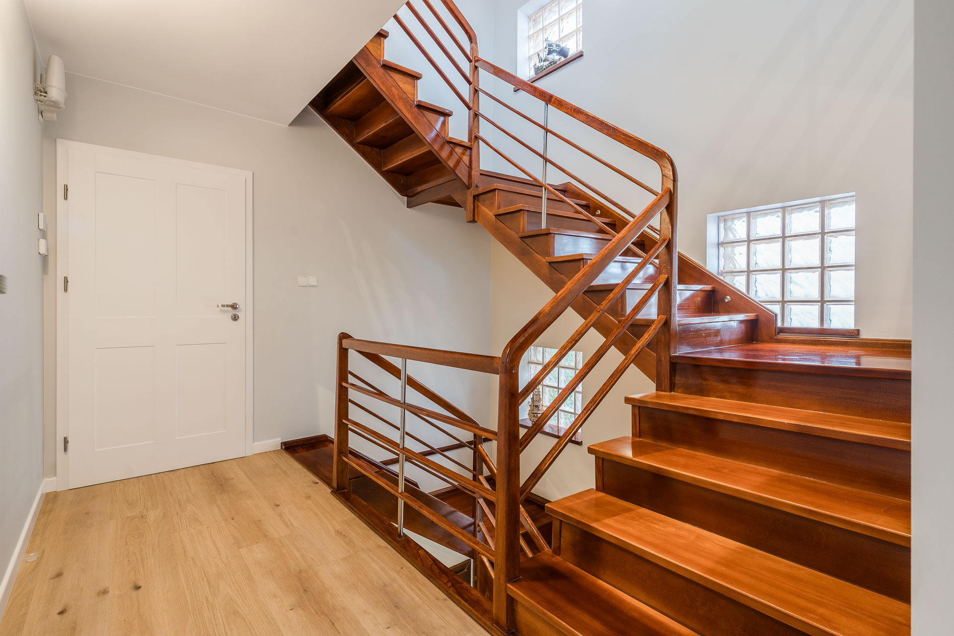 Na każdą kondygnacje prowadzą solidne schody drewniane.