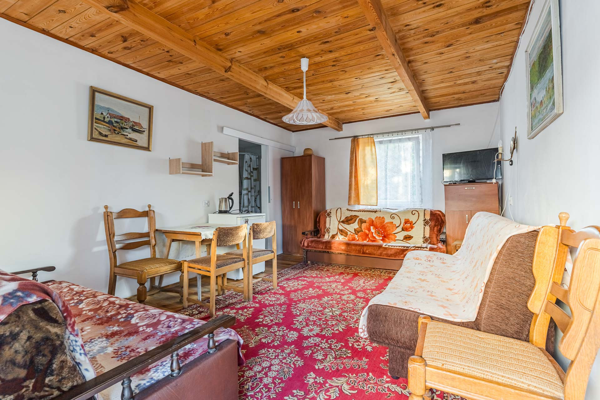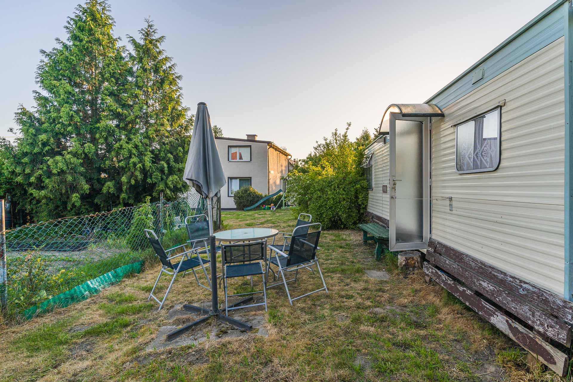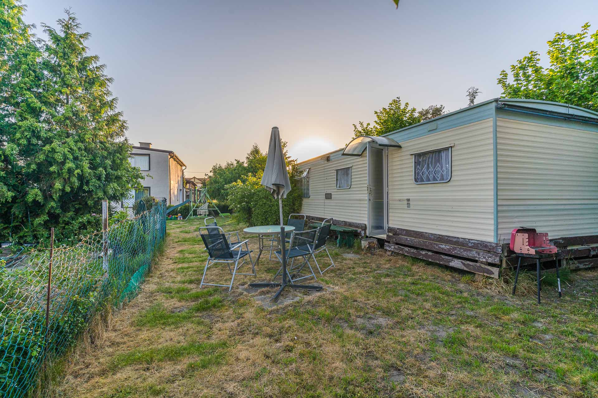Na posesji znajduje się także przyczepa holenderska z aneksem kuchennym salonem oraz sypialnią.