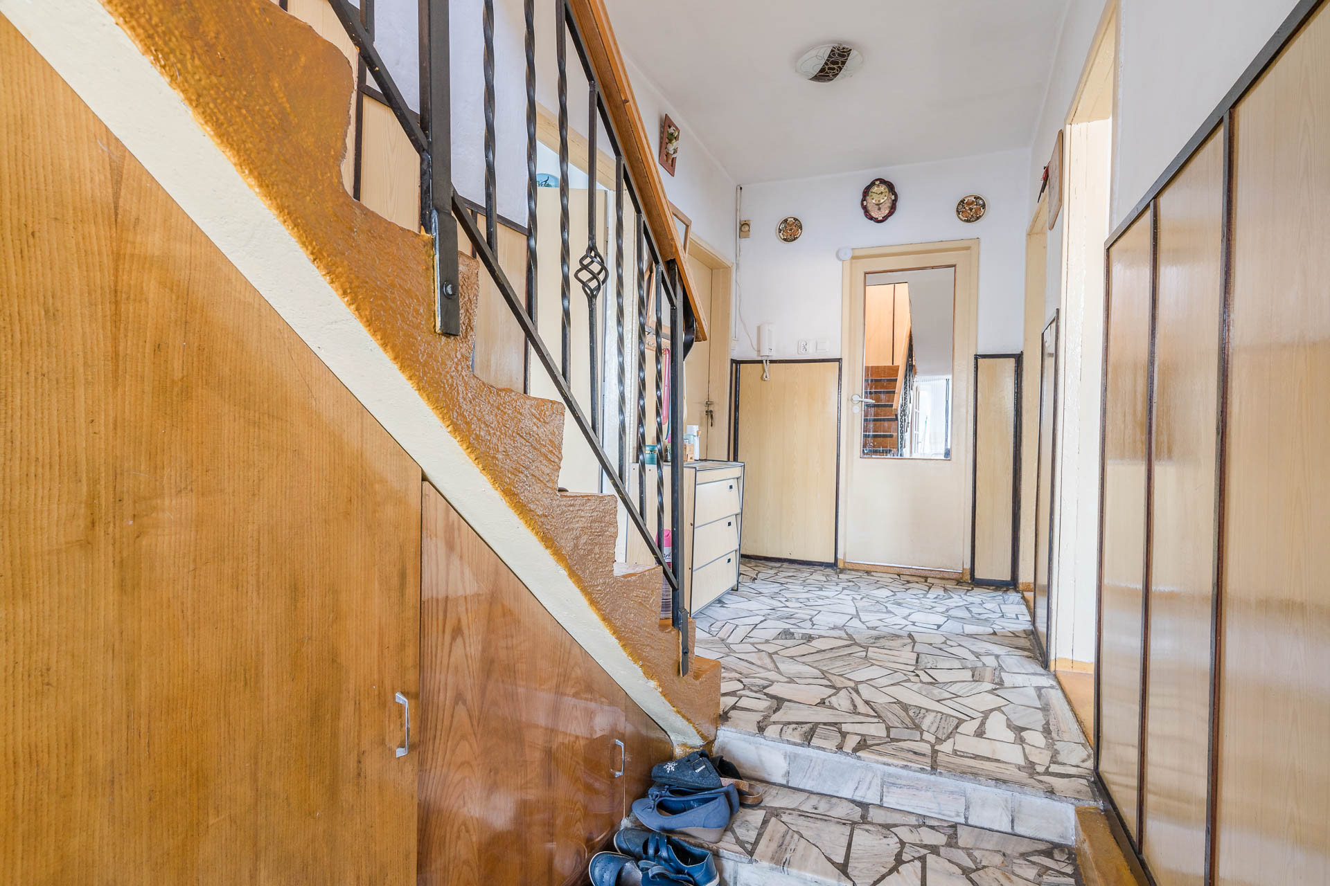 Dom ma powierzchnię 118 m2 i składa się z dwóch kondygnacji. z cegły oraz p[ustaka, okna pcv dach pokryty blacha trapezową. Na pierwszej znajdziemy kuchnie, korytarz, łazienkę oraz 3 pokoje, na piętrze znajduje się 4 pokoje z czego 2 wyposażone zostały w łazienki z WC, a dwa posiadają jedną wspólną łazienkę na korytarzu.