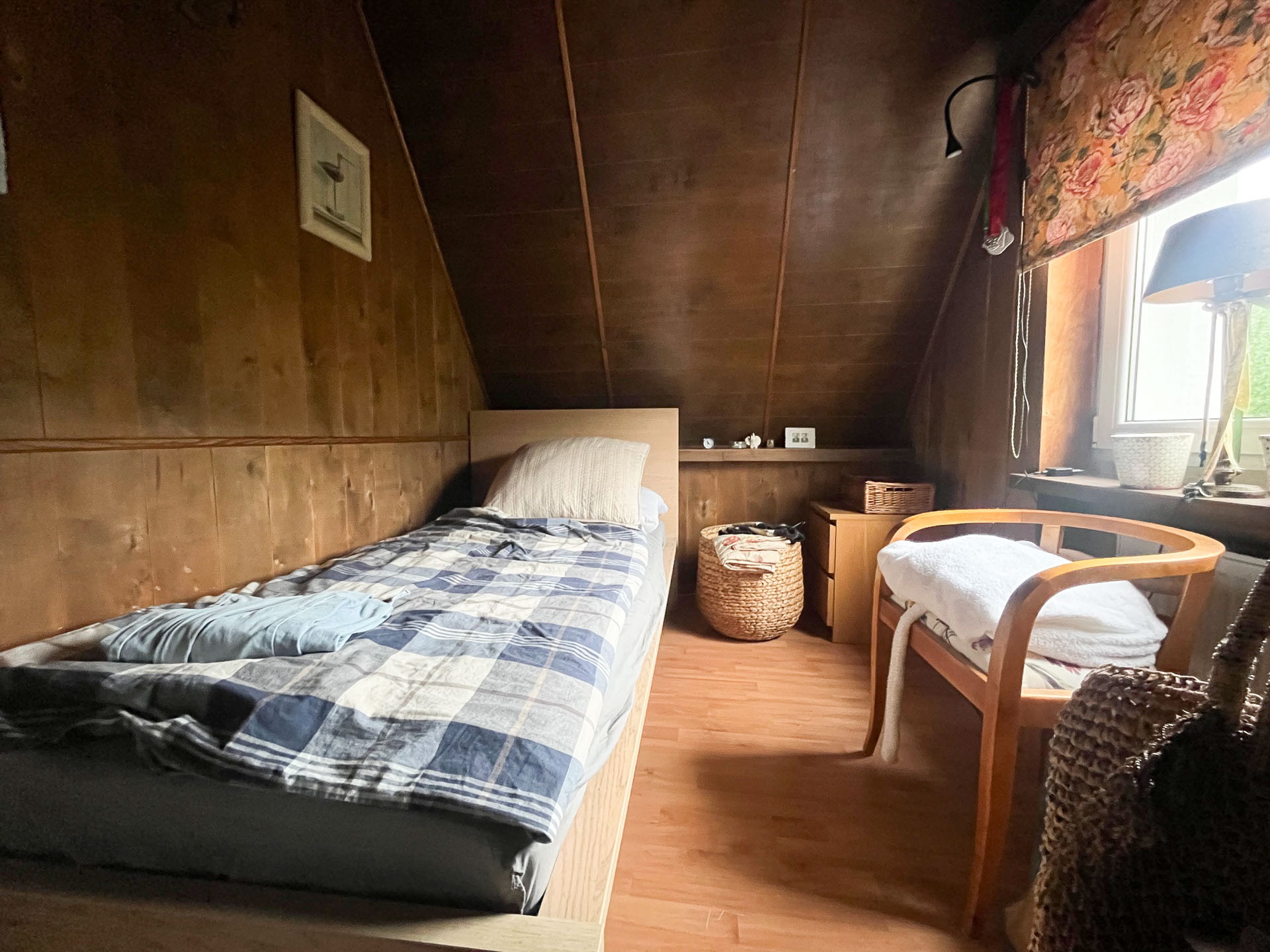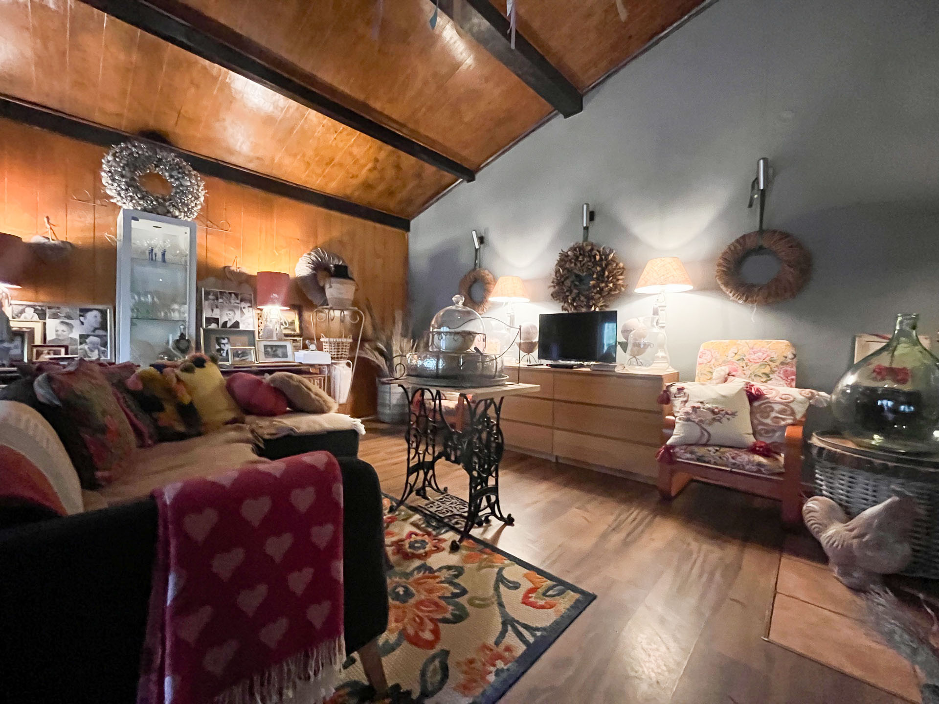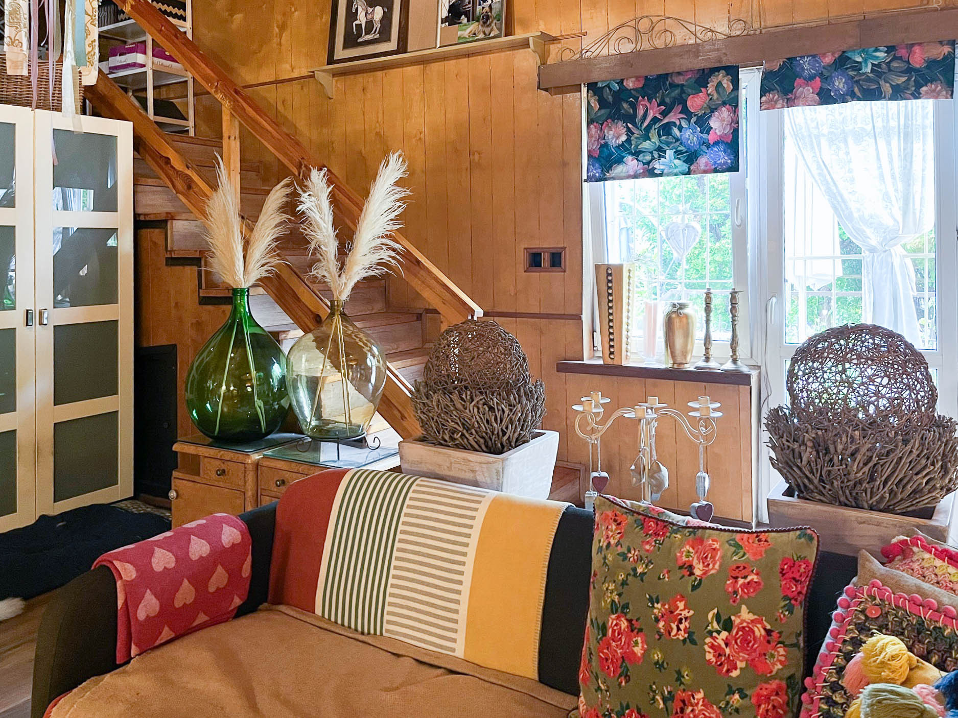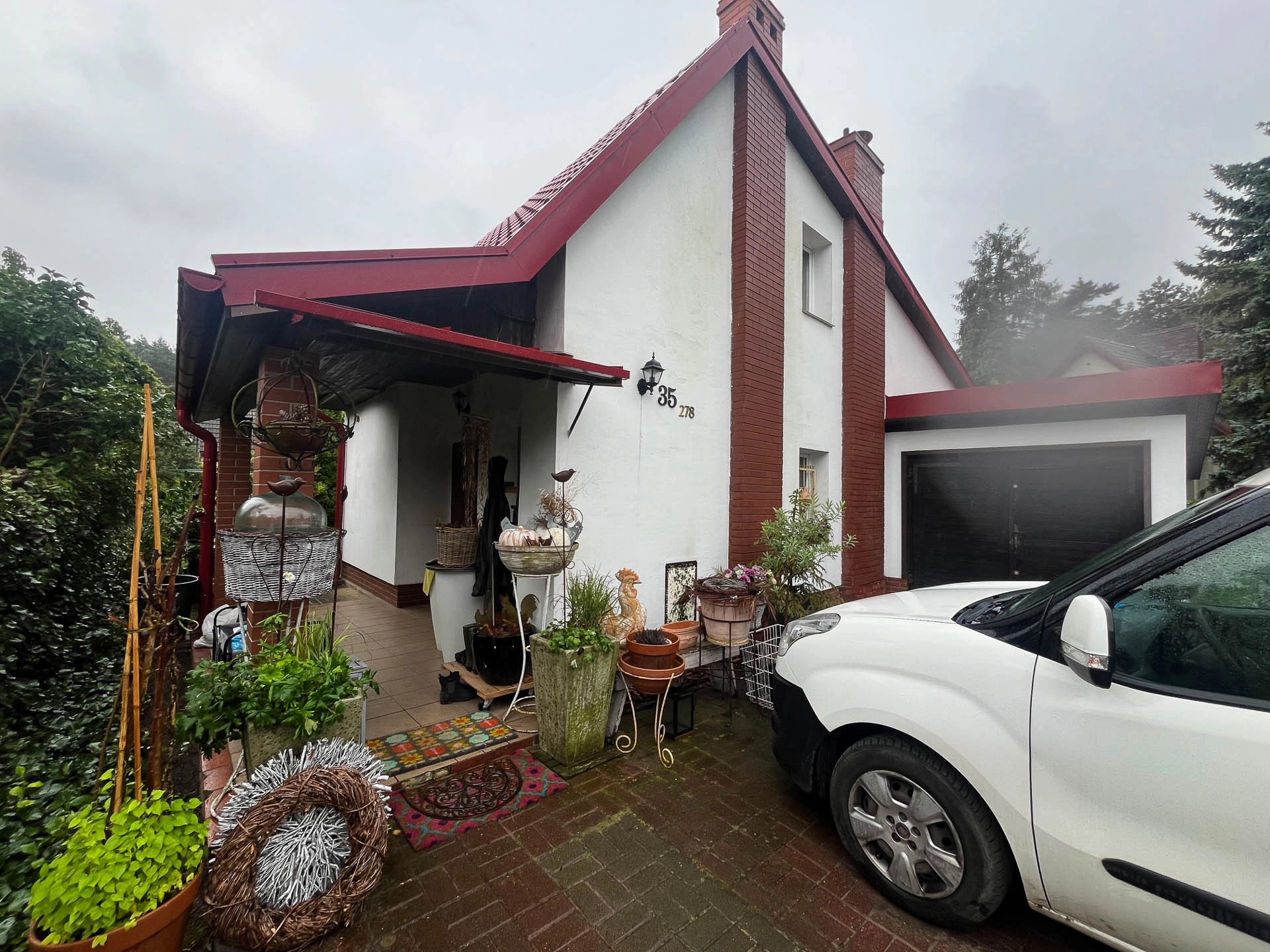 Dom wyróżnia się niepowtarzalnym klimatem – z zewnątrz klasyczna bryła z czerwonym dachem i ceglaną opaską, wewnątrz zaś przytulne, pełne charakteru wnętrze, w którym królują drewno, naturalne materiały i ciepłe barwy. Salon z wysokim, drewnianym sufitem i widocznymi belkami nadaje wnętrzu rustykalny, nieco artystyczny styl, w którym łatwo się zakochać.