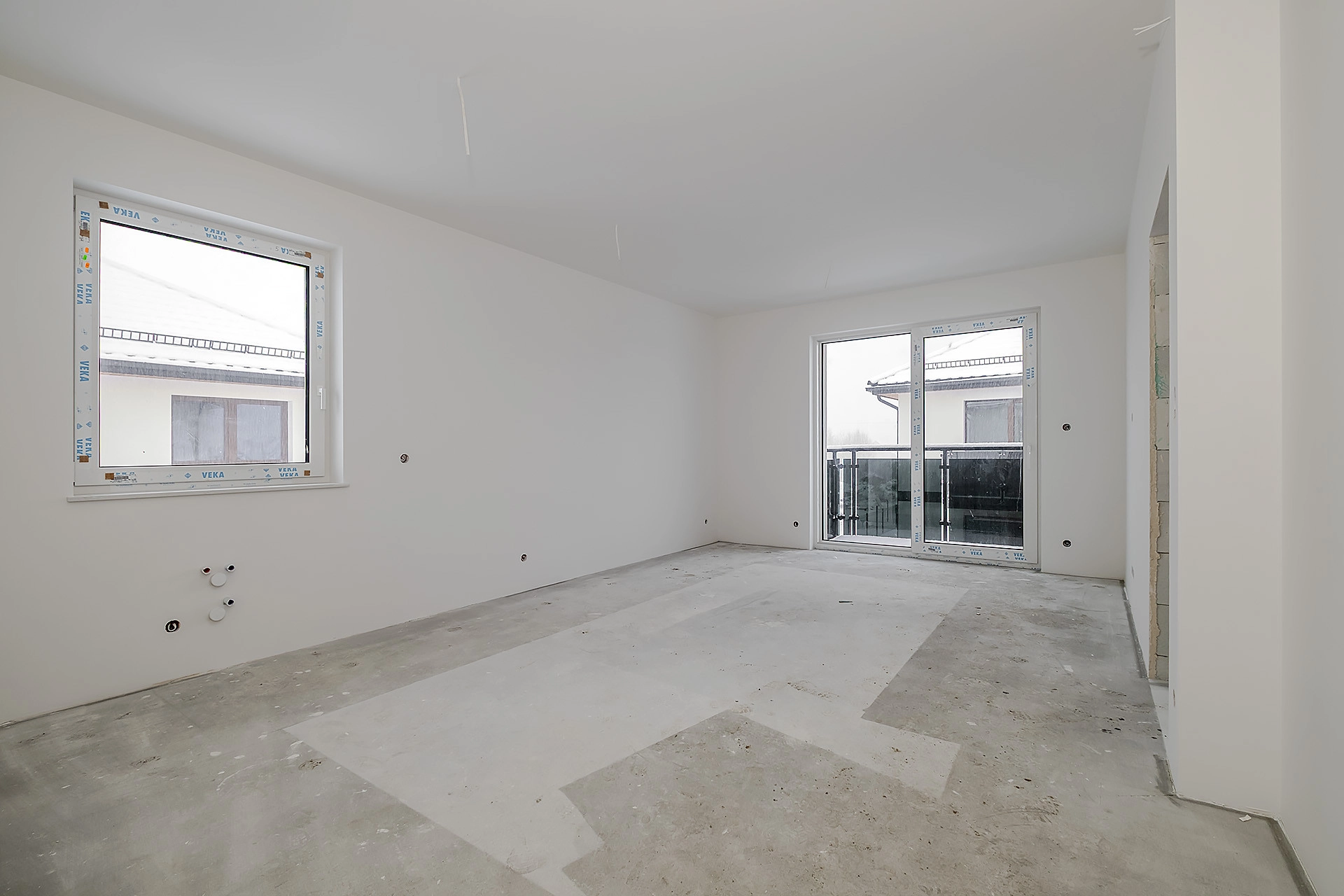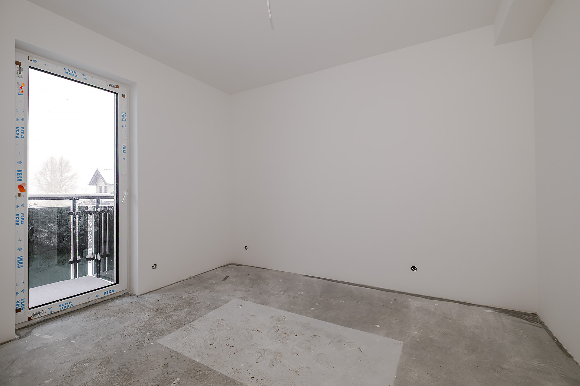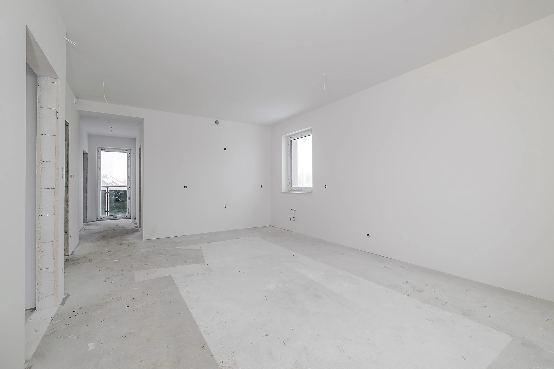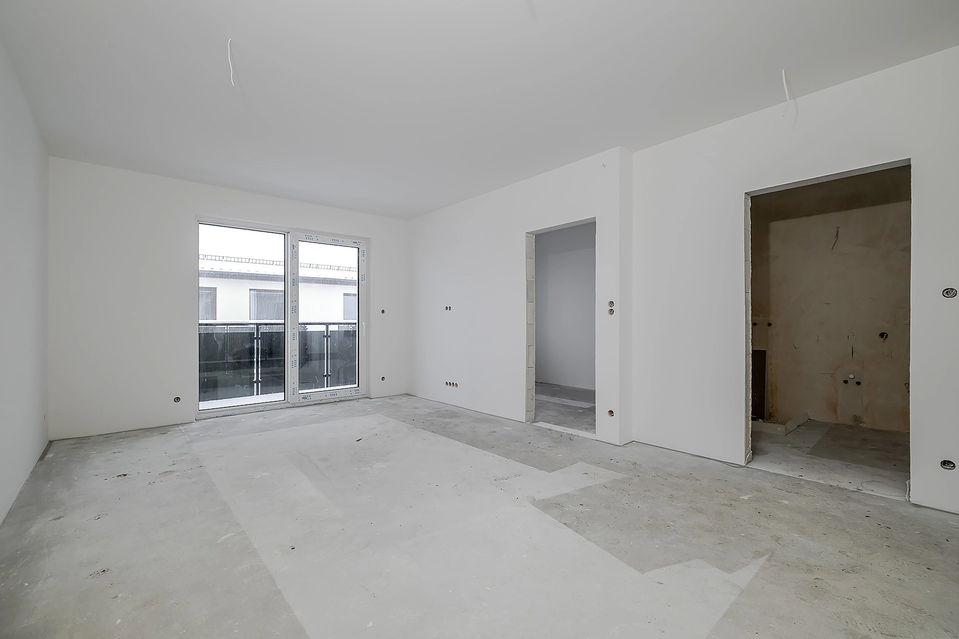 – słoneczny salon z aneksem kuchennym z wyjściem na balkon,