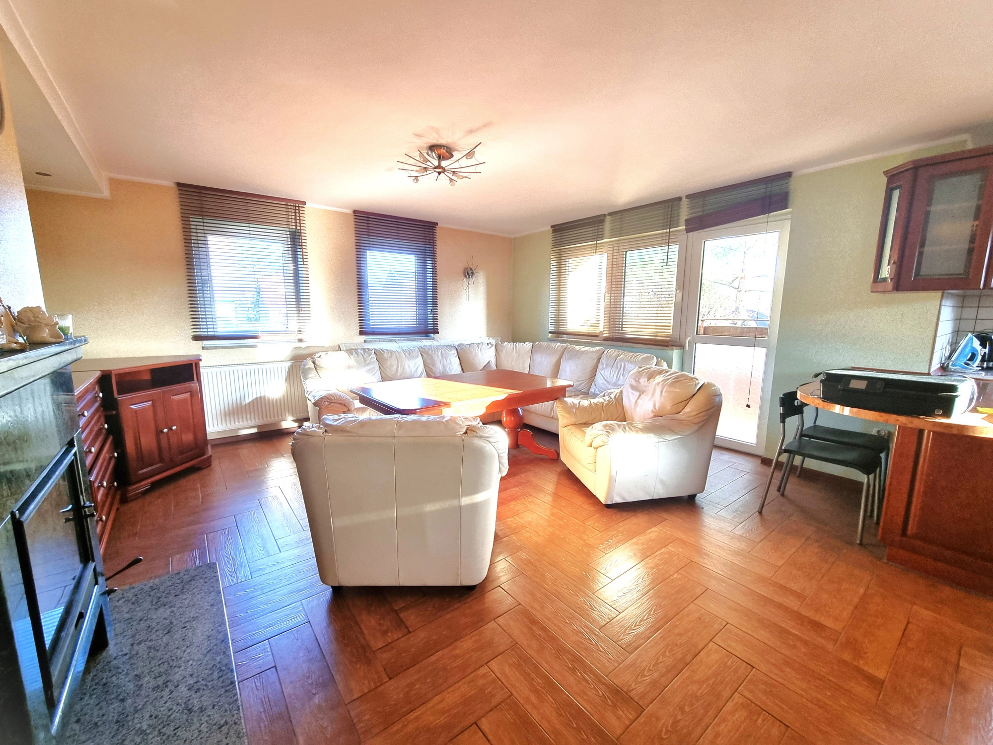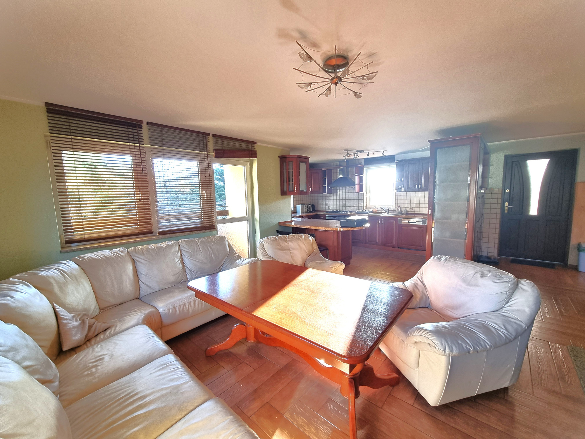 – przestronny salon (z którego można wyjść na balkon) wraz z otwartą kuchnią,