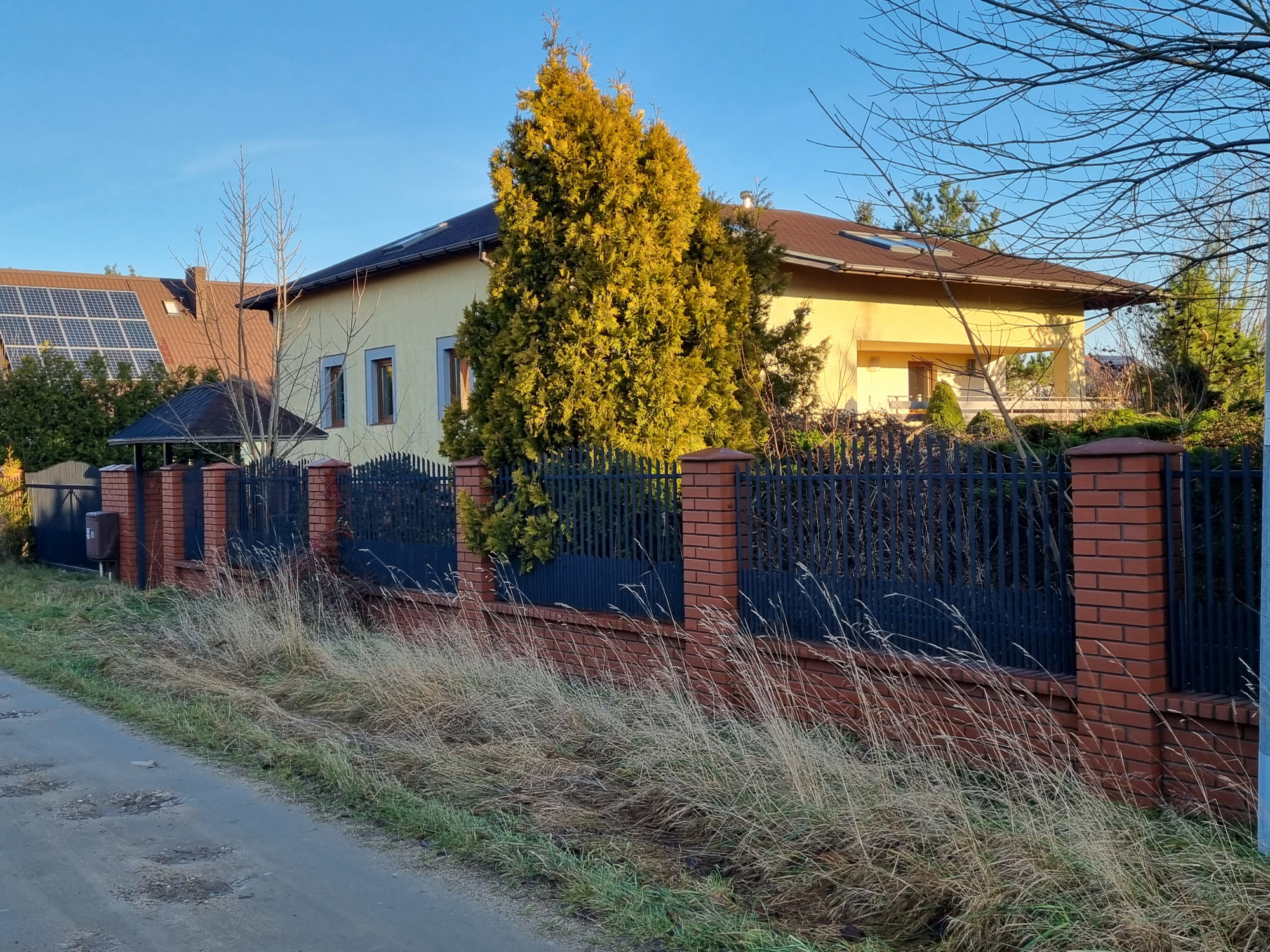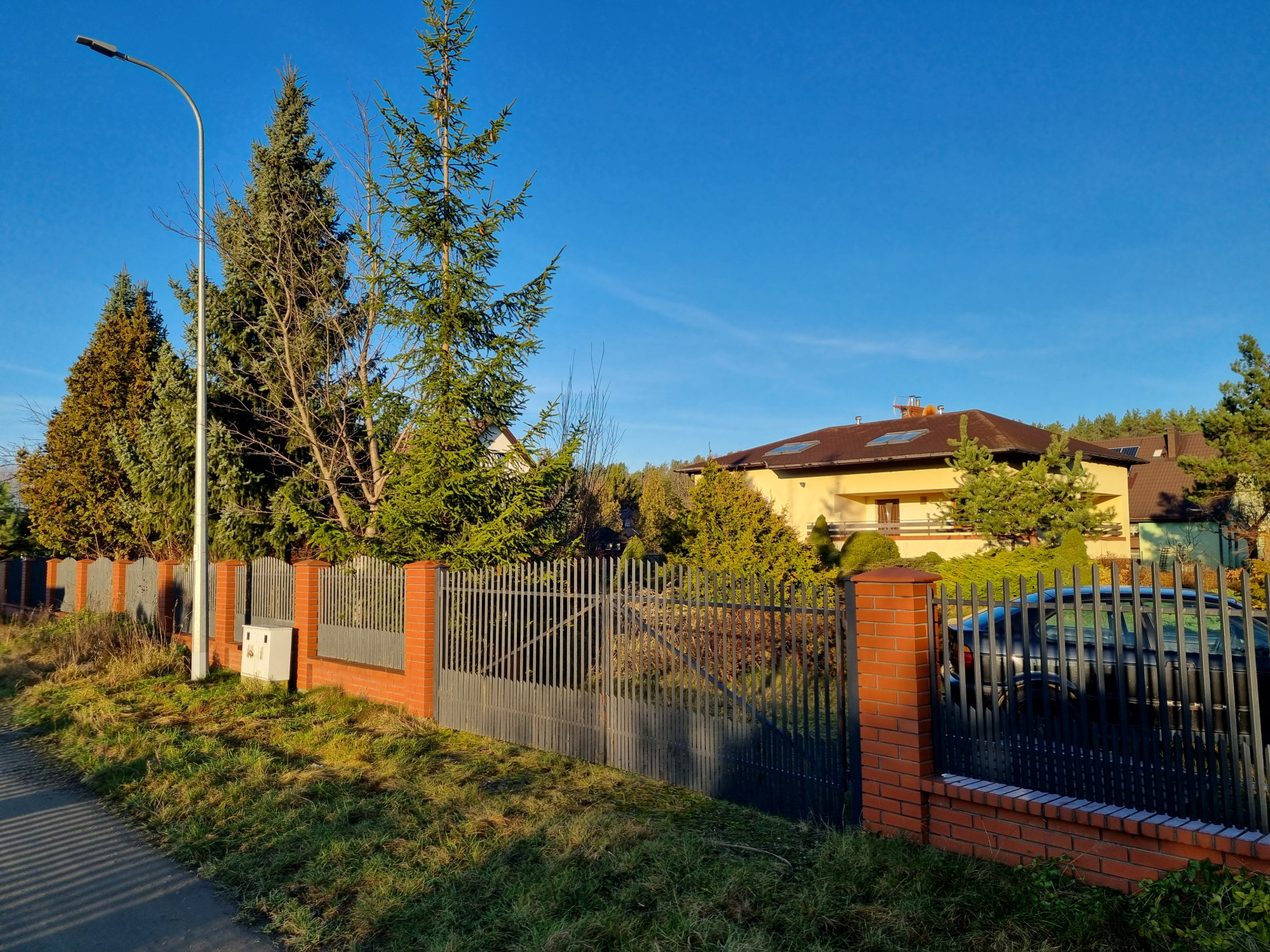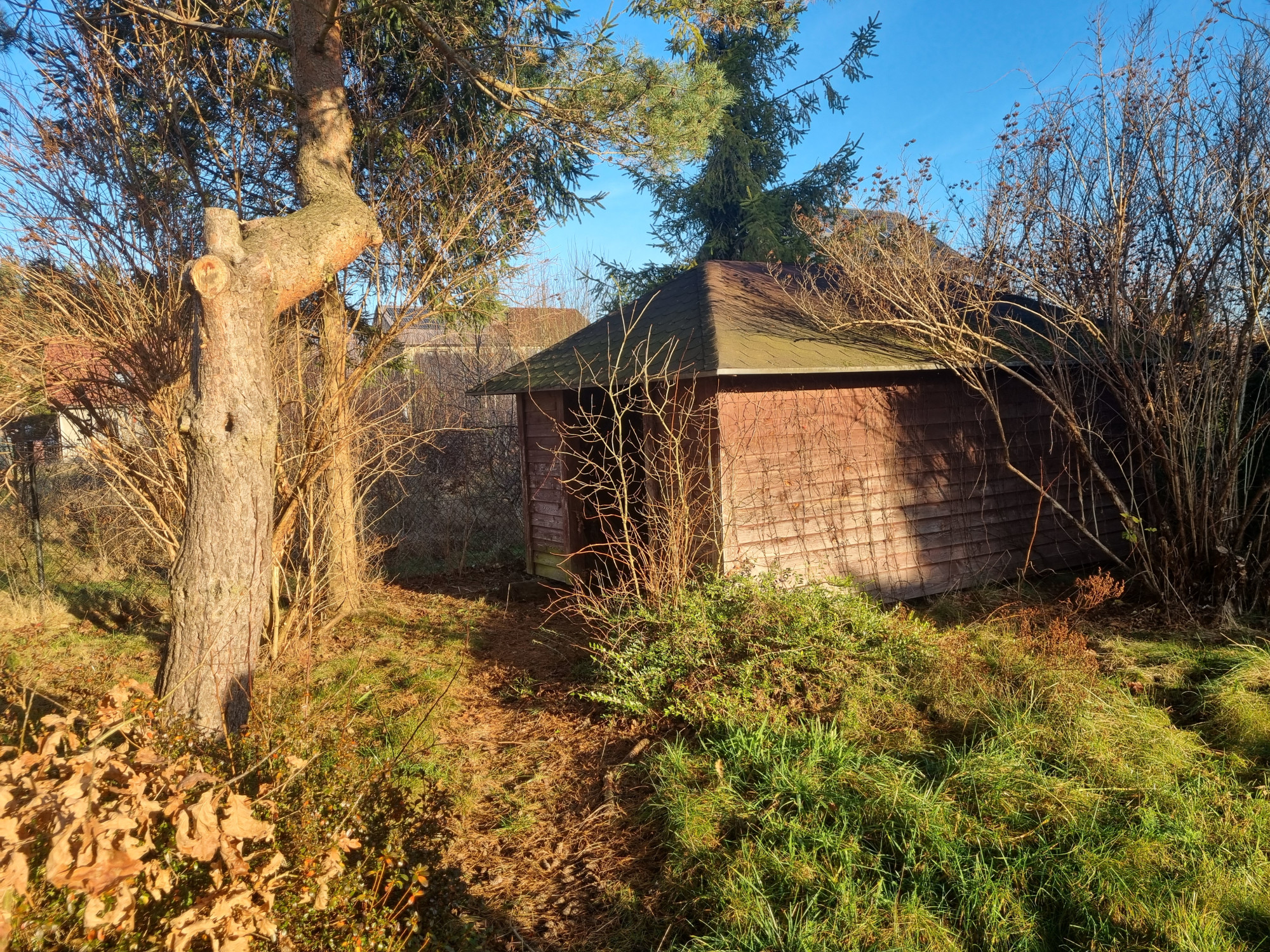 Działka ogrodzona z dwiema bramami wjazdowymi, na jej terenie szopka na narzędzia oraz drewno kominkowe.