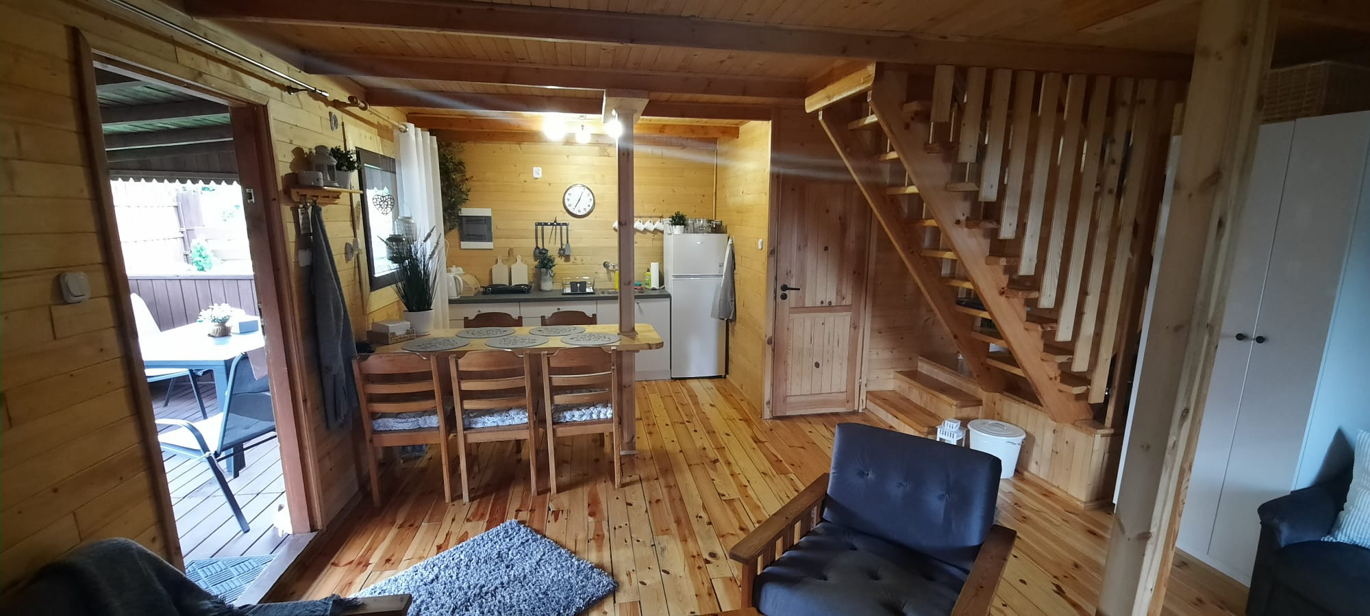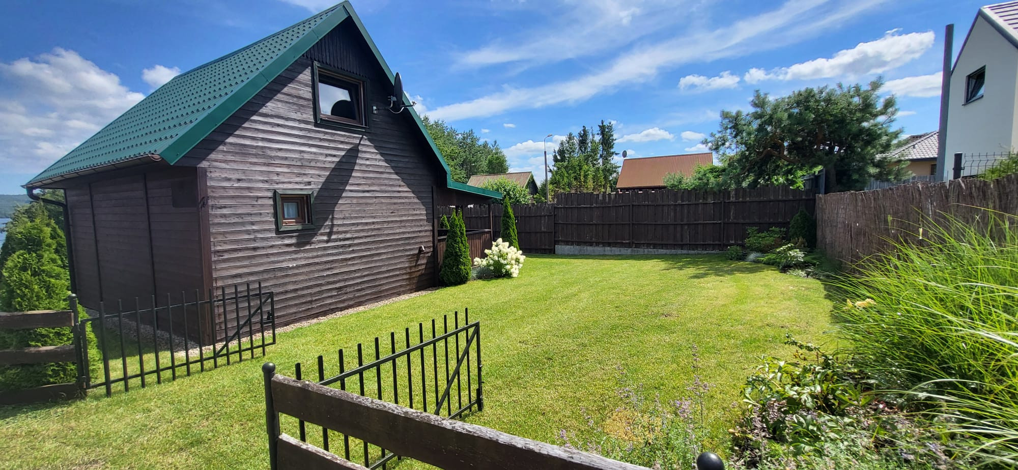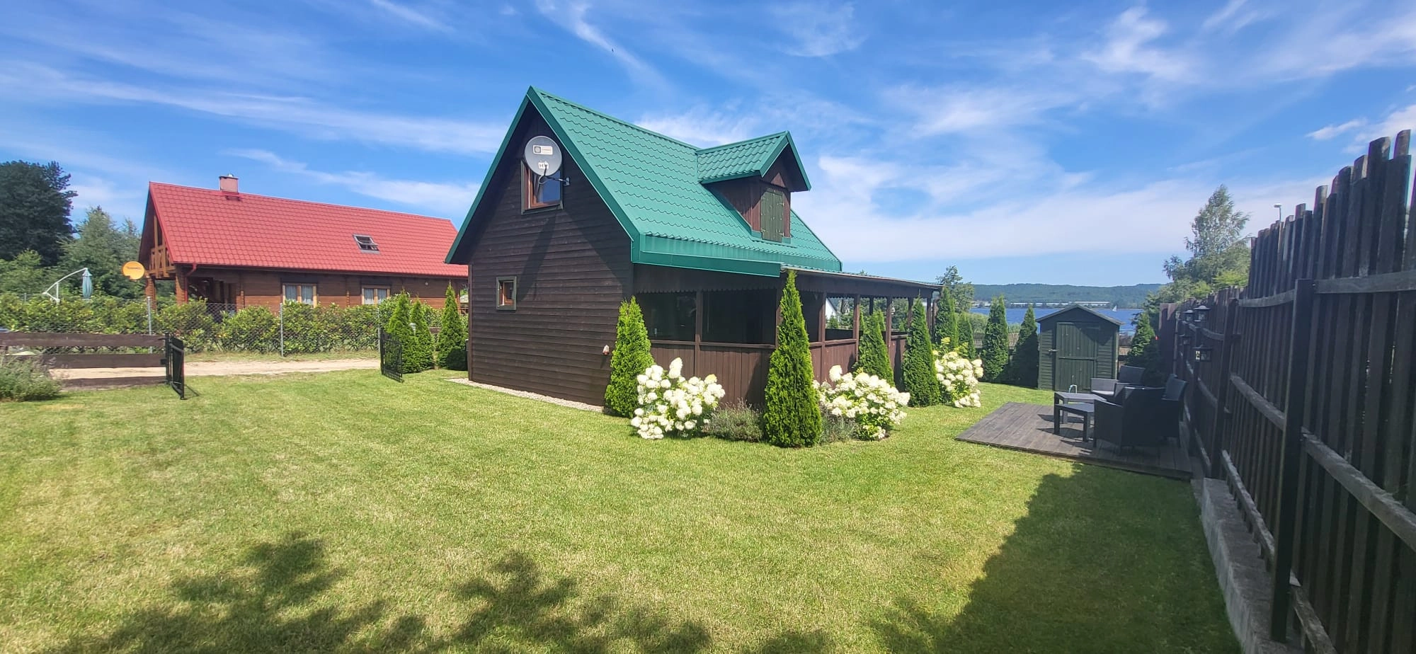 dom wolnostojący letniskowy 7 osobowy z dużym zadaszonym tarasem z widokiem na jezioro o powierzchni całkowitej 45 m2