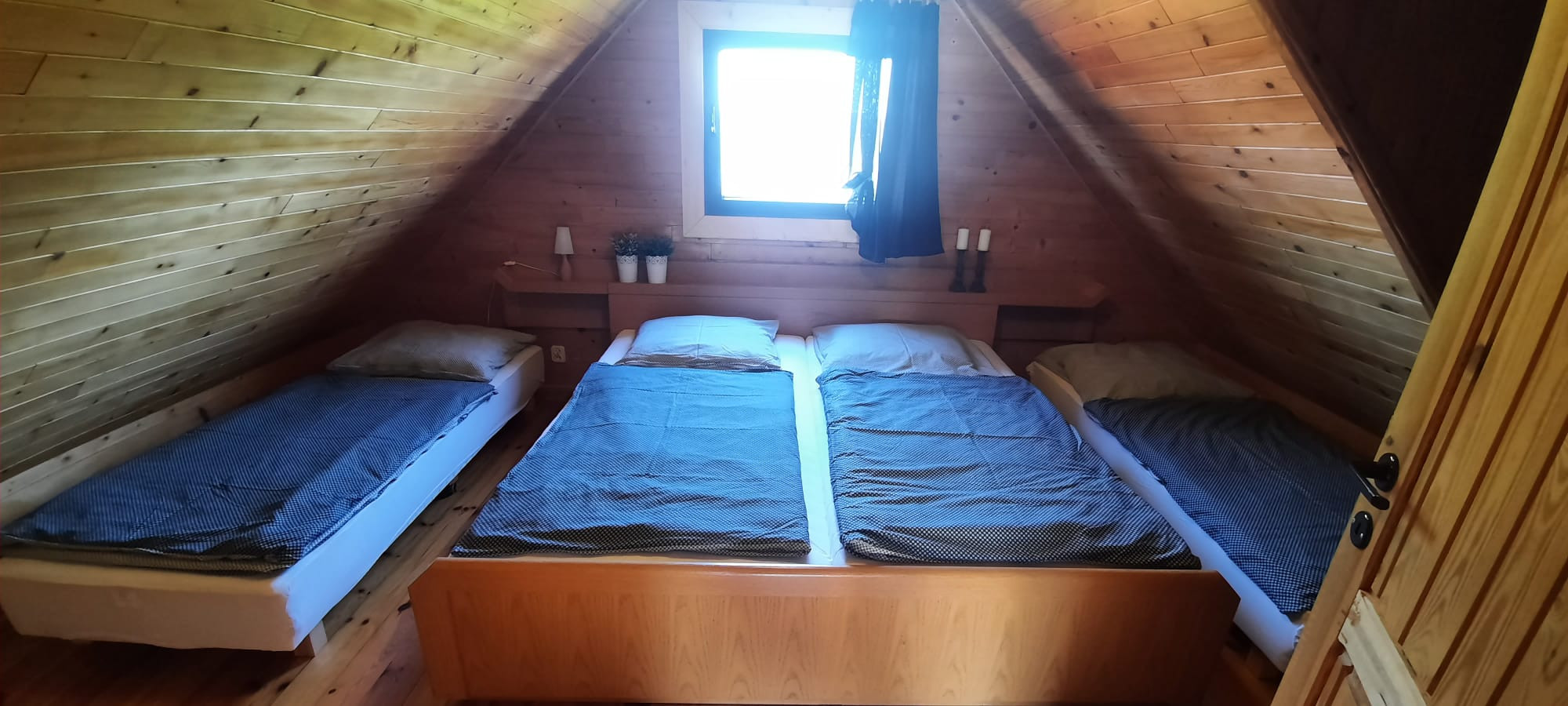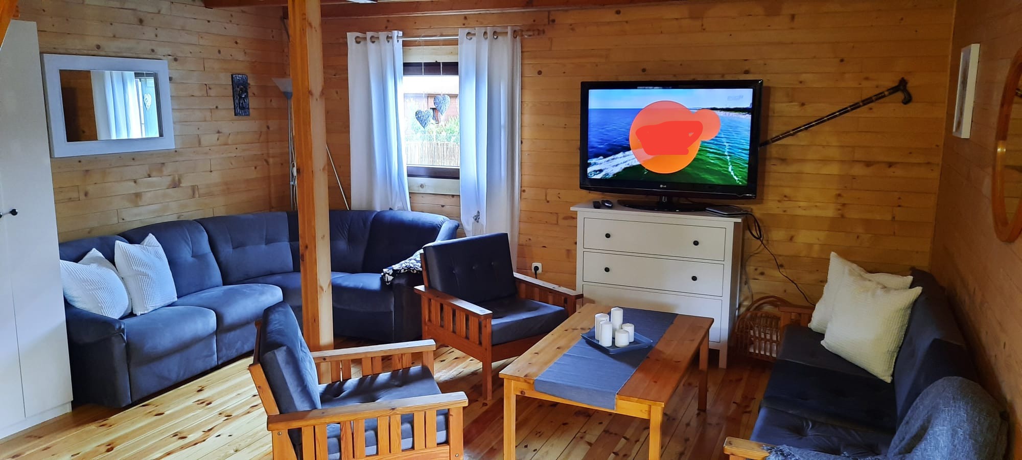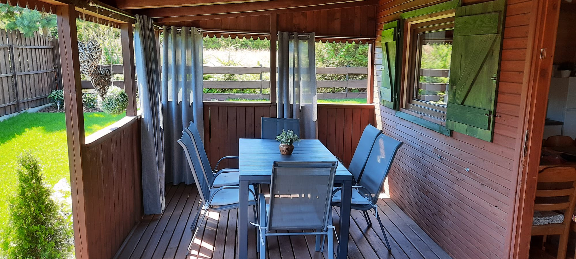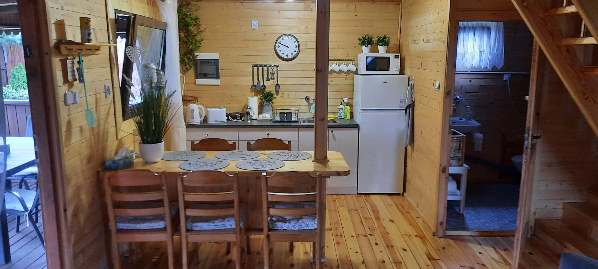 dom wolnostojący letniskowy 7 osobowy z dużym zadaszonym tarasem z widokiem na jezioro o powierzchni całkowitej 45 m2