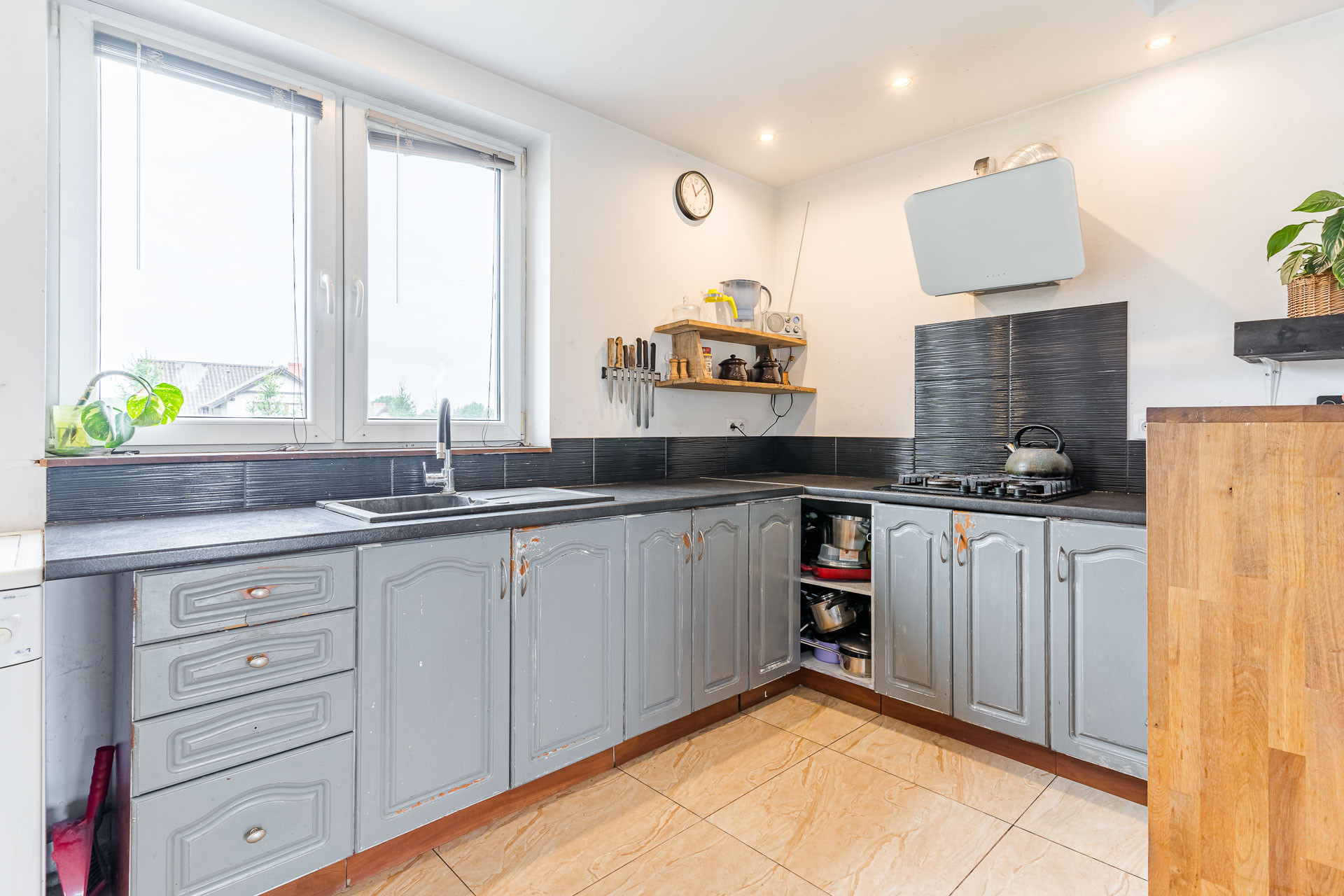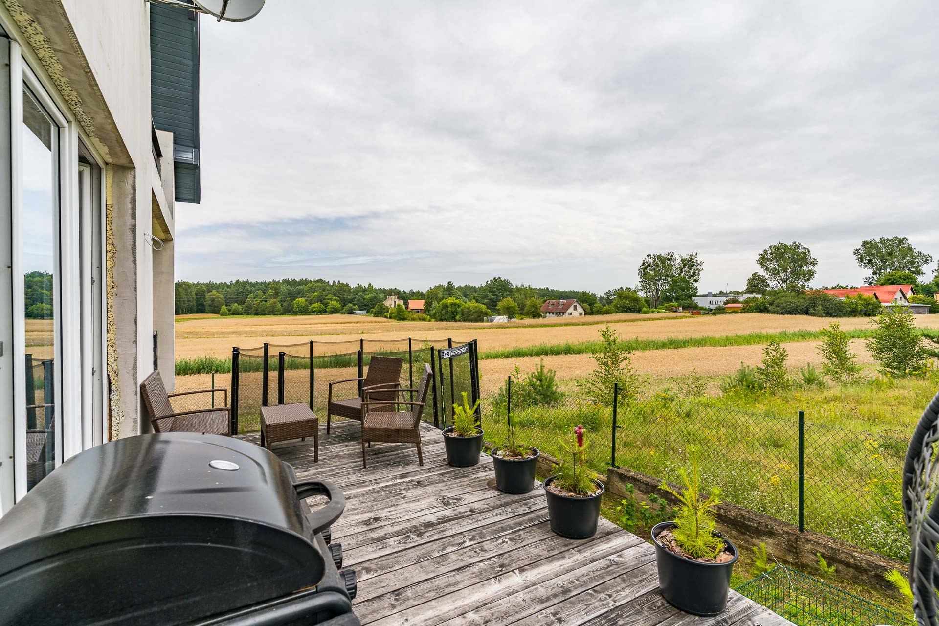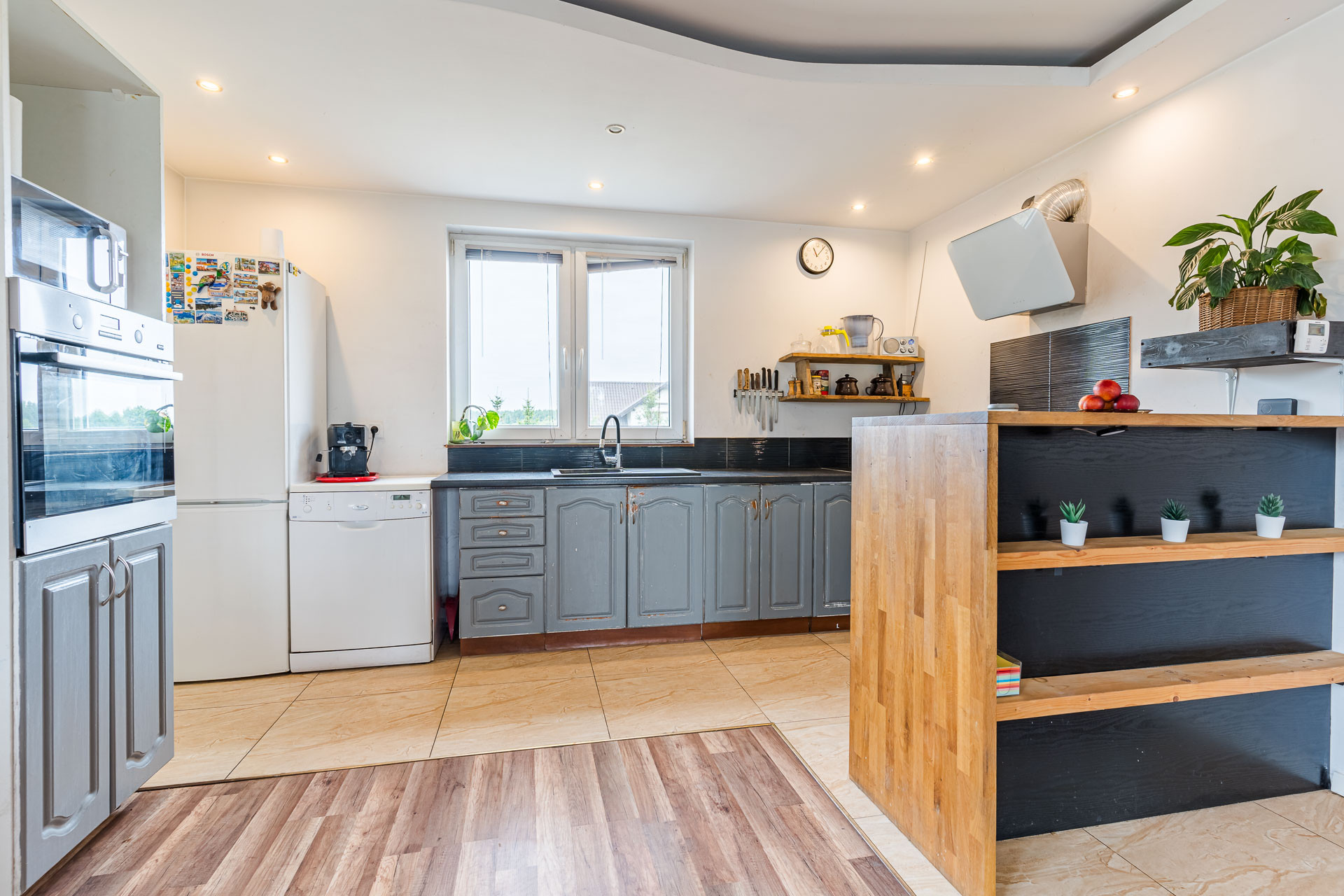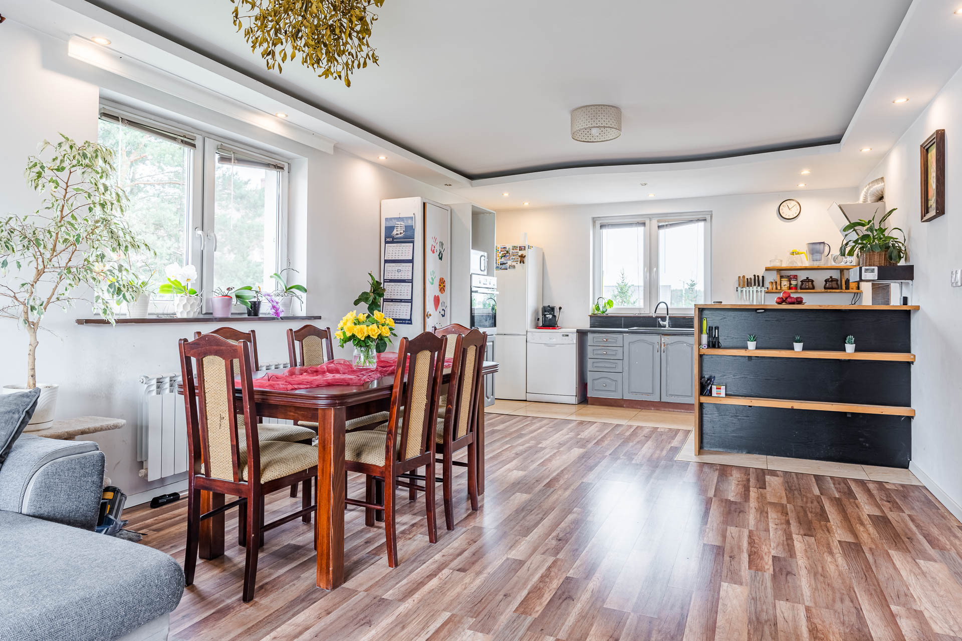 Na podłogach znajdują się panele oraz kafle. Przemyślany układ pomieszczeń i duże przeszklenia sprawiają, że wnętrza są jasne i przytulne. Dom bardzo słoneczny, a strefa dzienna z wyjściem na taras znajduje się po stronie wschodniej zachodniej, co gwarantuje świetne nasłonecznienie.