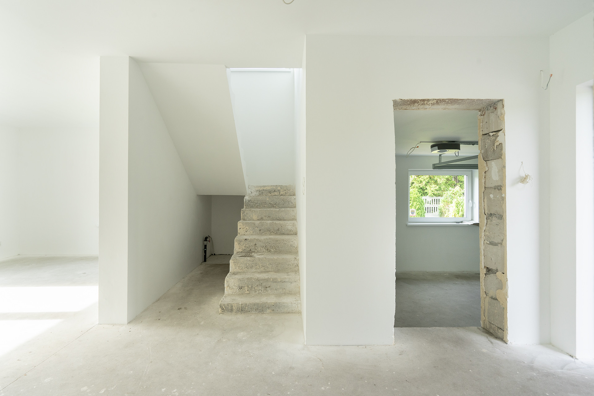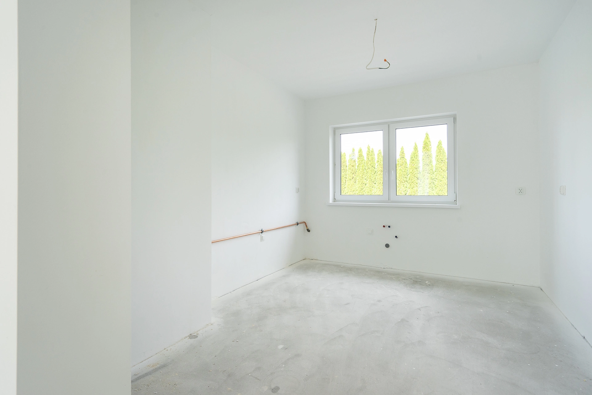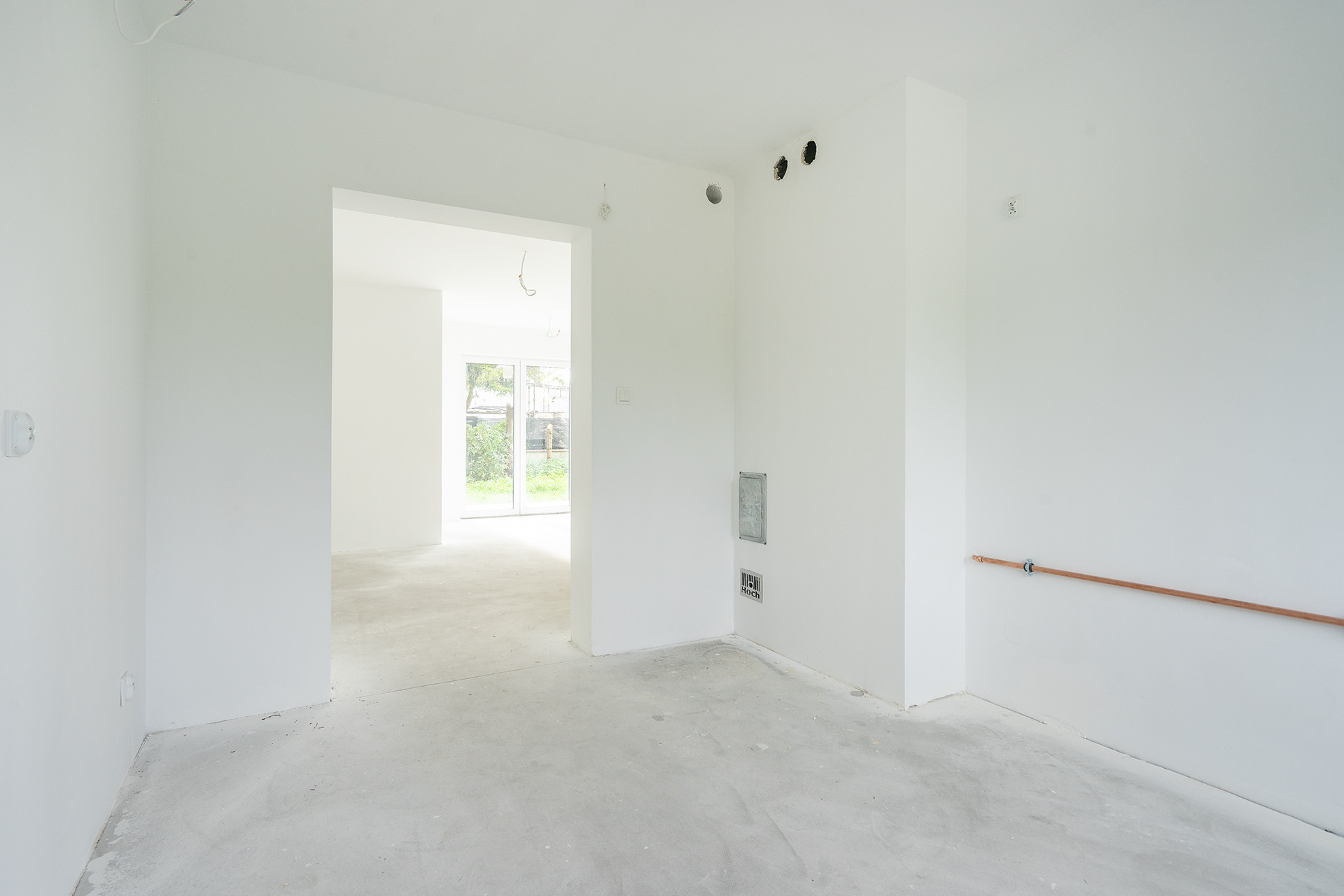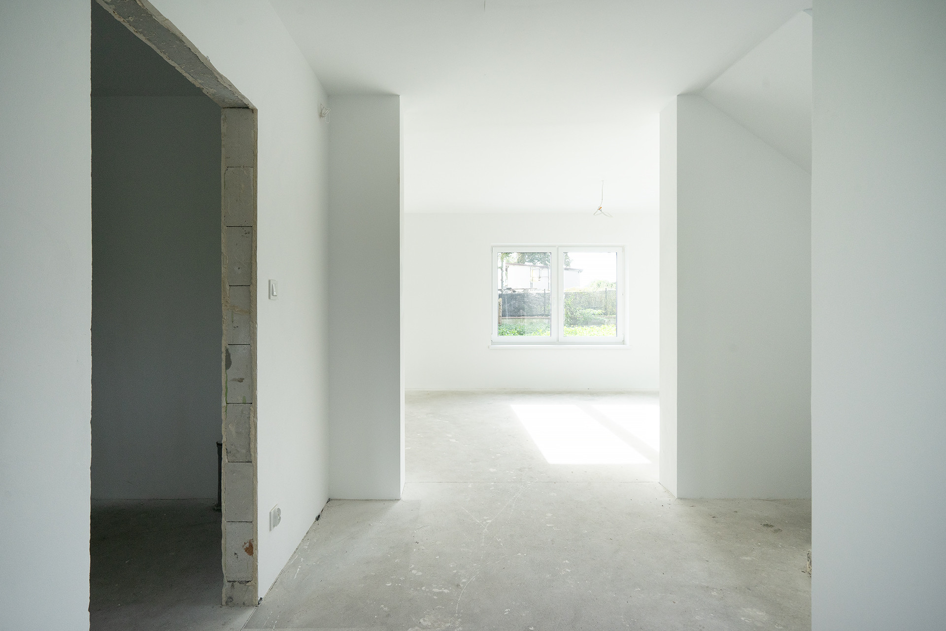 Nieruchomość sprzedawana w stanie deweloperskim – tynki gipsowe pokryte farbą gruntującą, parapety PCV, poddasze wykończone płytą gipsowo-kartonową, przygotowane instalacje TV, alarmowa oraz domofonowa. W garażu zamontowano segmentową bramę z napędem automatycznym.