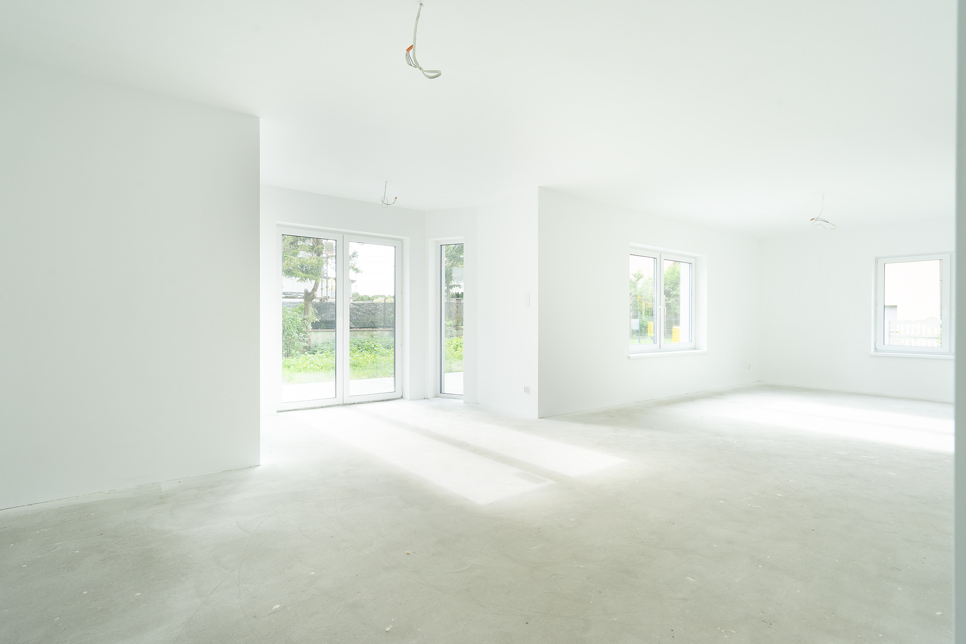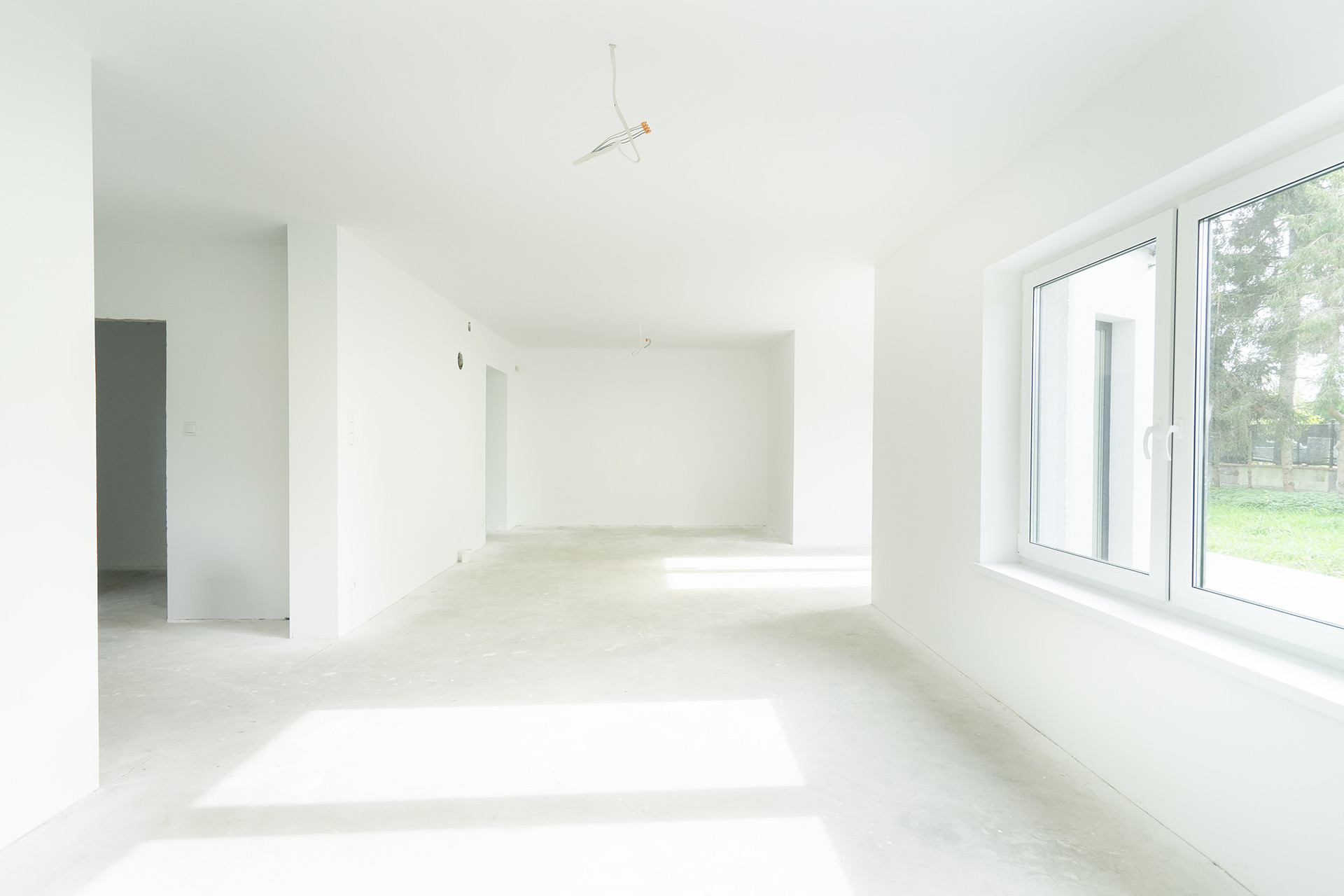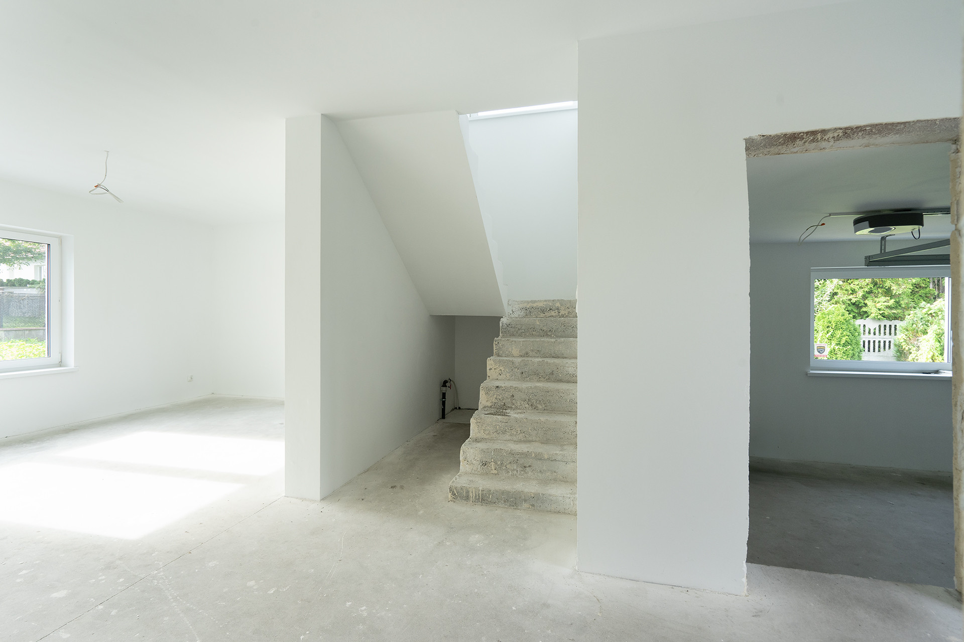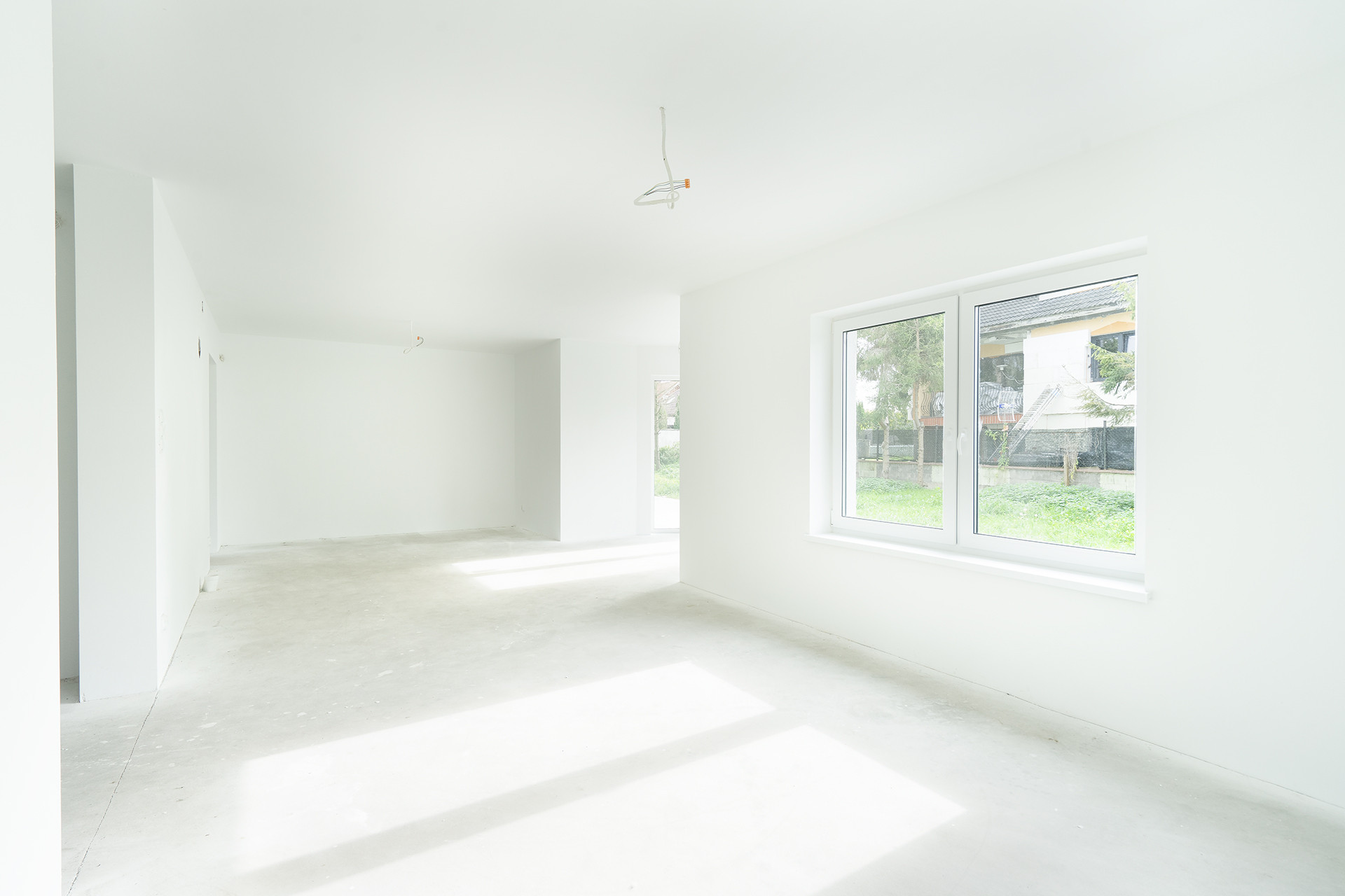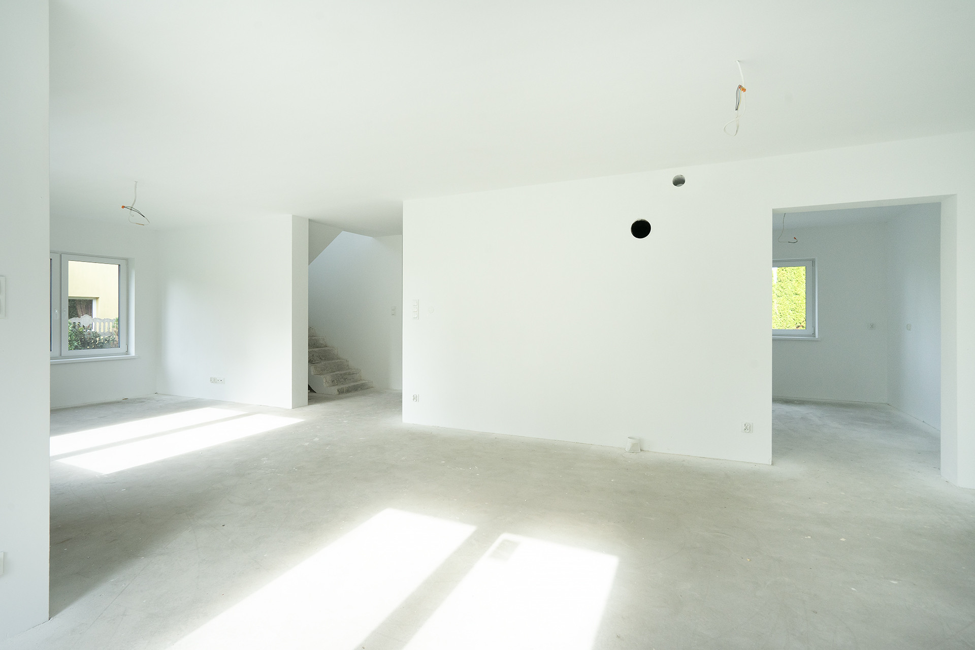 Nieruchomość sprzedawana w stanie deweloperskim – tynki gipsowe pokryte farbą gruntującą, parapety PCV, poddasze wykończone płytą gipsowo-kartonową, przygotowane instalacje TV, alarmowa oraz domofonowa. W garażu zamontowano segmentową bramę z napędem automatycznym.
