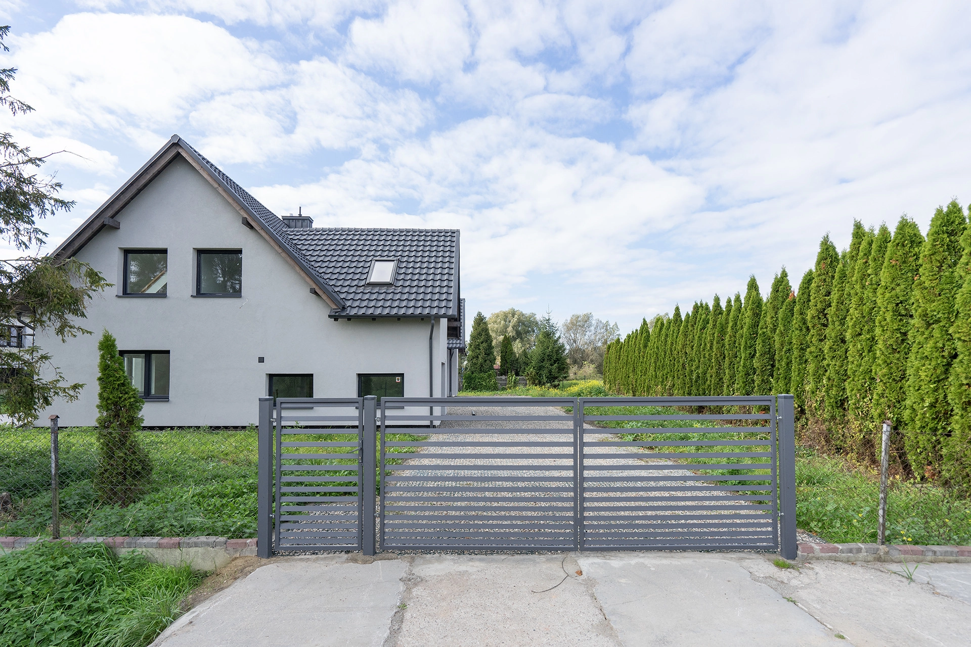 Ogłoszenie dotyczy jednej z dwóch dostępnych części domu w zabudowie bliźniaczej, położonego na działce o powierzchni 1300 m². Budynek jest dwukondygnacyjny, a teren posesji został wstępnie zagospodarowany – wytyczono drogę dojazdową, a całość ogrodzono i zabezpieczono bramą wjazdową.