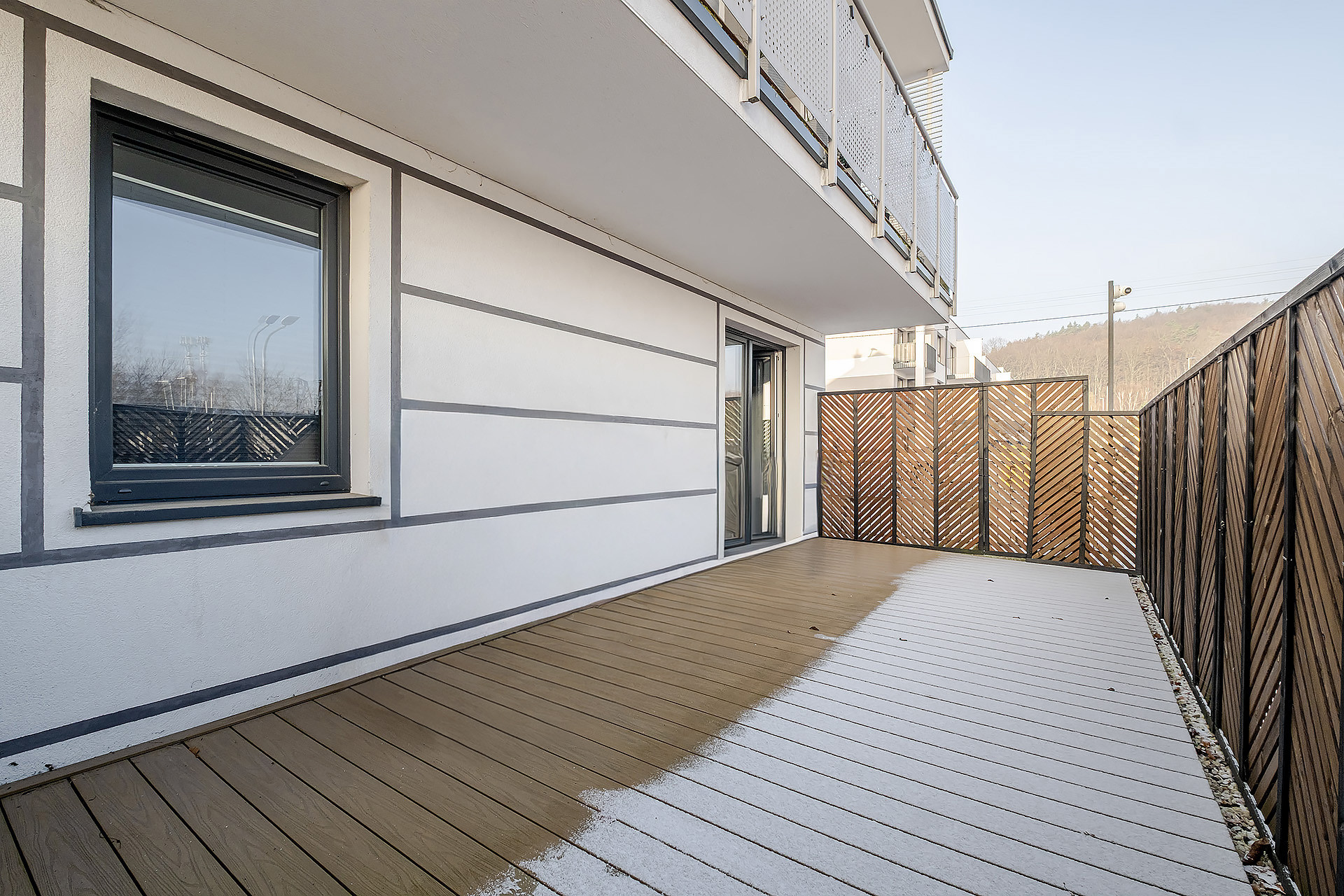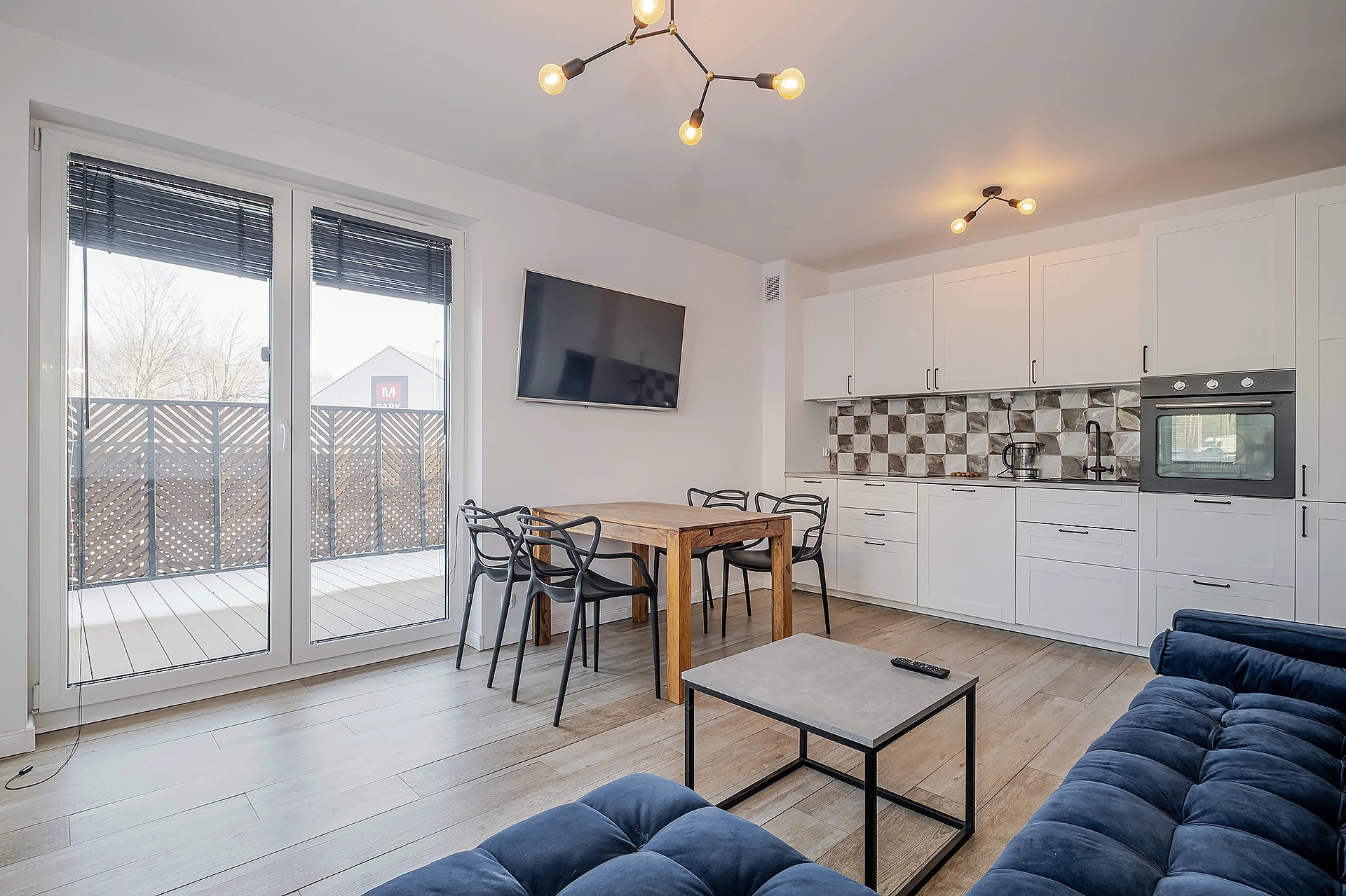 – duży salon (19,11 m2) z aneksem kuchennym i wyjściem na taras (18,32 m2)