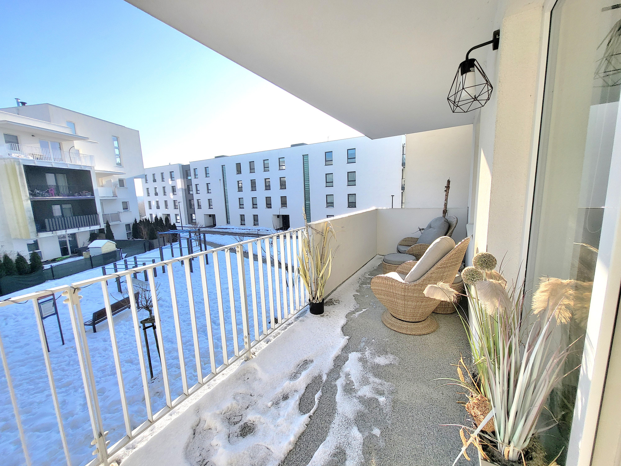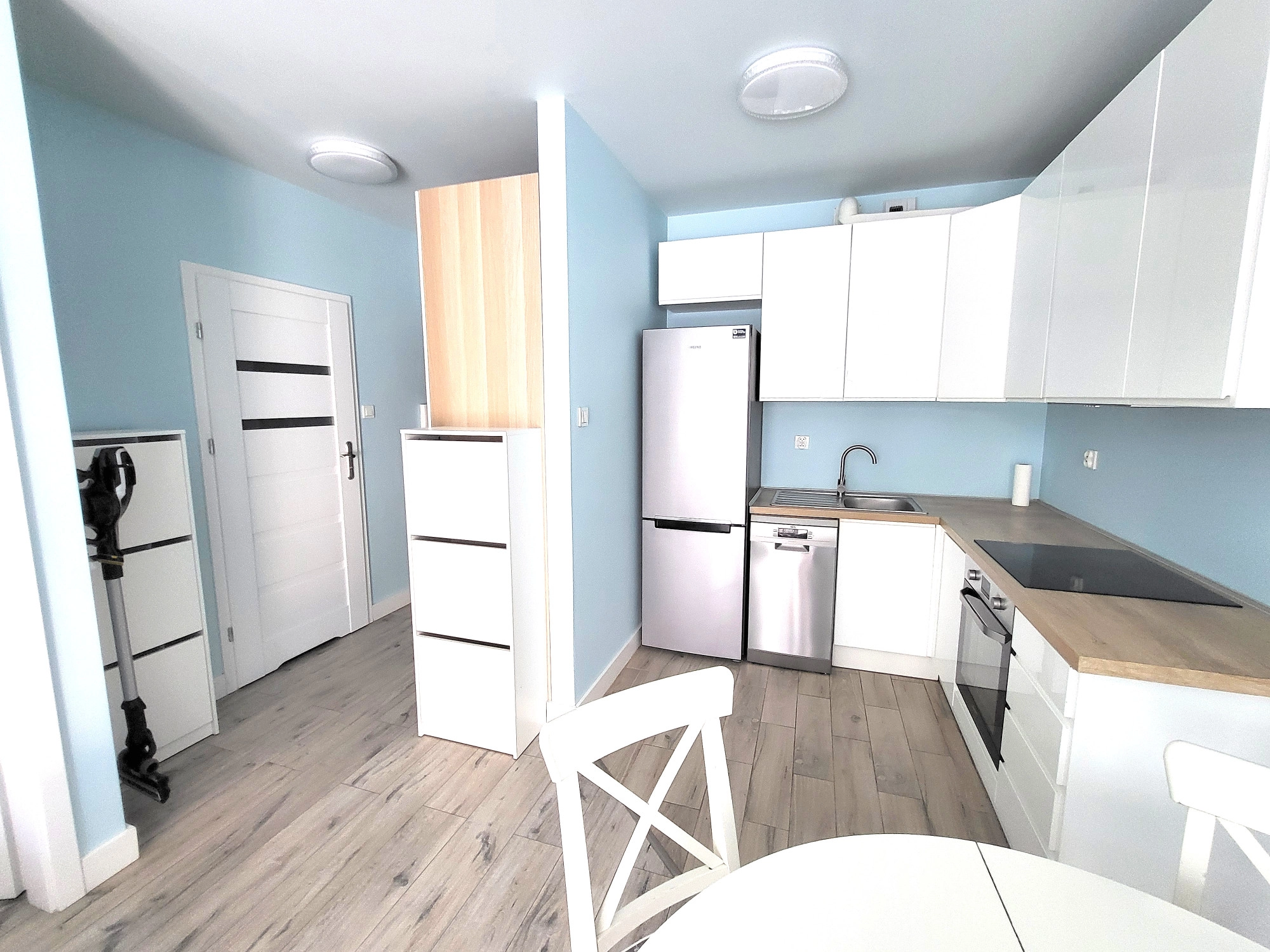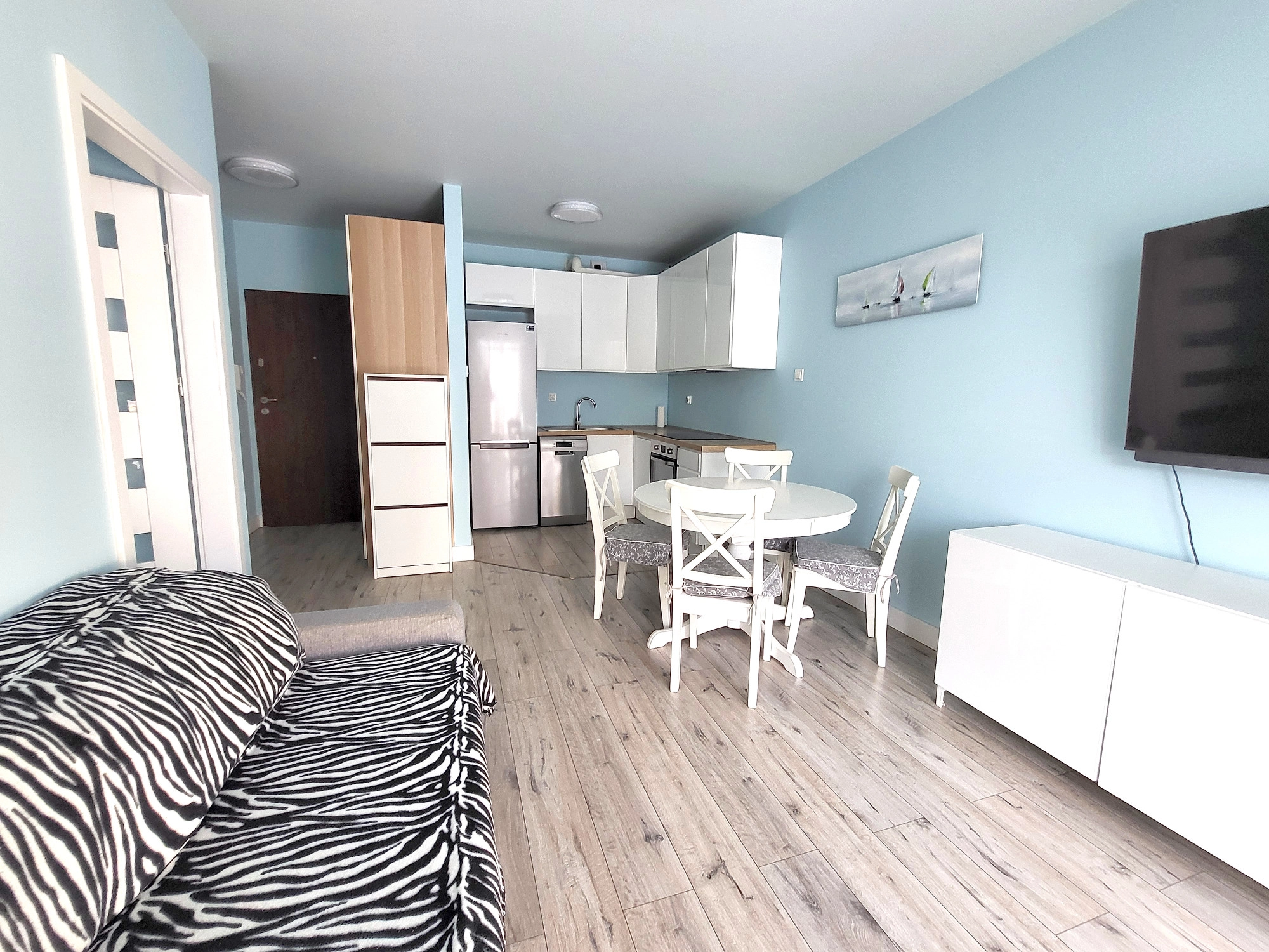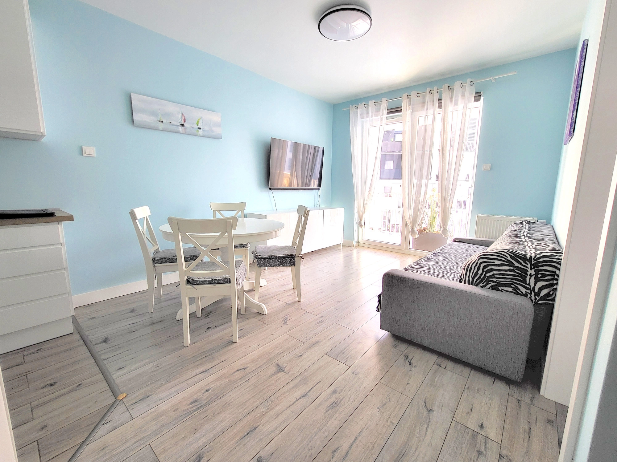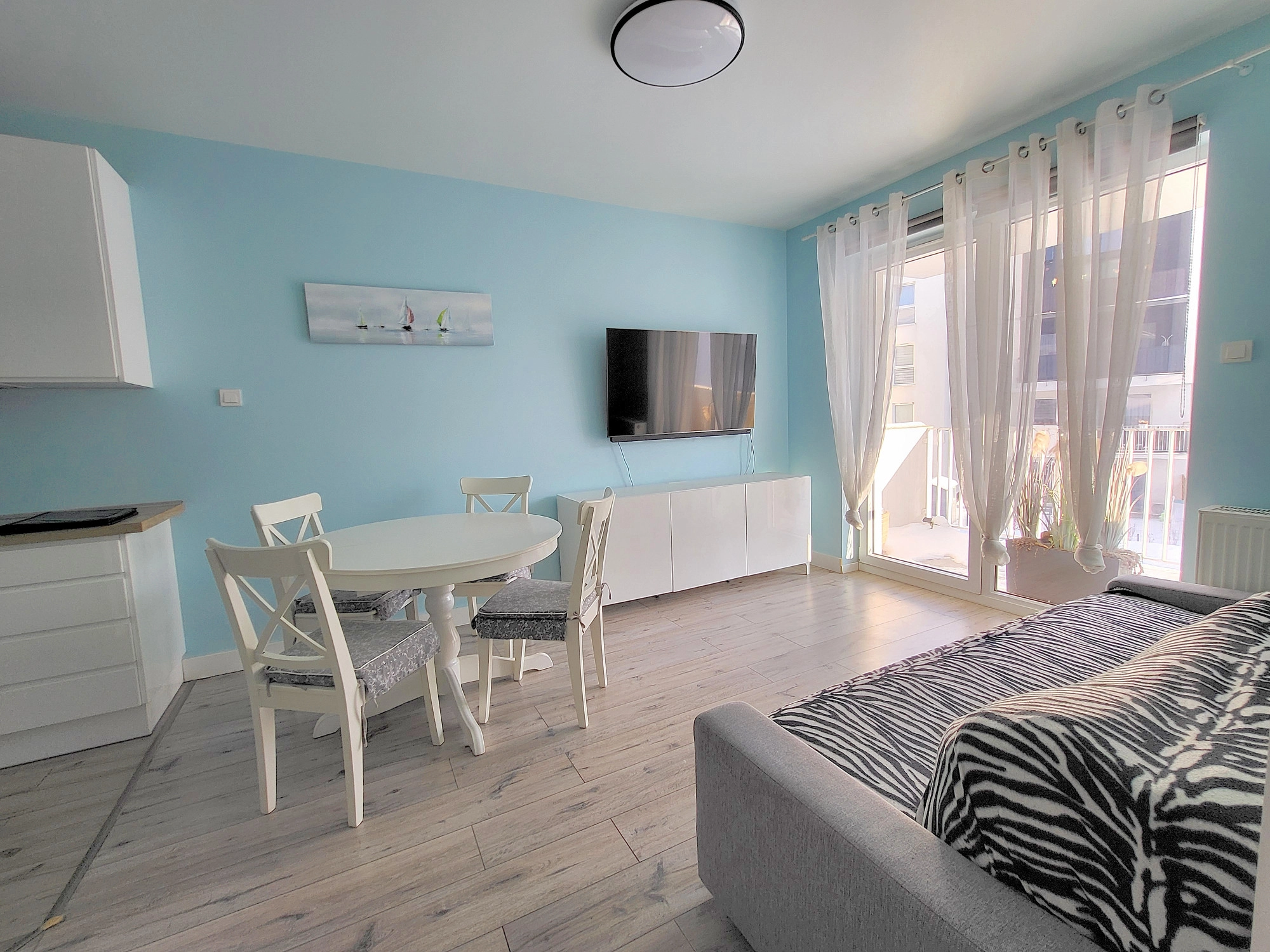 – salon z aneksem kuchennym i wyjściem na duży balkon. W salonie znajduje się również rozkładana sofa (brak na zdjęciach)