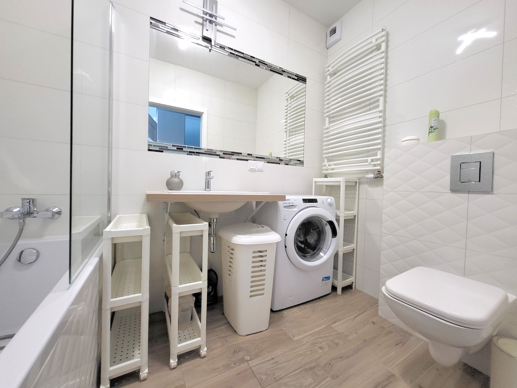 – łazienka z wanną wyposażona w pralkę