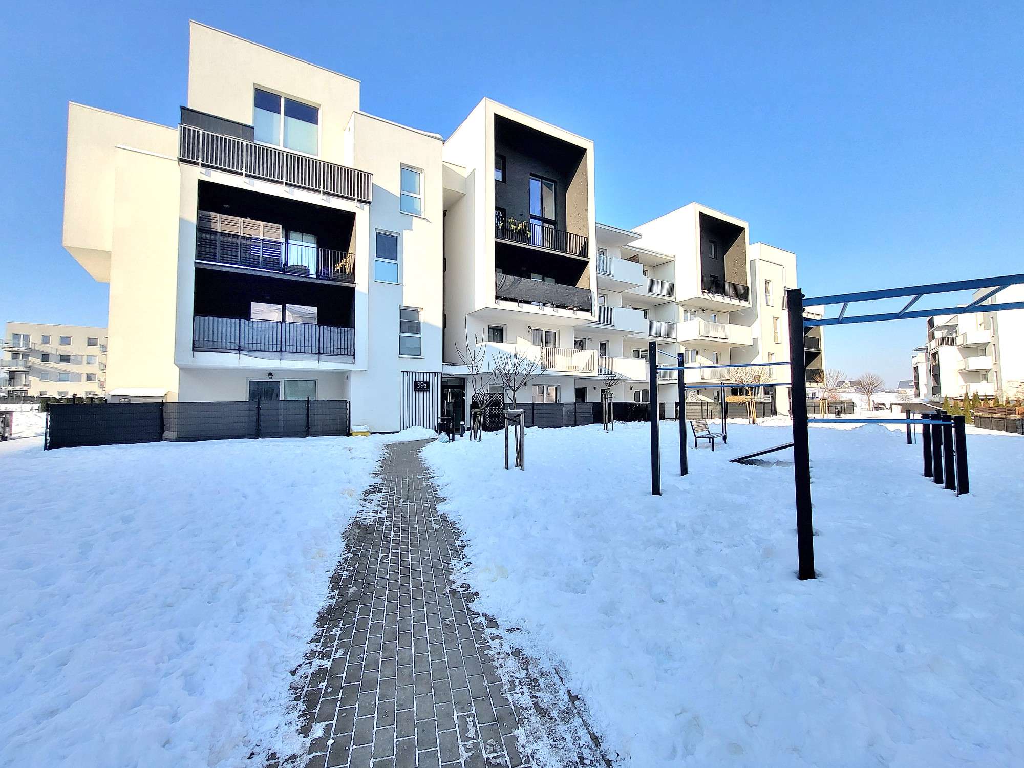 Nowoczesne monitorowane osiedle w niskiej zabudowie. Budynek wbudowany w 2017 roku. Nowoczesna bryła. Klatka schodowa zabezpieczona domofonem. Pod budynkiem miejsca postojowe. Budynek wyposażony w cichobieżną windę.