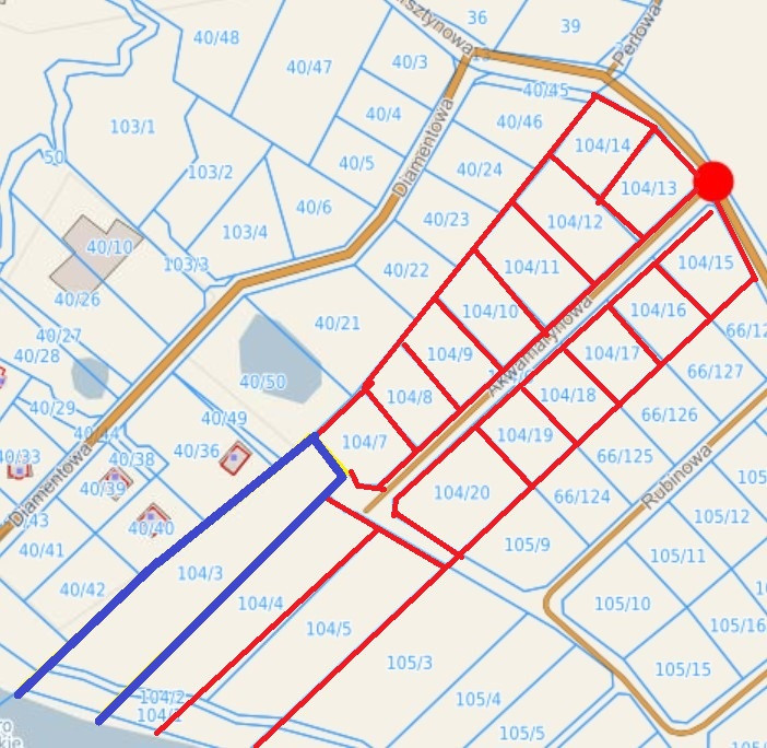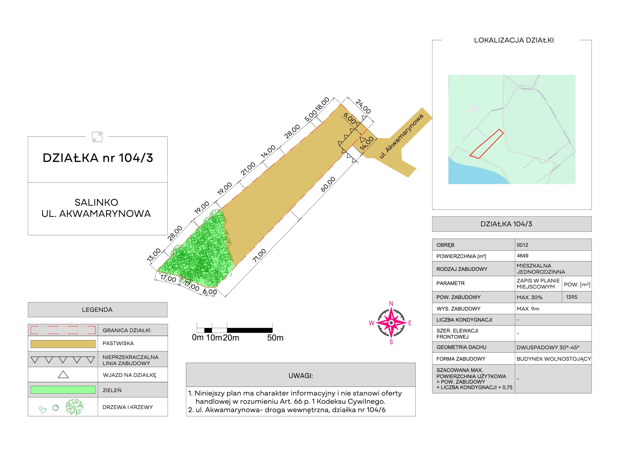 Działka jest w kształcie nierównego prostokąta o bokach około 40m x 164m x 25m x 155m położona w miejscowości Salinko przy ul. Akwamarynowej.