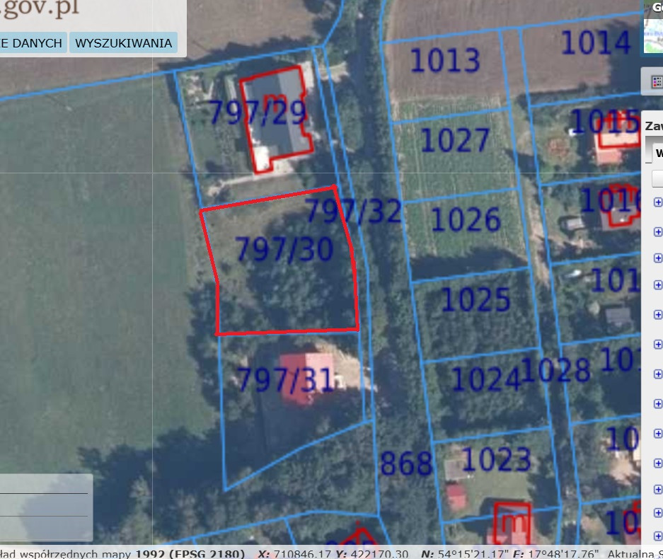 Działka numer 797/30 (ID geoportalu:220507_2.0005.797/30) o powierzchni 1194 m², o regularnym kształcie, z pochylonym terenem, częściowo porośnięta drzewami i krzewami. Z działki rozpościera się piękny widok na Jezioro Węgorzyno. Z obu stron znajdują się domy jednorodzinne.