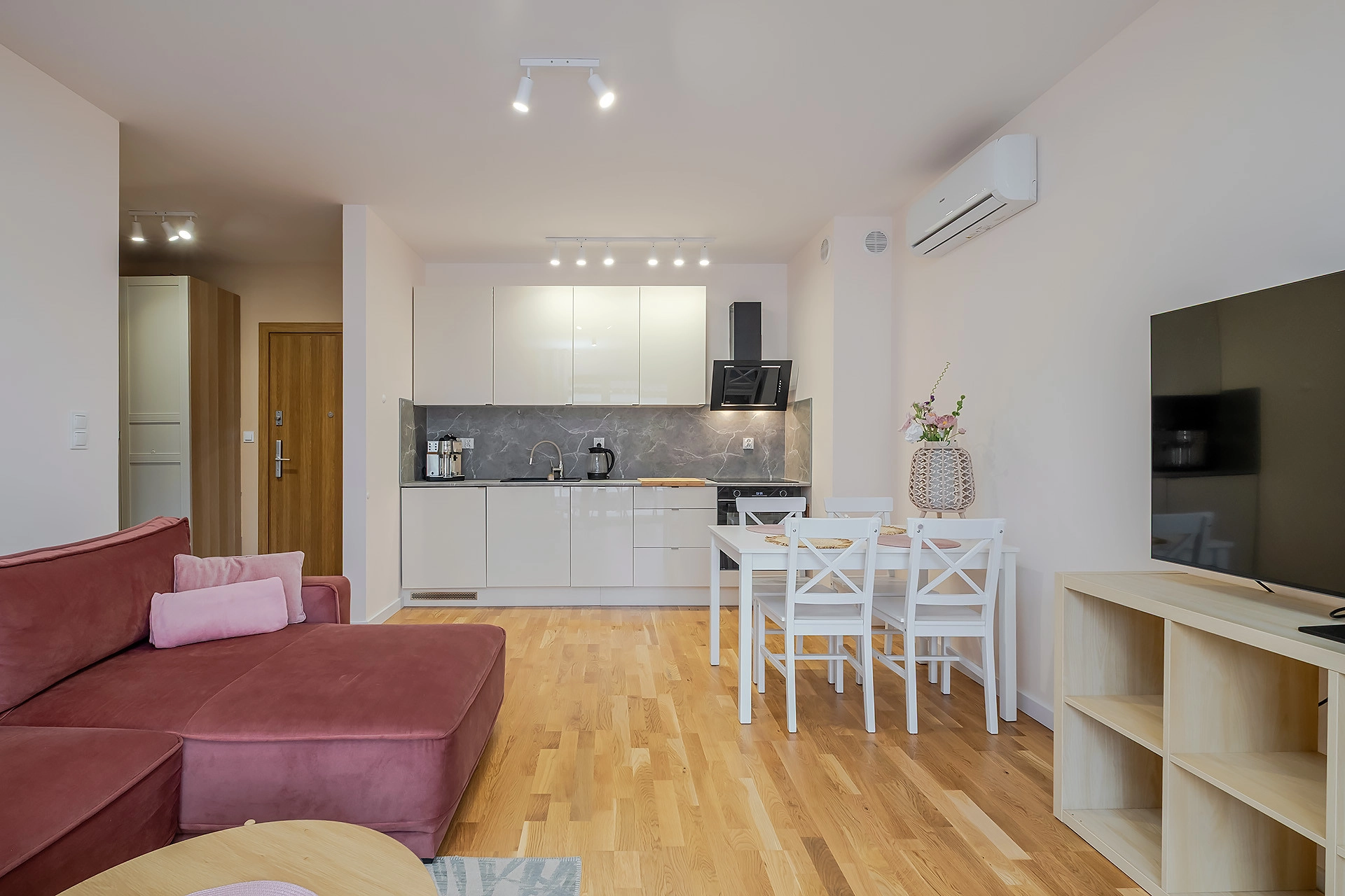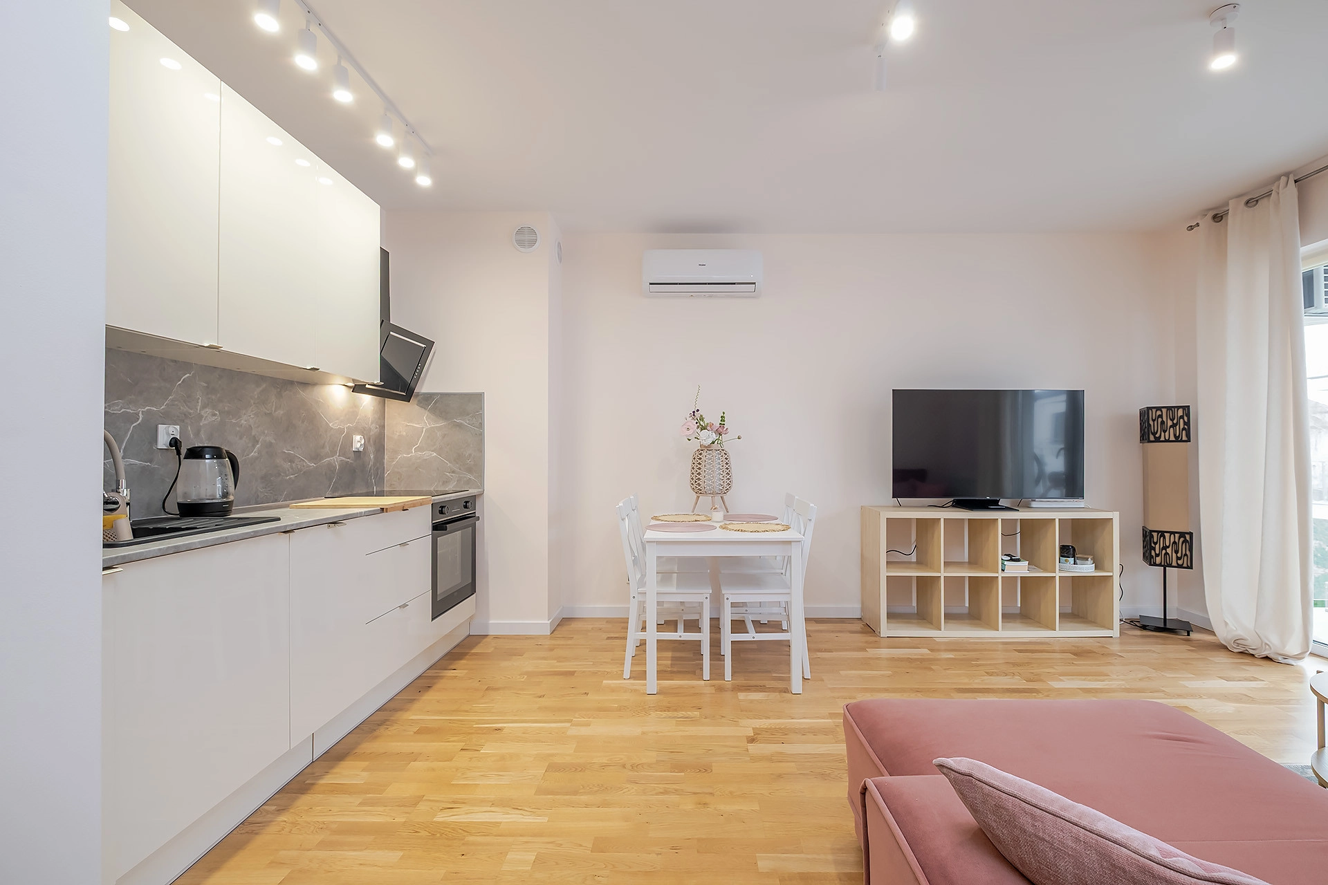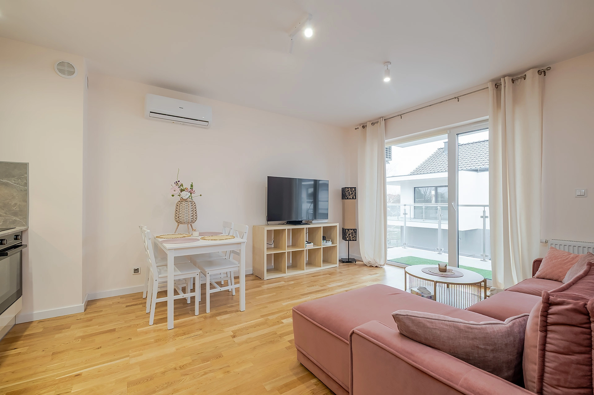 -Salonu z aneksem kuchennym i wyjściem na duży balkon