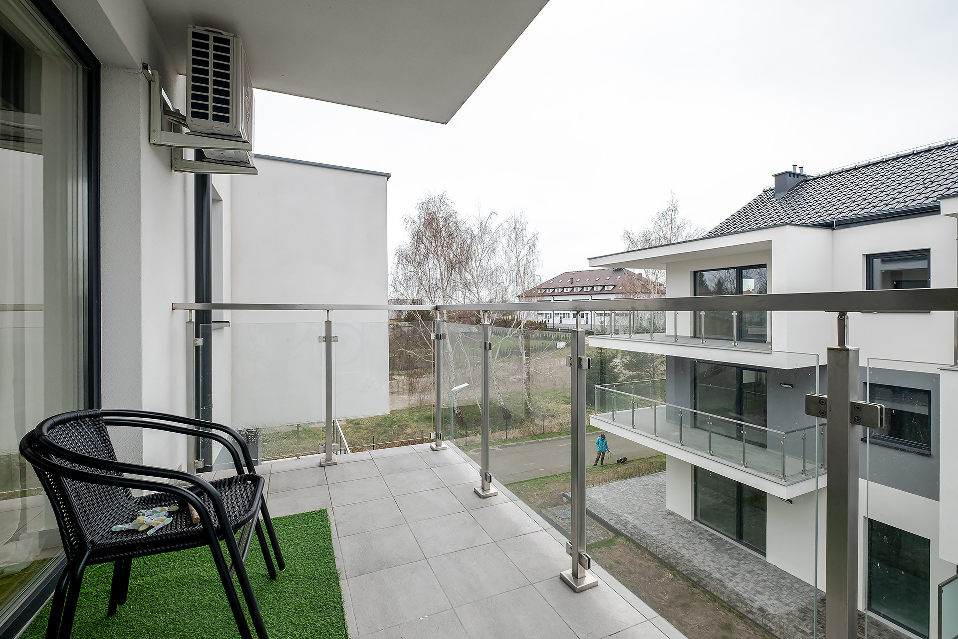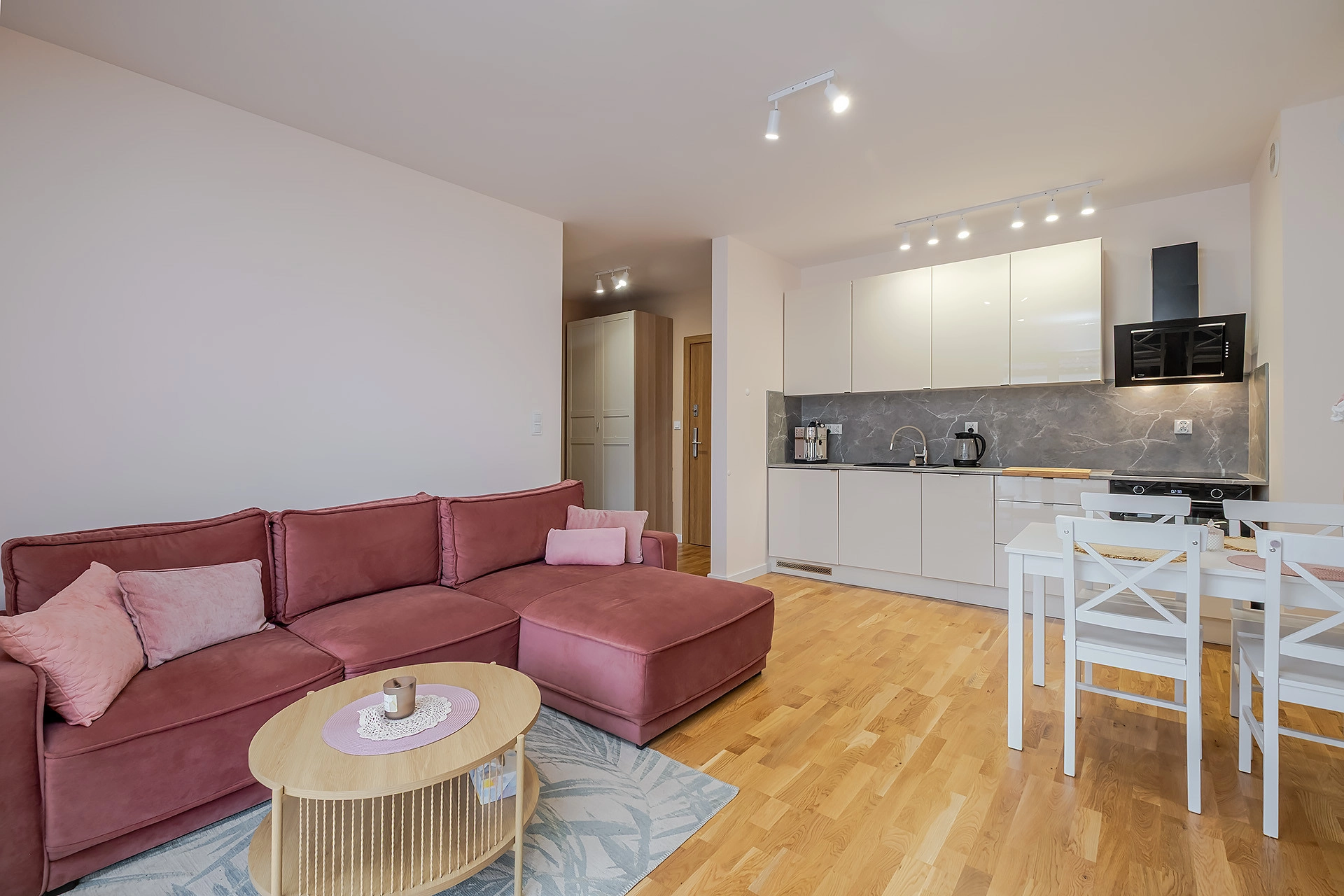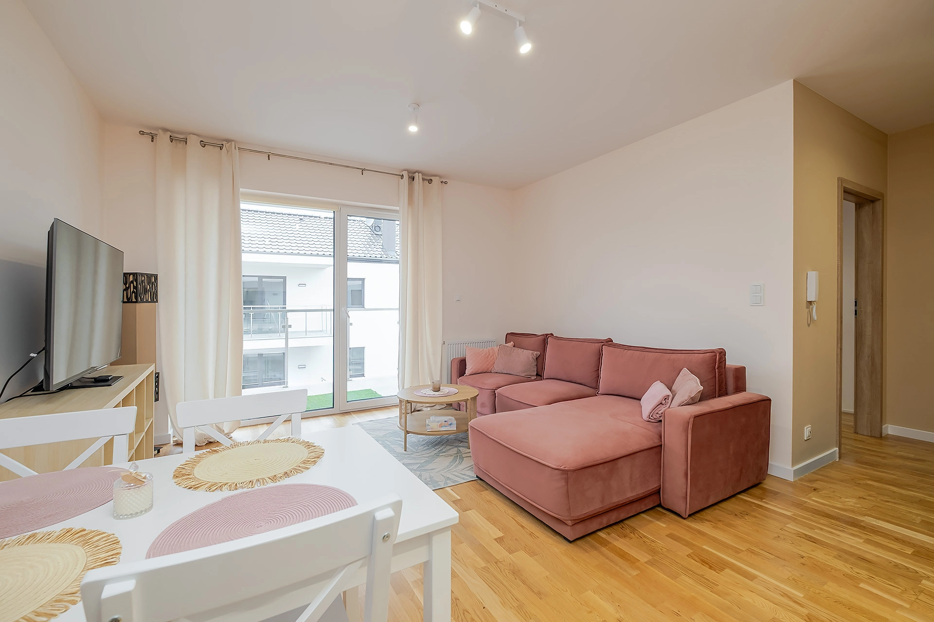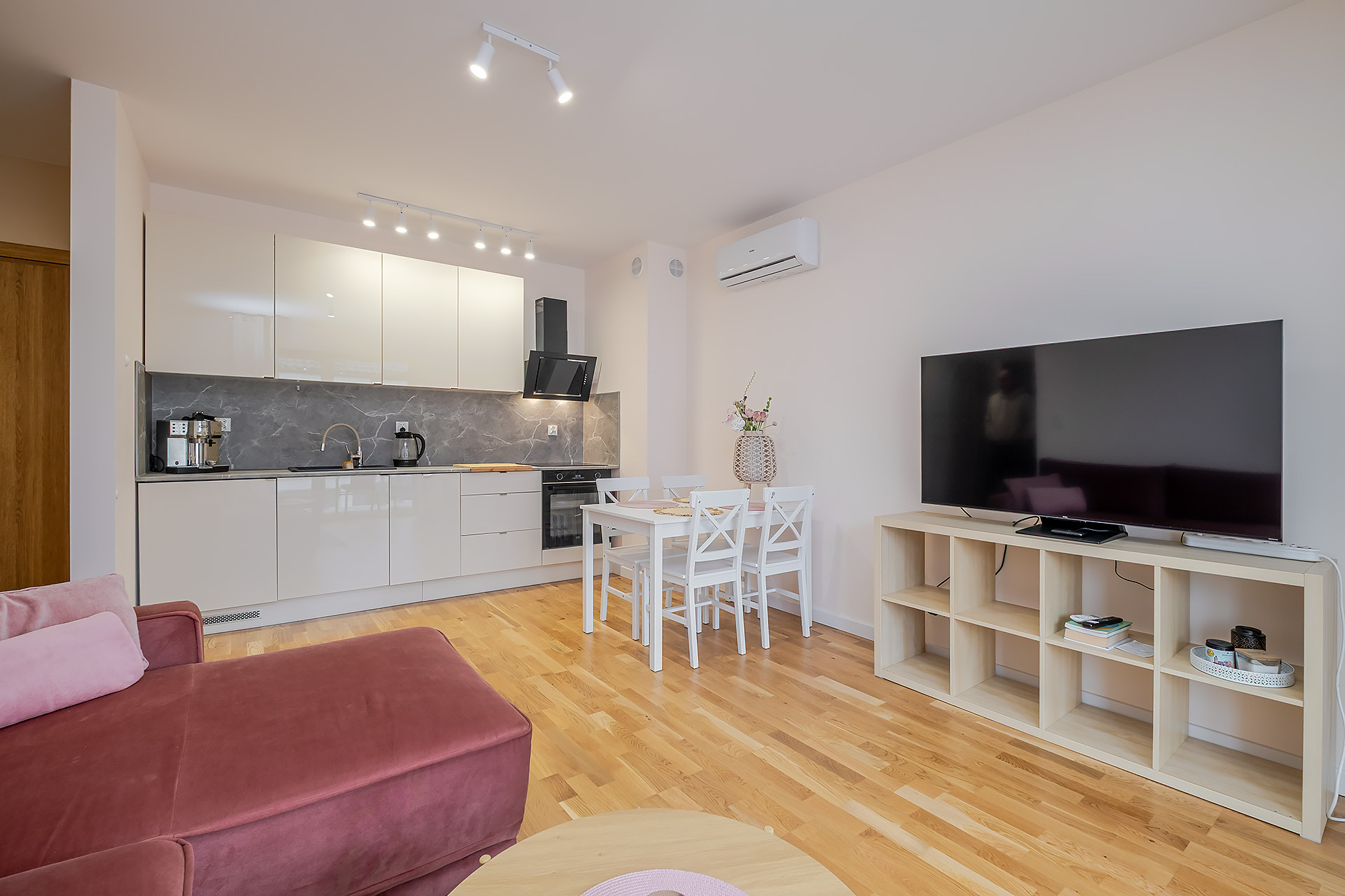 -Salonu z aneksem kuchennym i wyjściem na duży balkon