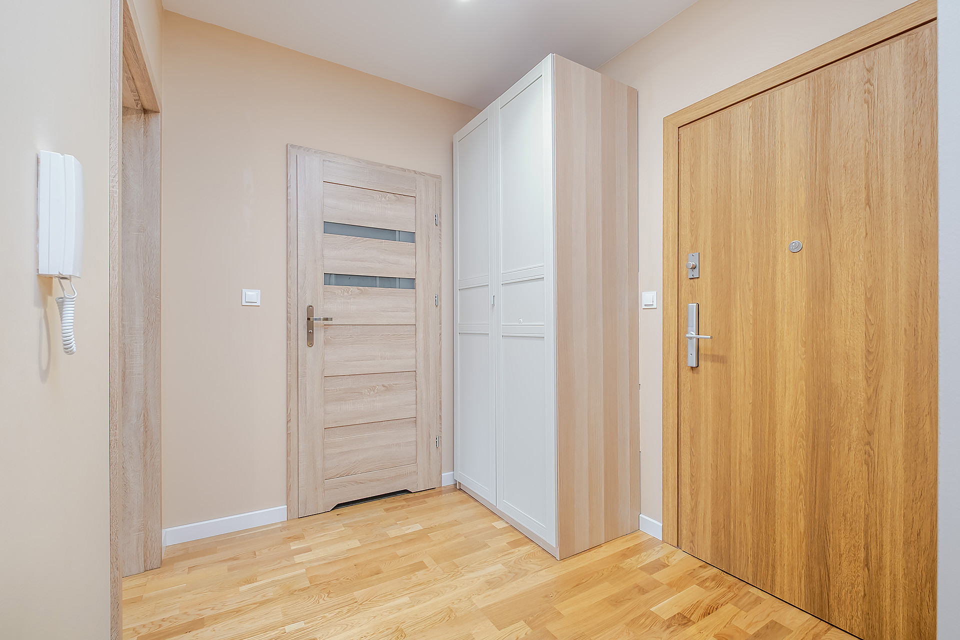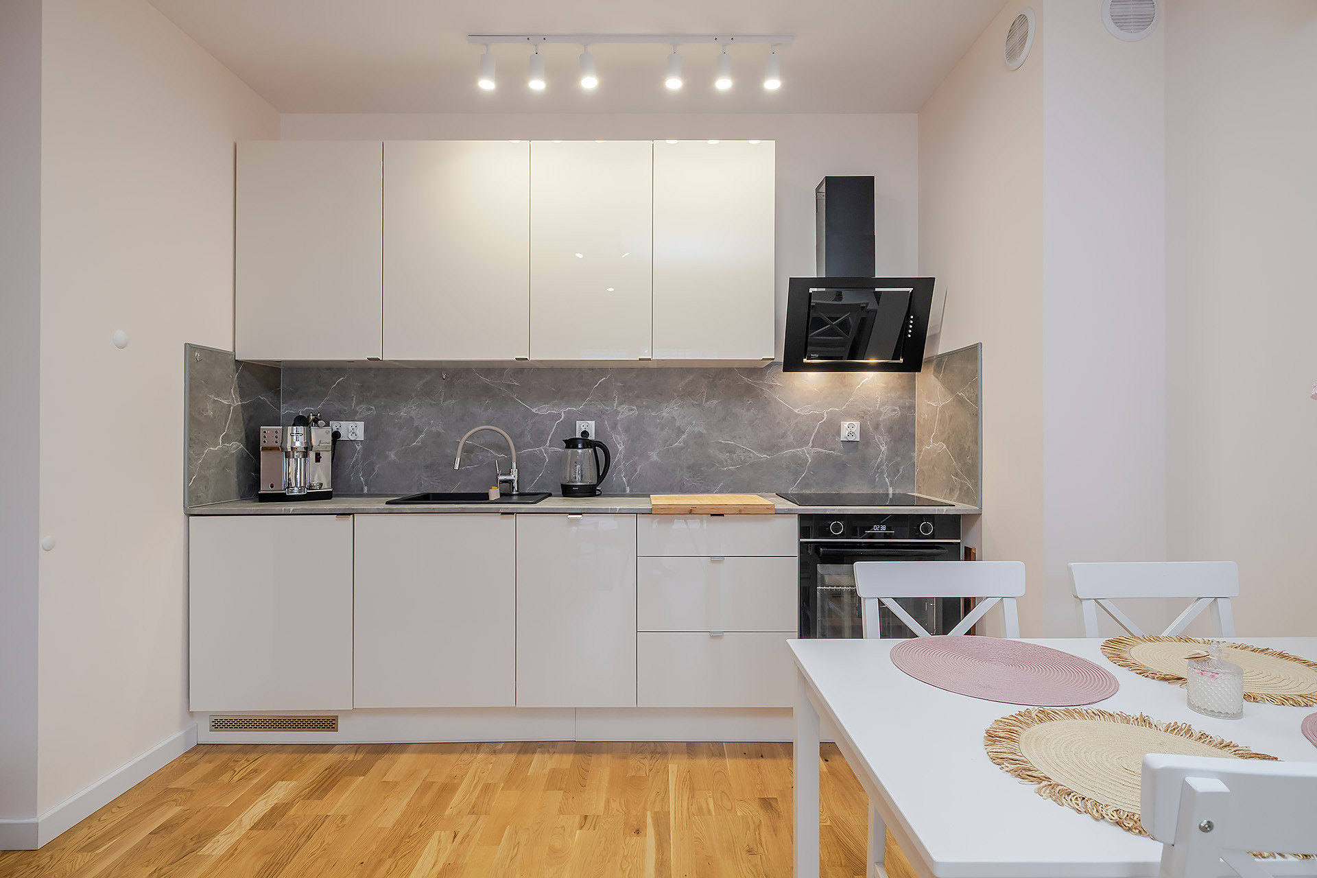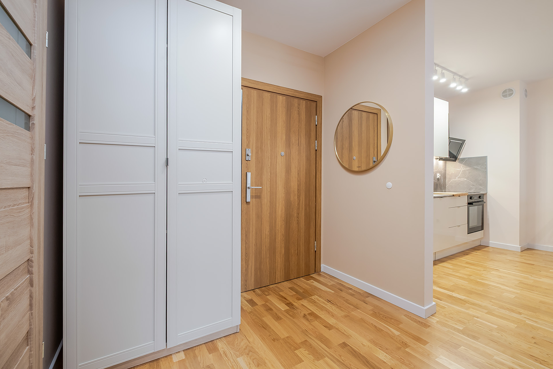 Mieszkanie wykończone jest w wysokim standardzie, z meblami w zabudowie wykonanymi na wymiar przez stolarza oraz wyposażone w klimatyzacją. Na podłodze w pokojach i holu znajduje się drewniana deska, a kuchnia jest w pełni wyposażona w sprzęt AGD (piekarnik, okap, płyta indukcyjna, lodówka, zmywarka).
