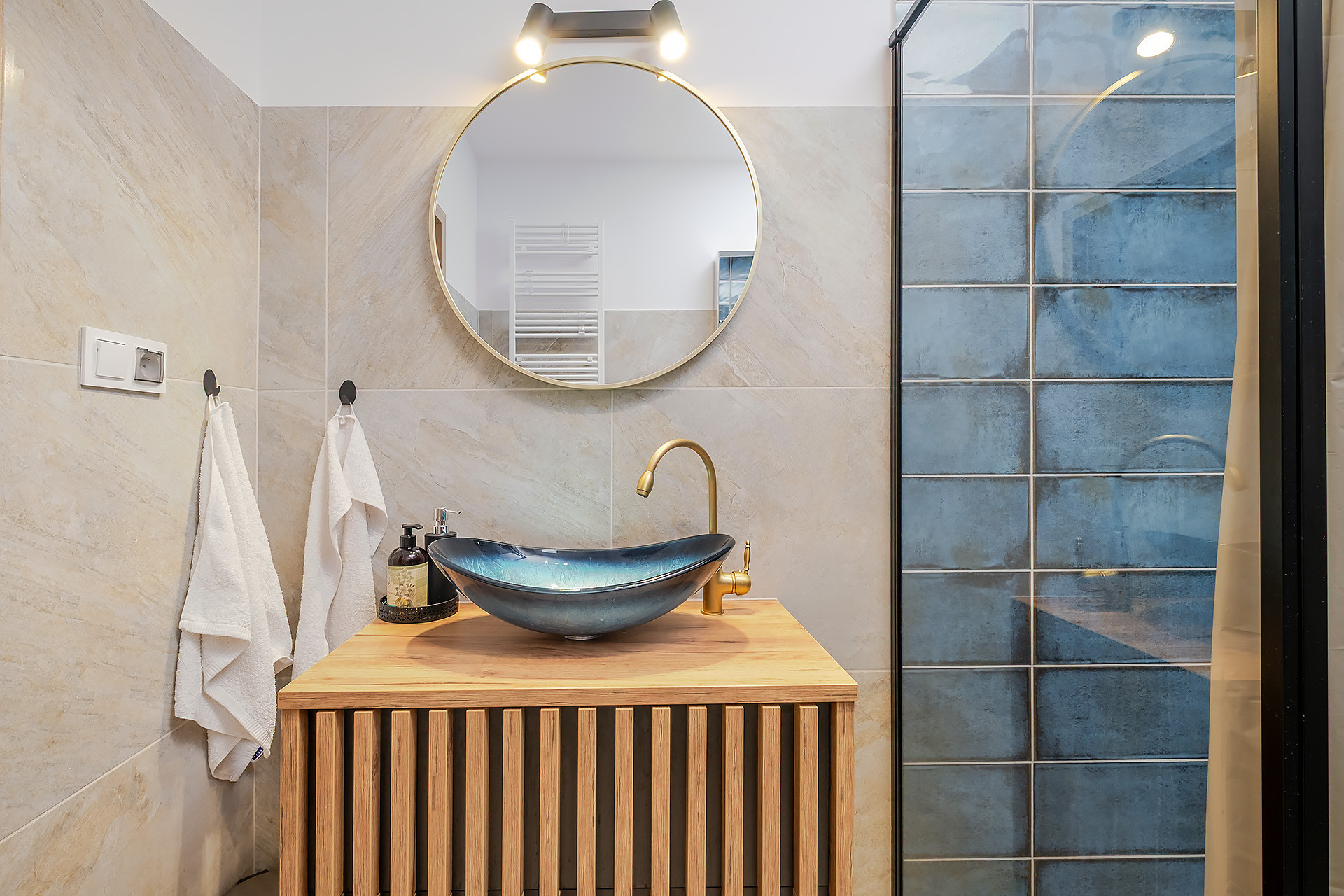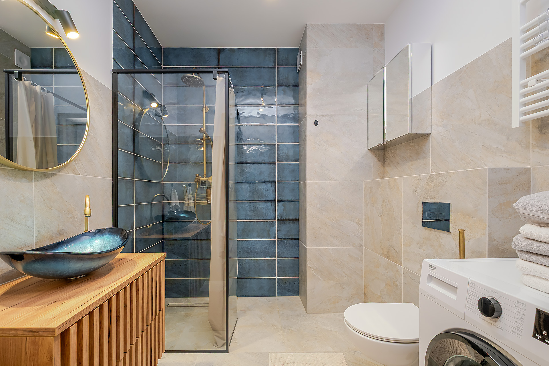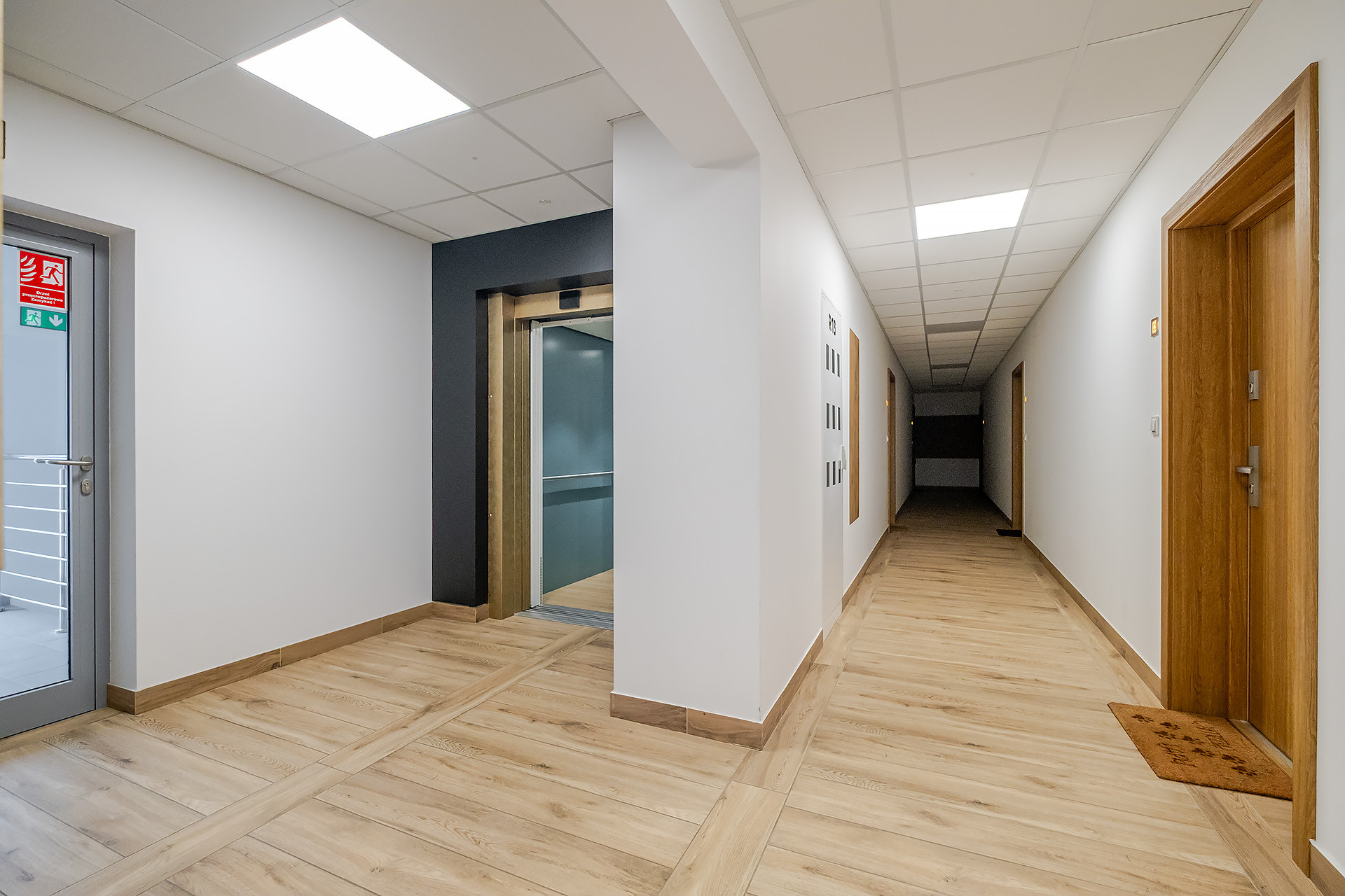 Mieszkanie wykończone jest w wysokim standardzie, z meblami w zabudowie wykonanymi na wymiar przez stolarza oraz wyposażone w klimatyzacją. Na podłodze w pokojach i holu znajduje się drewniana deska, a kuchnia jest w pełni wyposażona w sprzęt AGD (piekarnik, okap, płyta indukcyjna, lodówka, zmywarka).